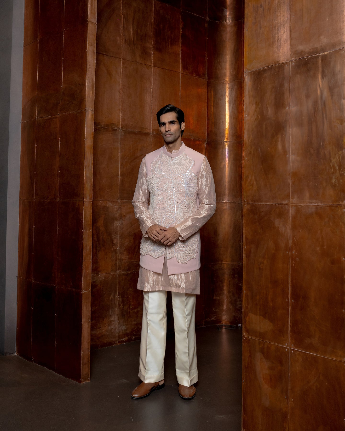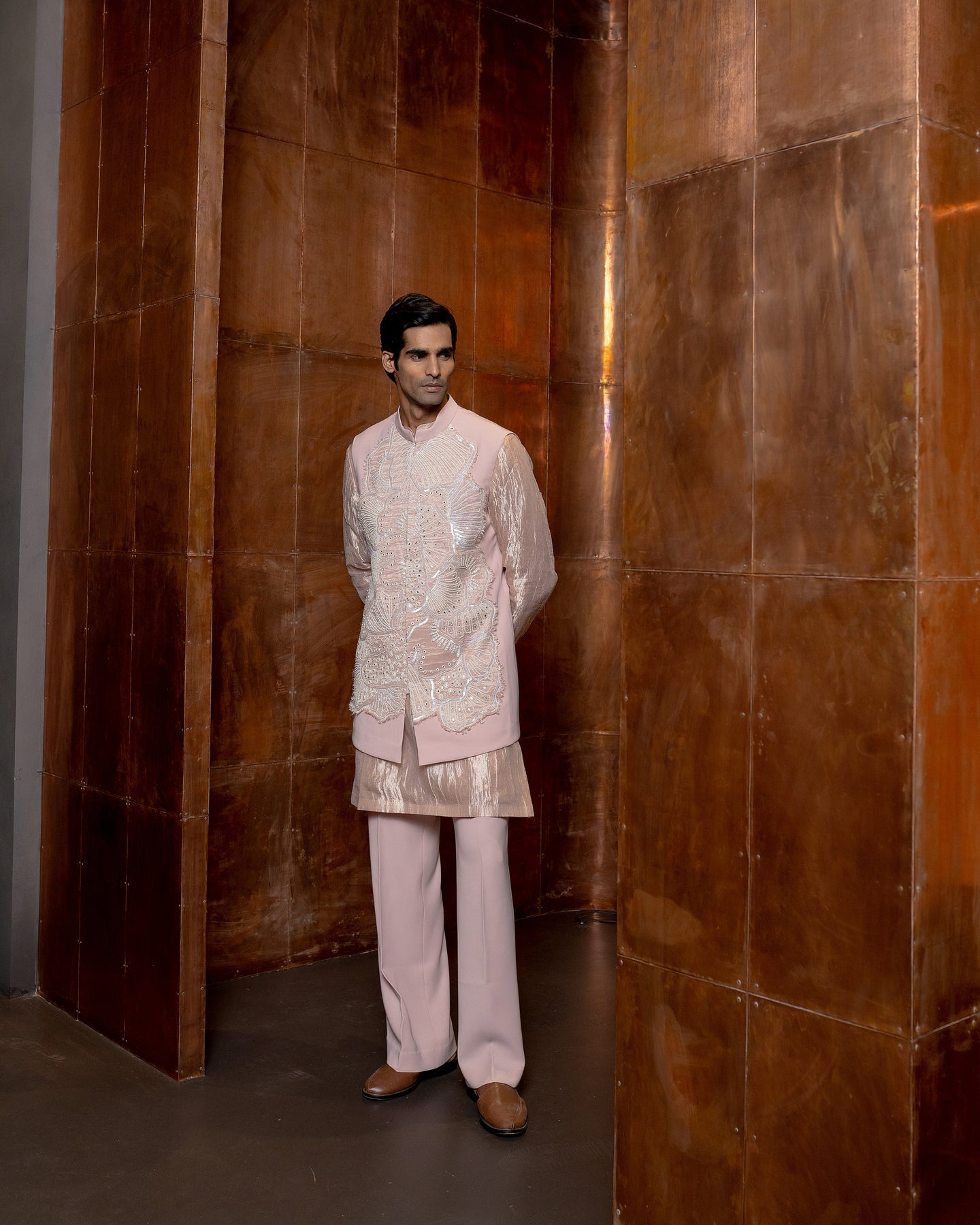 Sea Coral Placement Bandi paired with Tissue kurta and Plain Pants