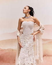 DUO TONE ASSORTED LEAVES FISHCUT LAYERED SKIRT WITH CHECKS CORSET AND DUPATTA