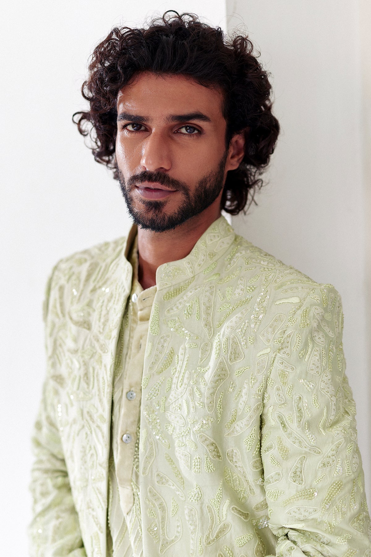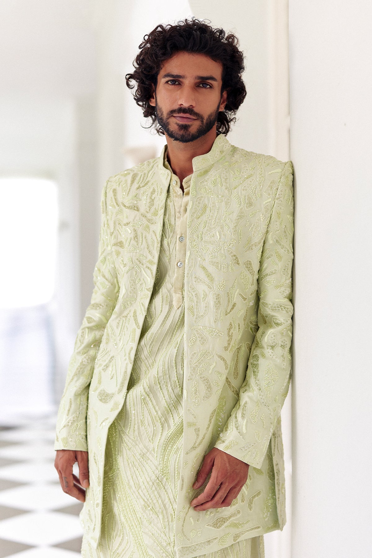 Water embroidered sherwani paired with lines embroidered kurta and Plain pants