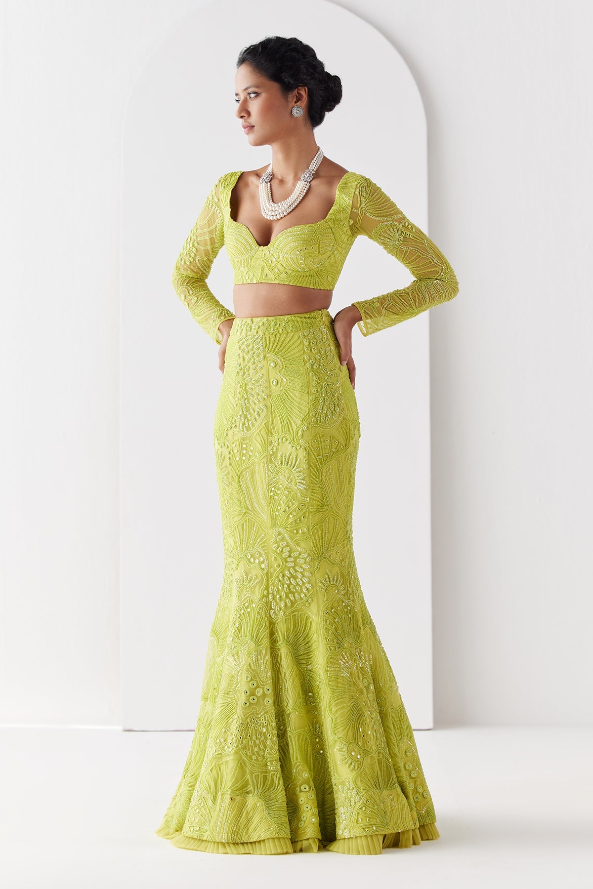 Sea coral mermaid lehanga with full sleeve blouse and cutwork dupatta