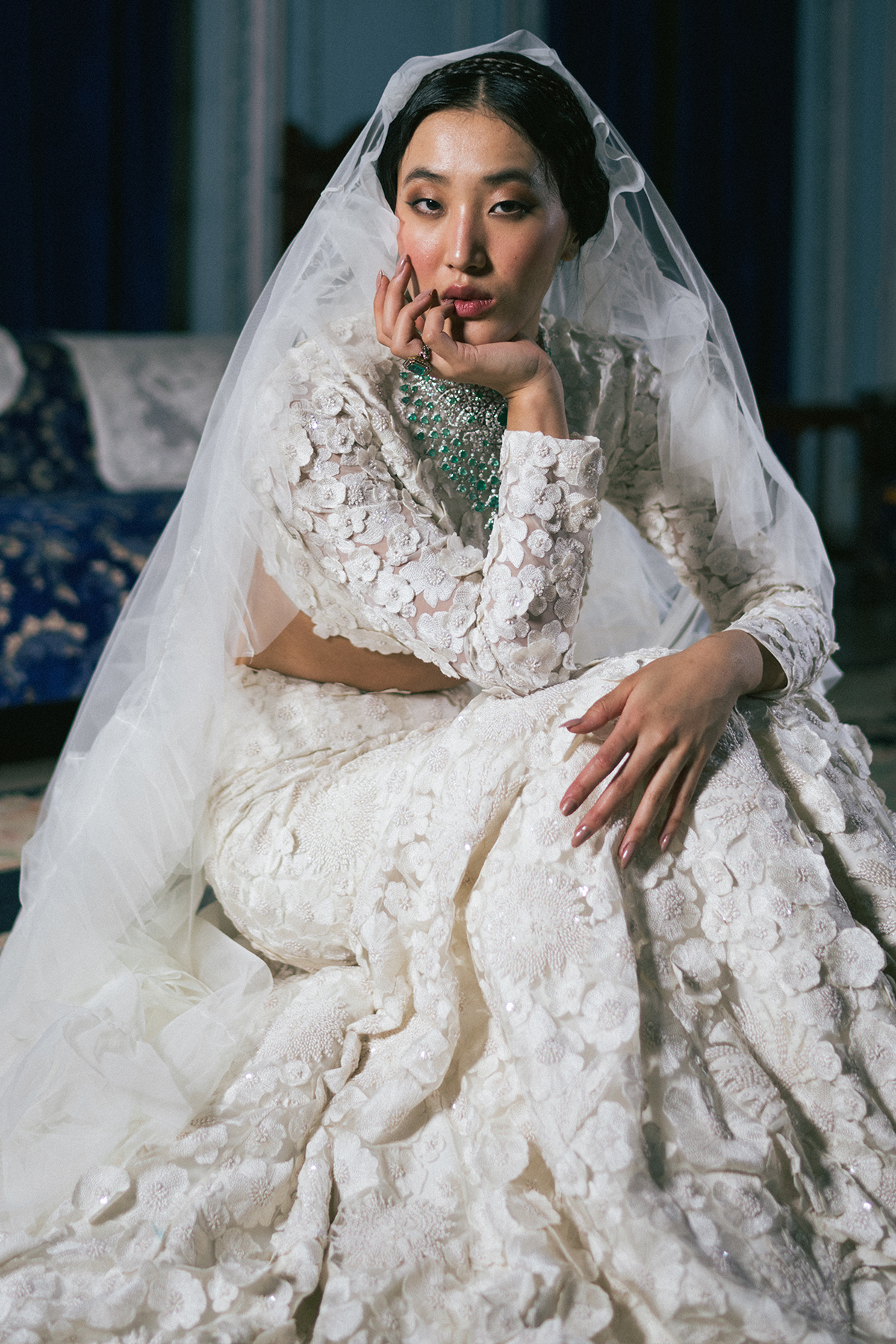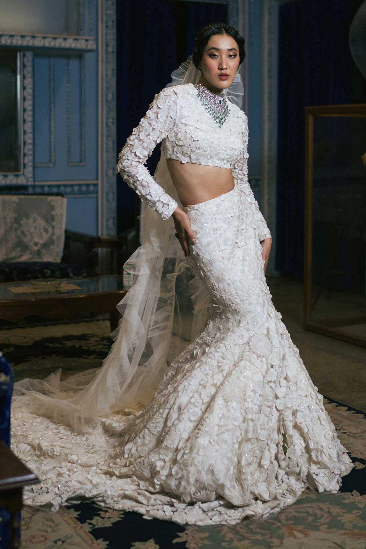 Decadent Varsha mermaid lehanga with trail details.