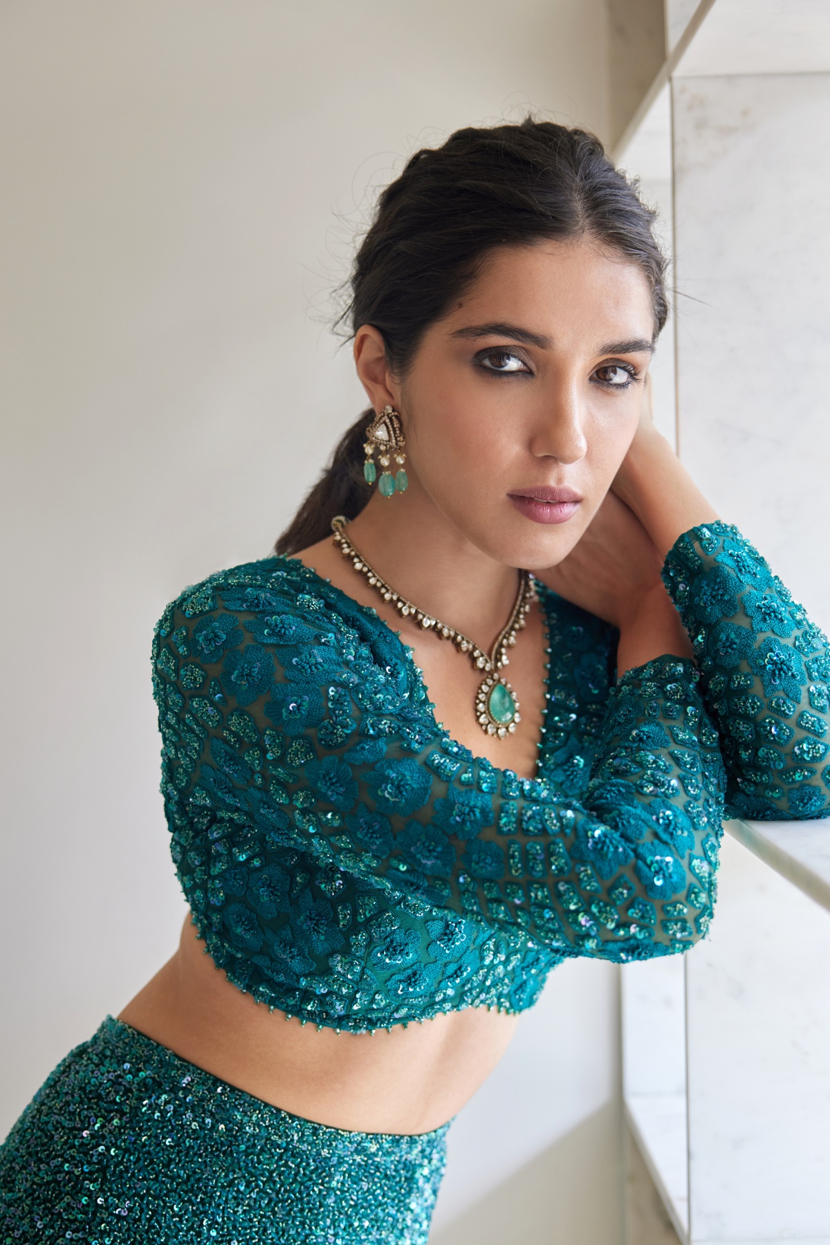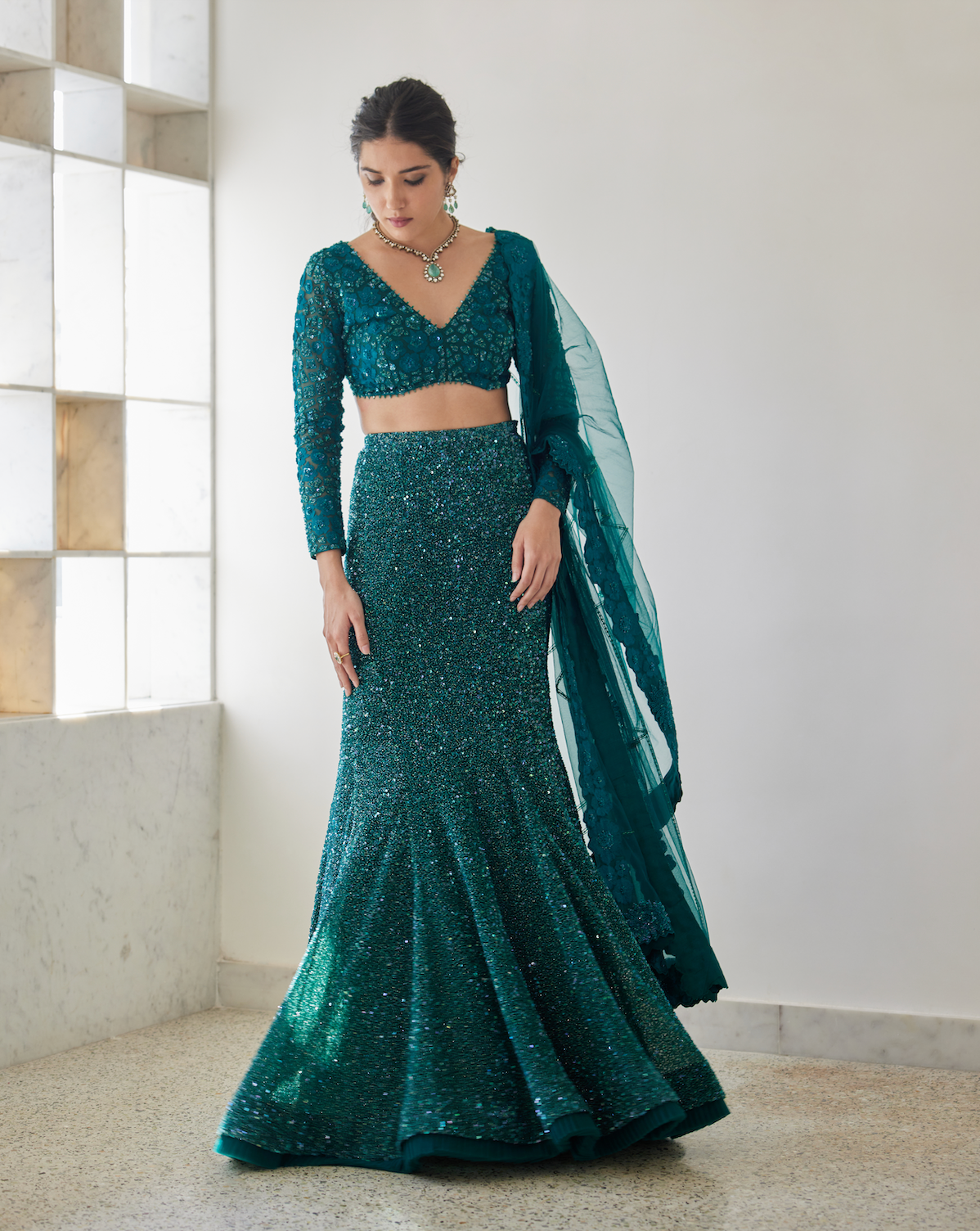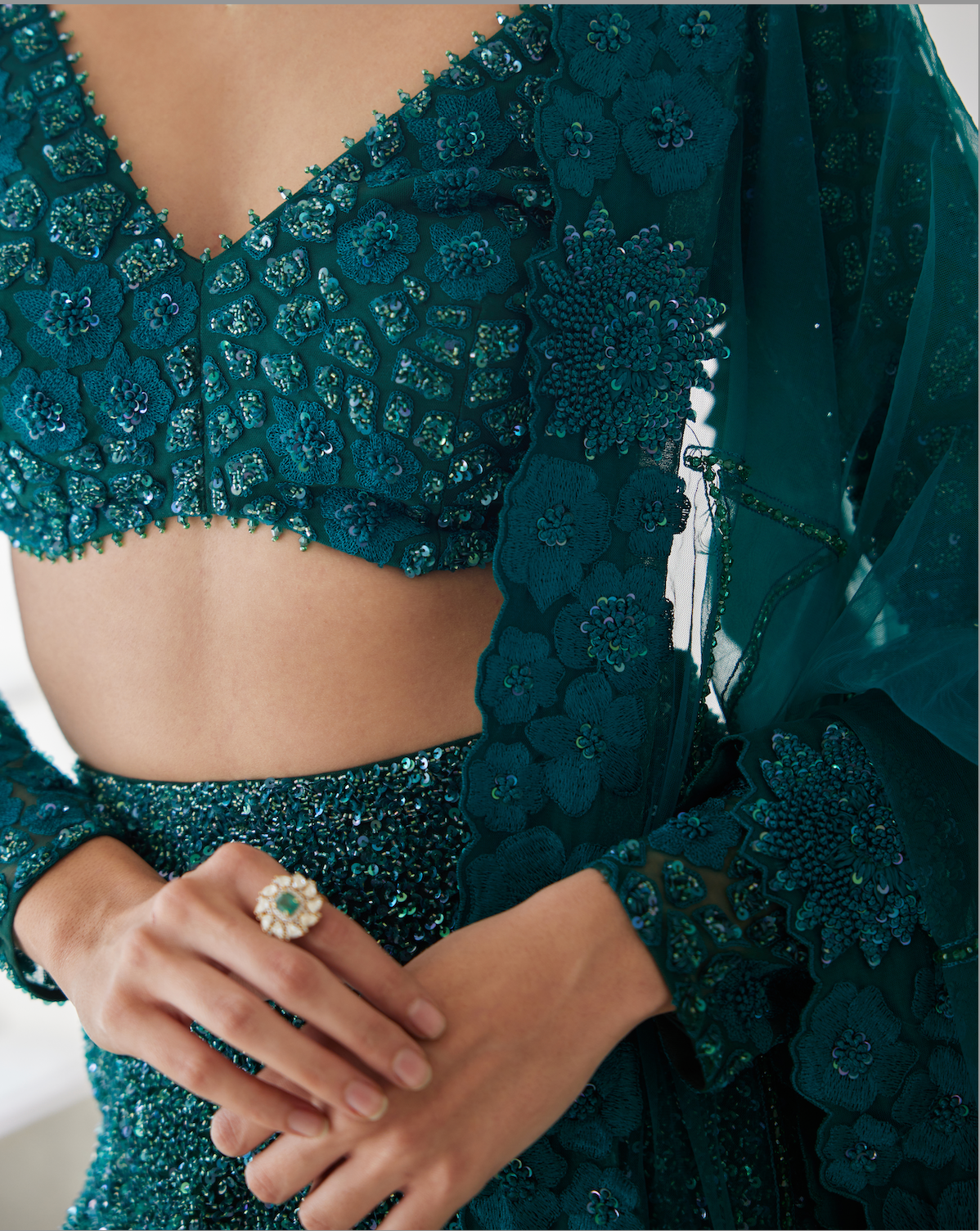 Encrusted gitch embroidered lehenga paired with floral and tree bark embroidered blouse and dupattaÂ