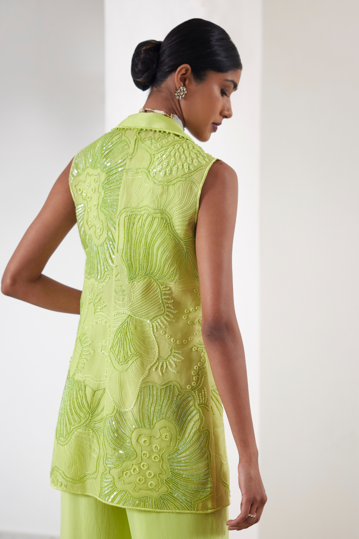 Sea coral blazer paired with sea coral waistcoat and plain pants