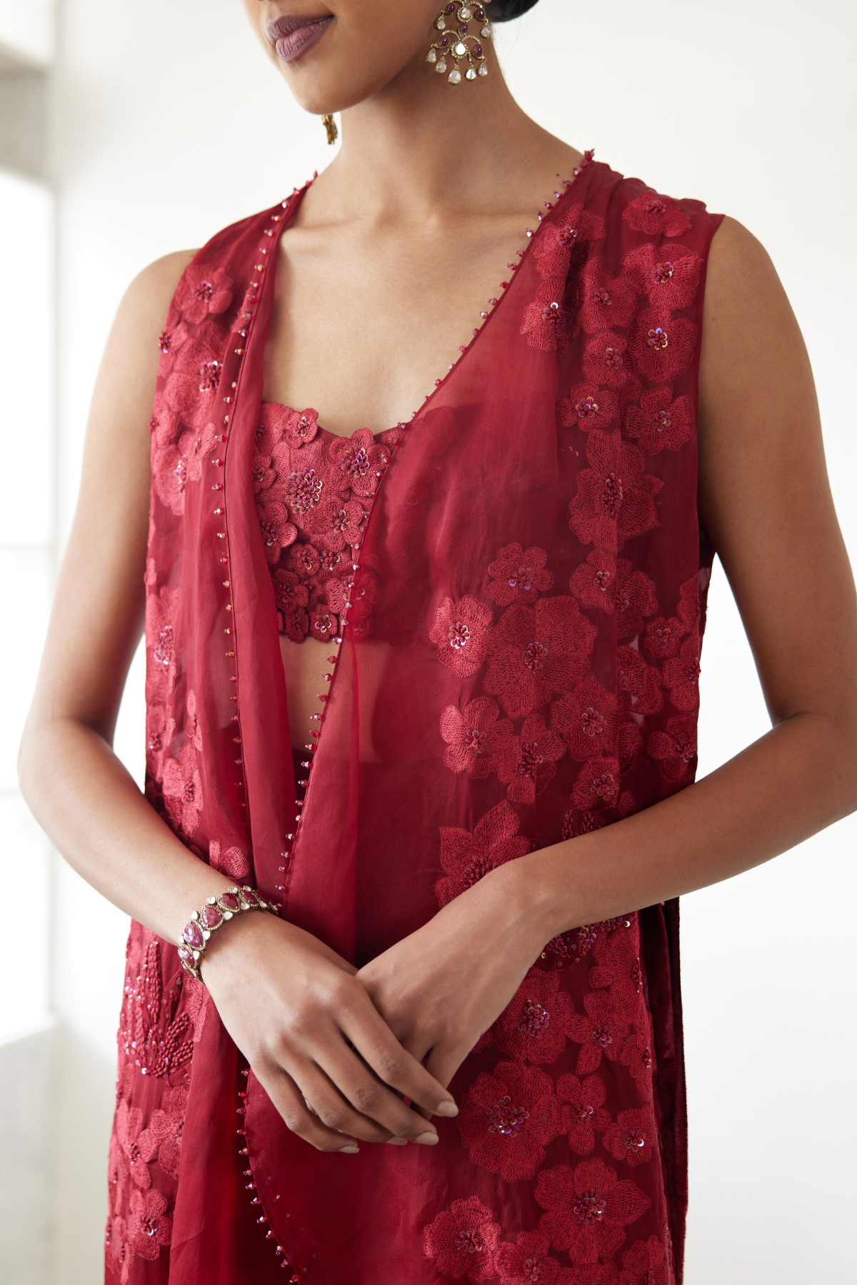 Floral embroidered curve jacket paired with floral bustier and floating border pants
