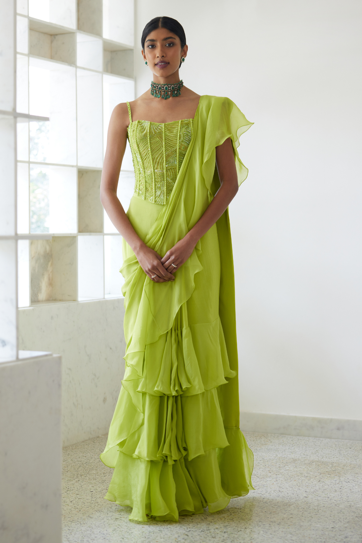 - Sari - Natural crepe and Organza; Corset Blouse - Tulle
