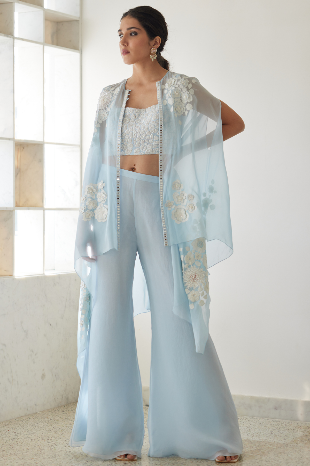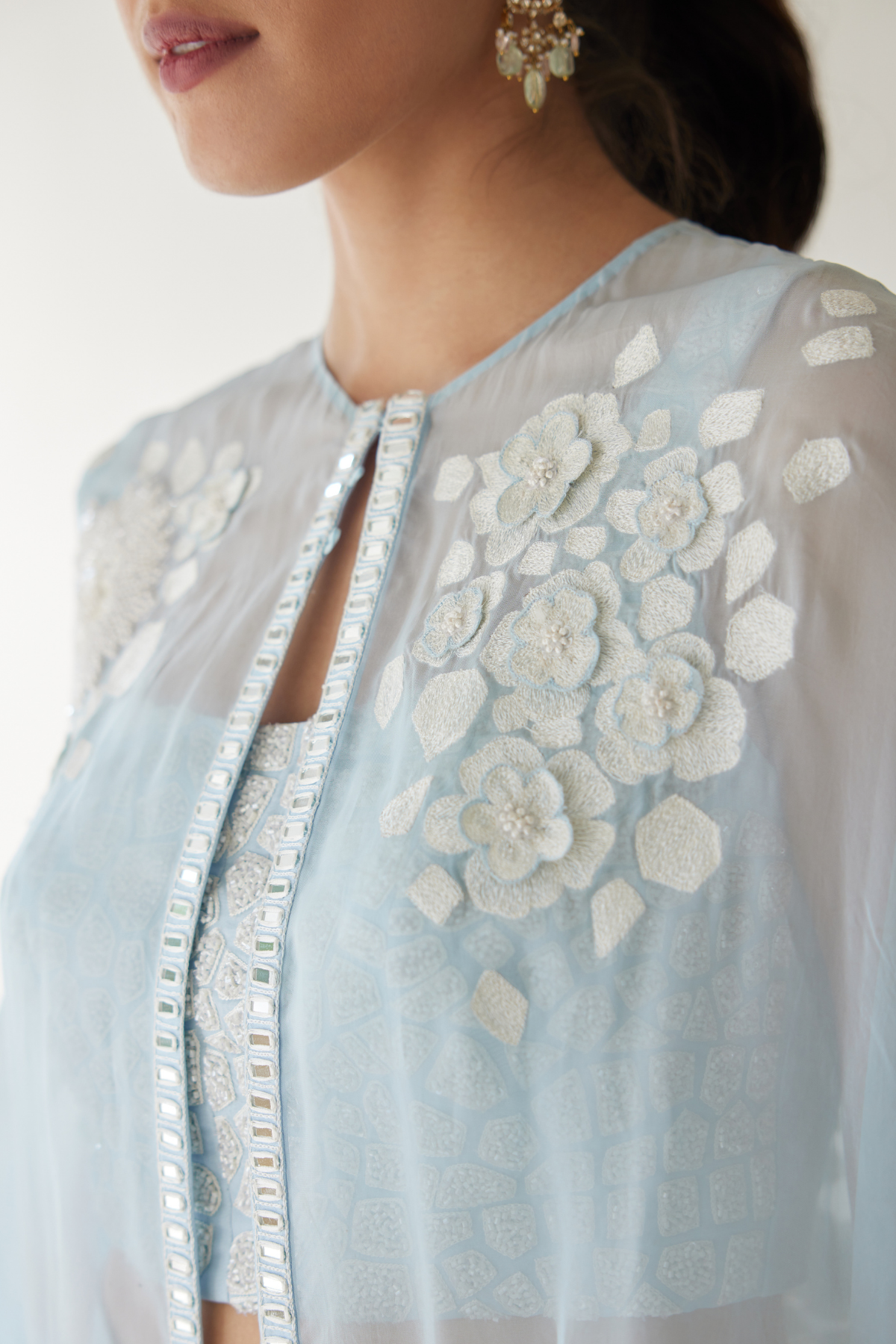 Floral bunches cape with Hexagon embroidery croptop and plain organza pants