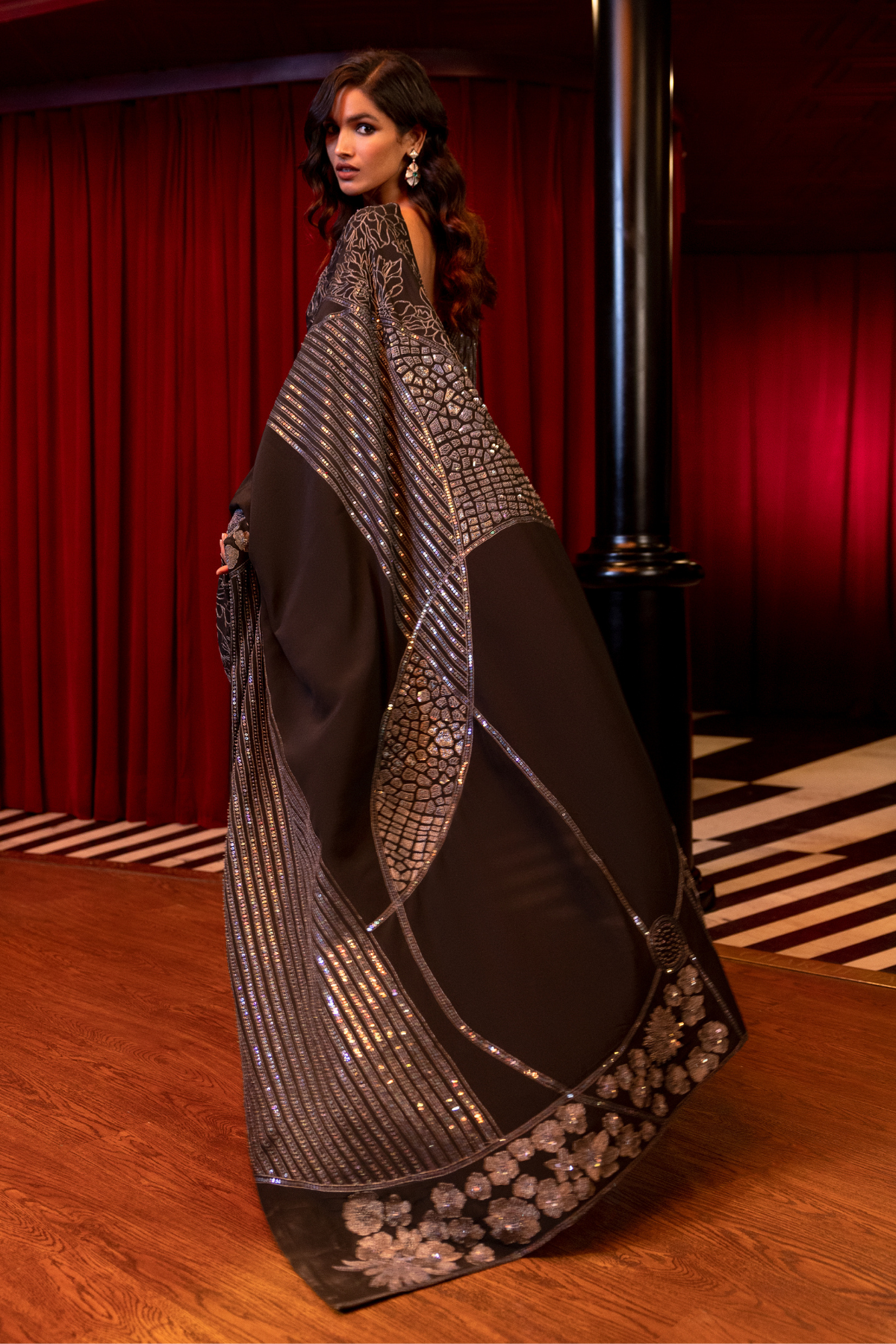 Charcoal grey art deco embroidered sari paired with one-shoulder lines blouse