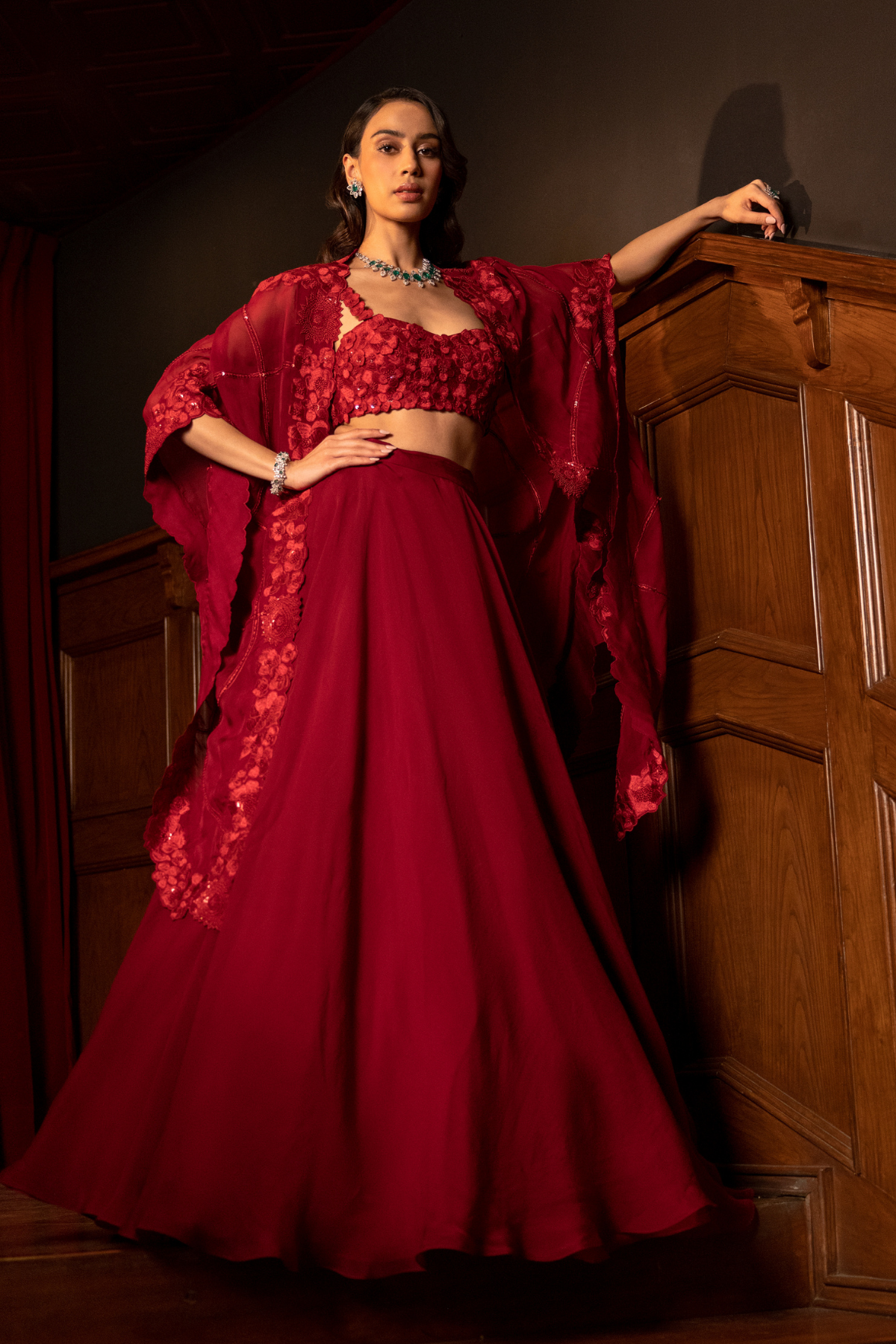 - Cape: Organza, Skirt: Organza, Bustier: Chanderi