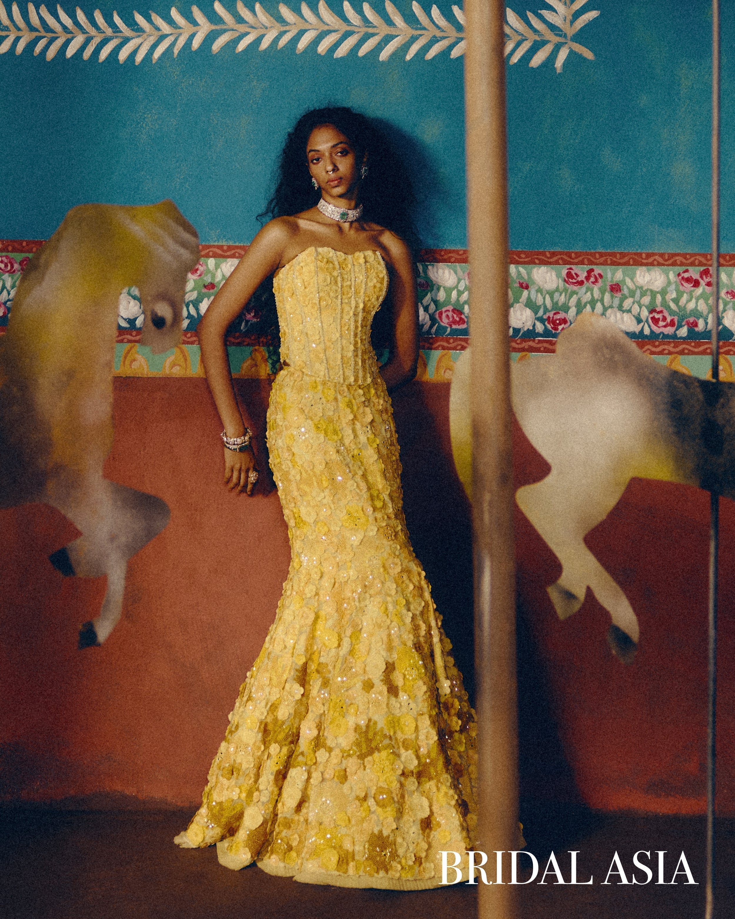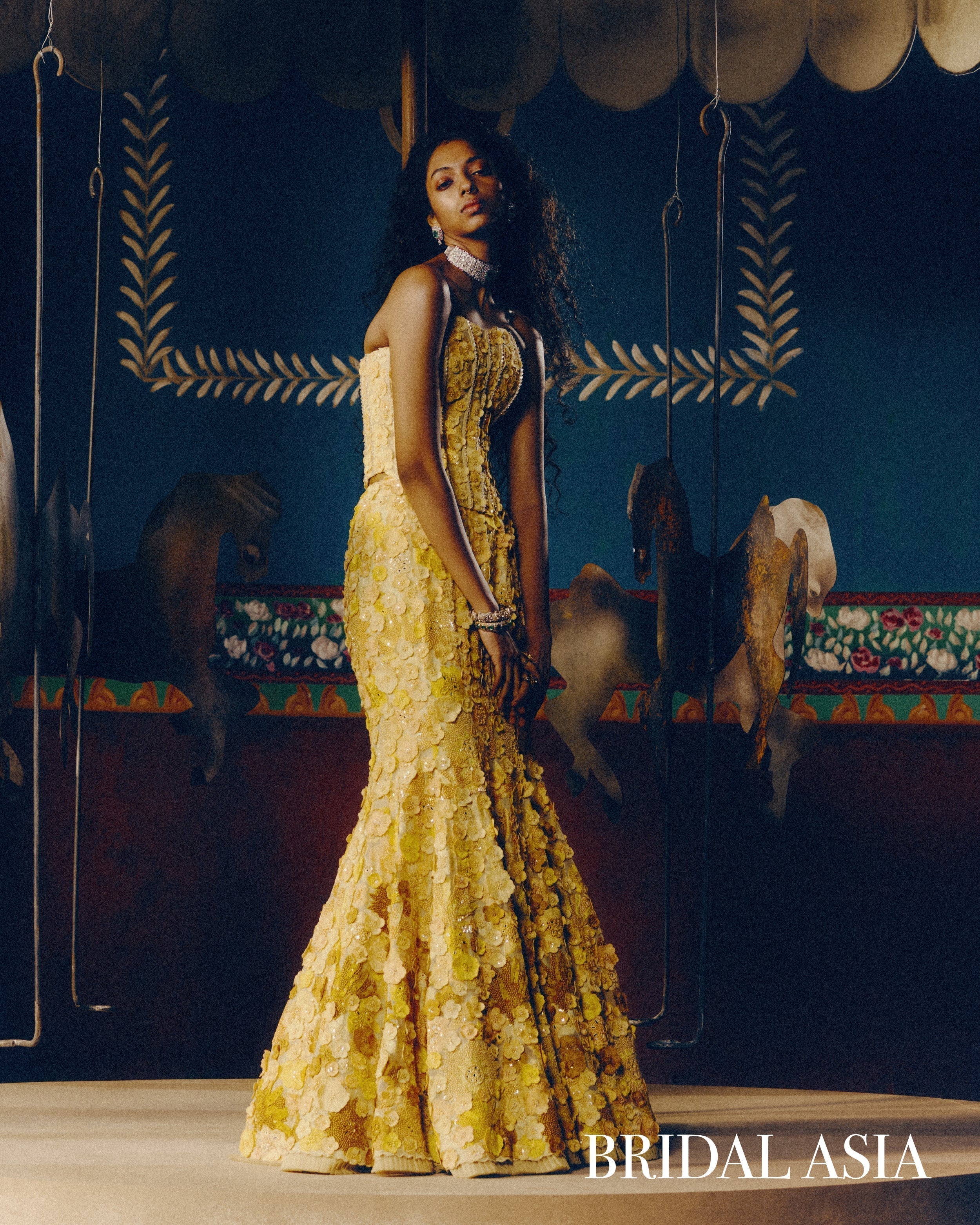DENSE 3D FLORAL EMBROIDERED MERMAID LEHENGA PAIRED WITH FLORAL CORSET AND DUPATTA