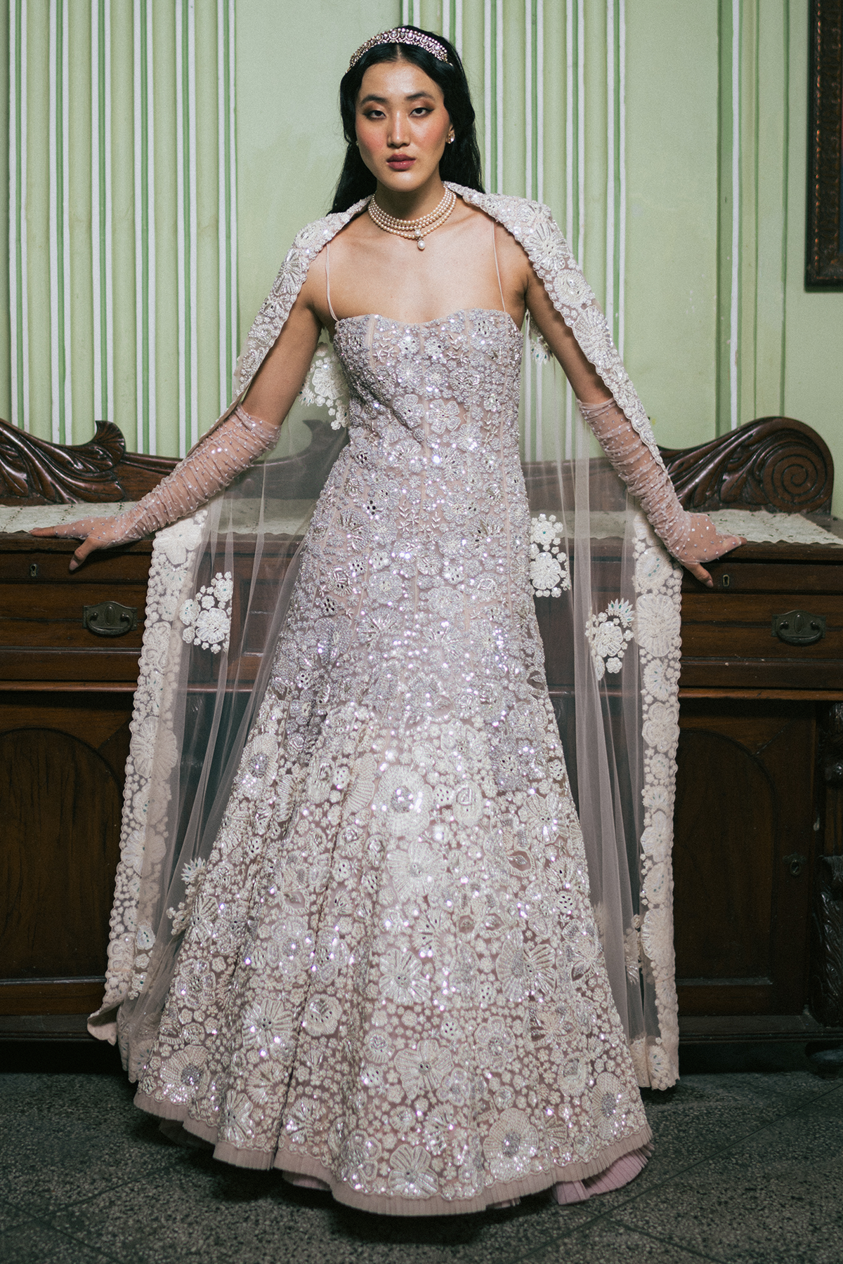 PRECIOUS FLOWERS SILVER AND WHITE EMBROIDERED GOWN