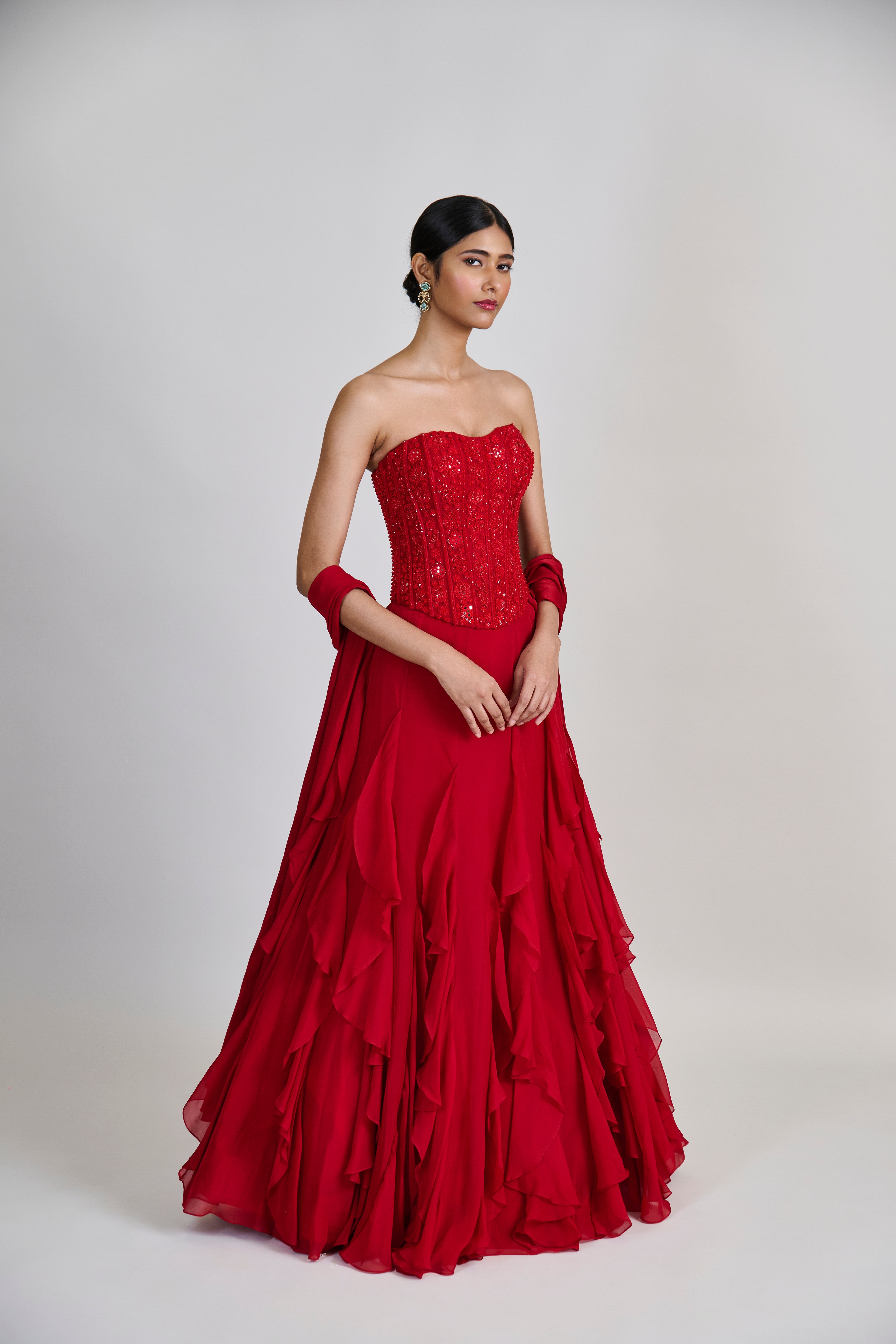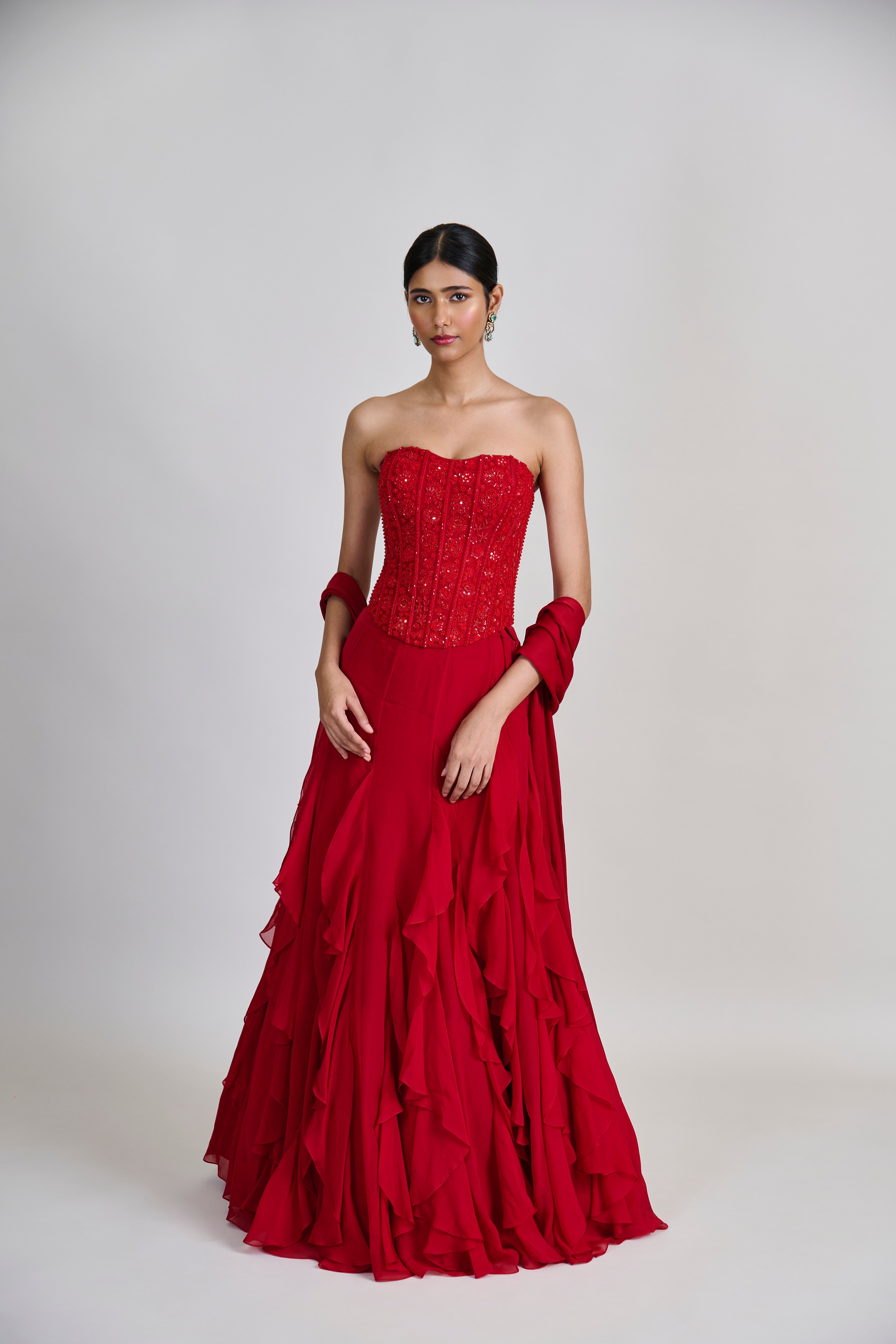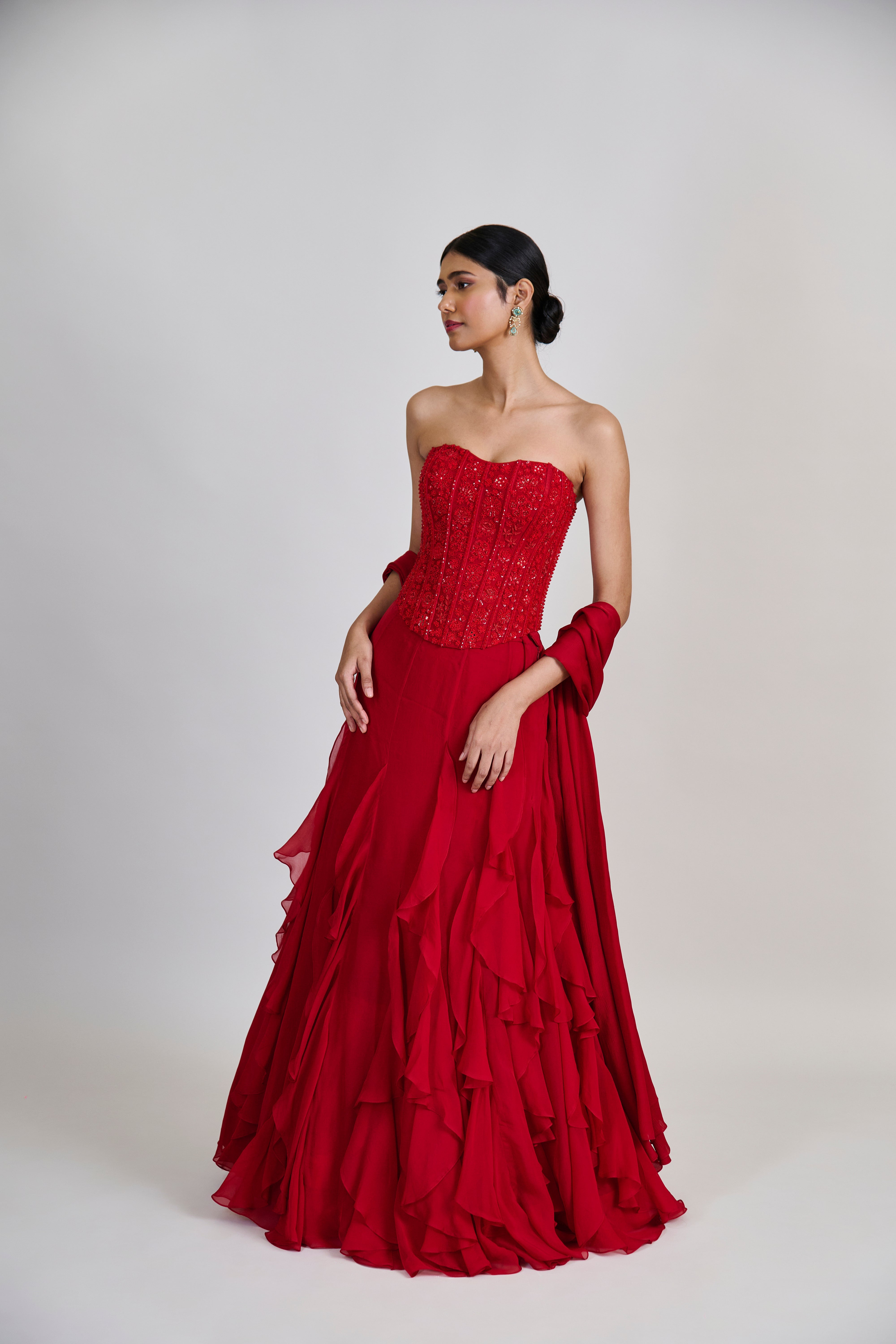 RUFFLE A-LINE SKIRT WITH TONAL EMBROIDERED CORSET AND STOLE
