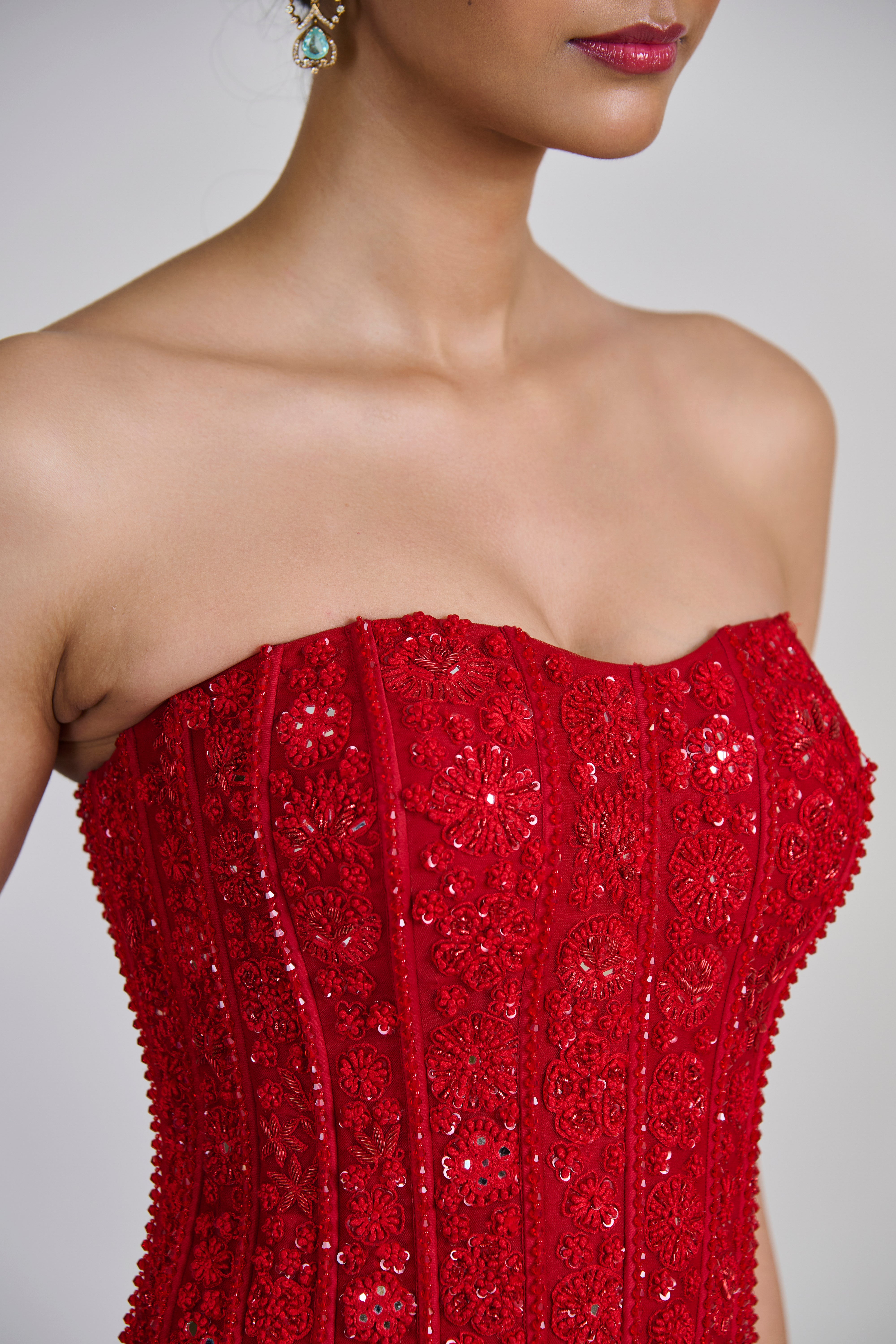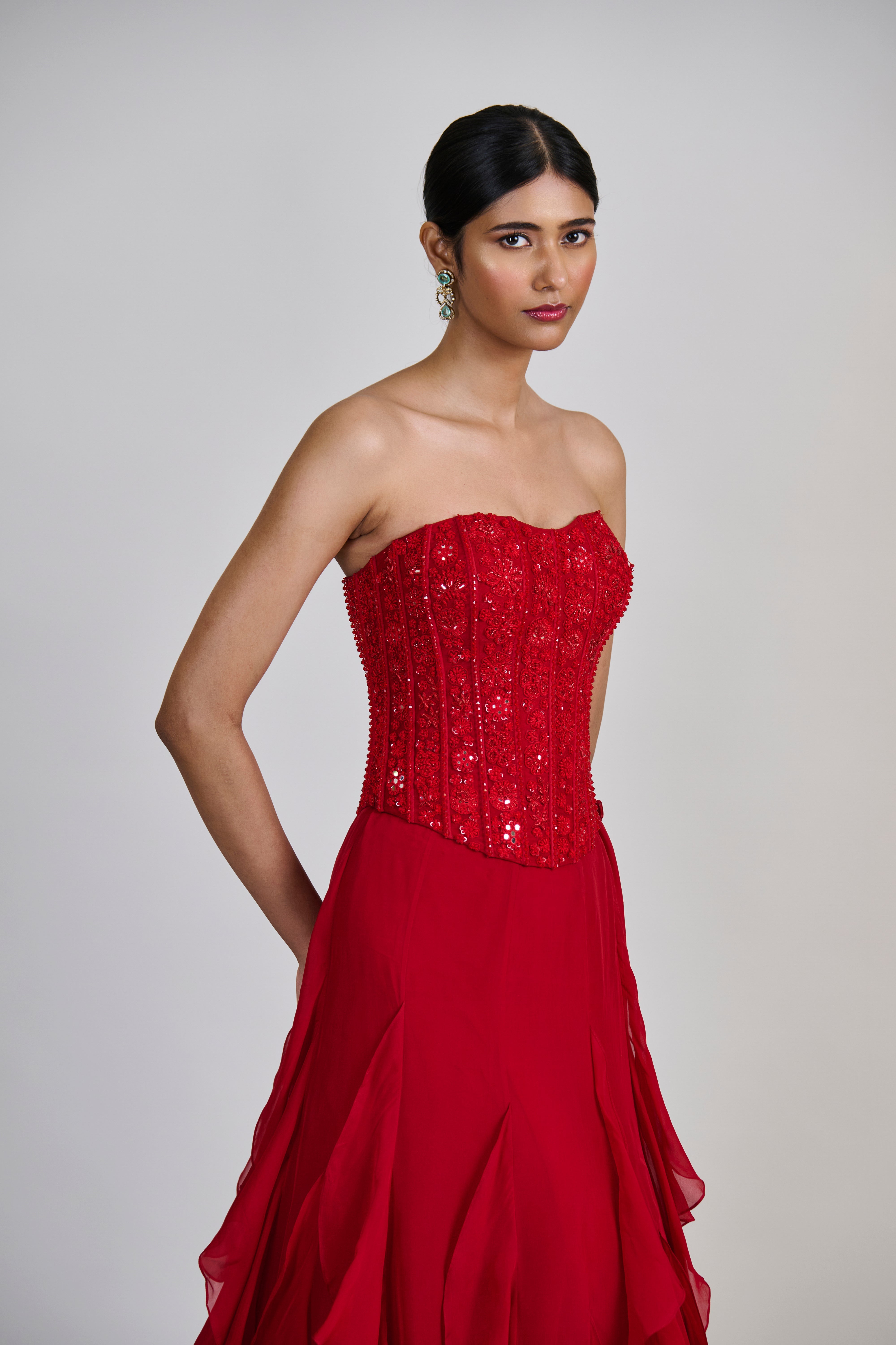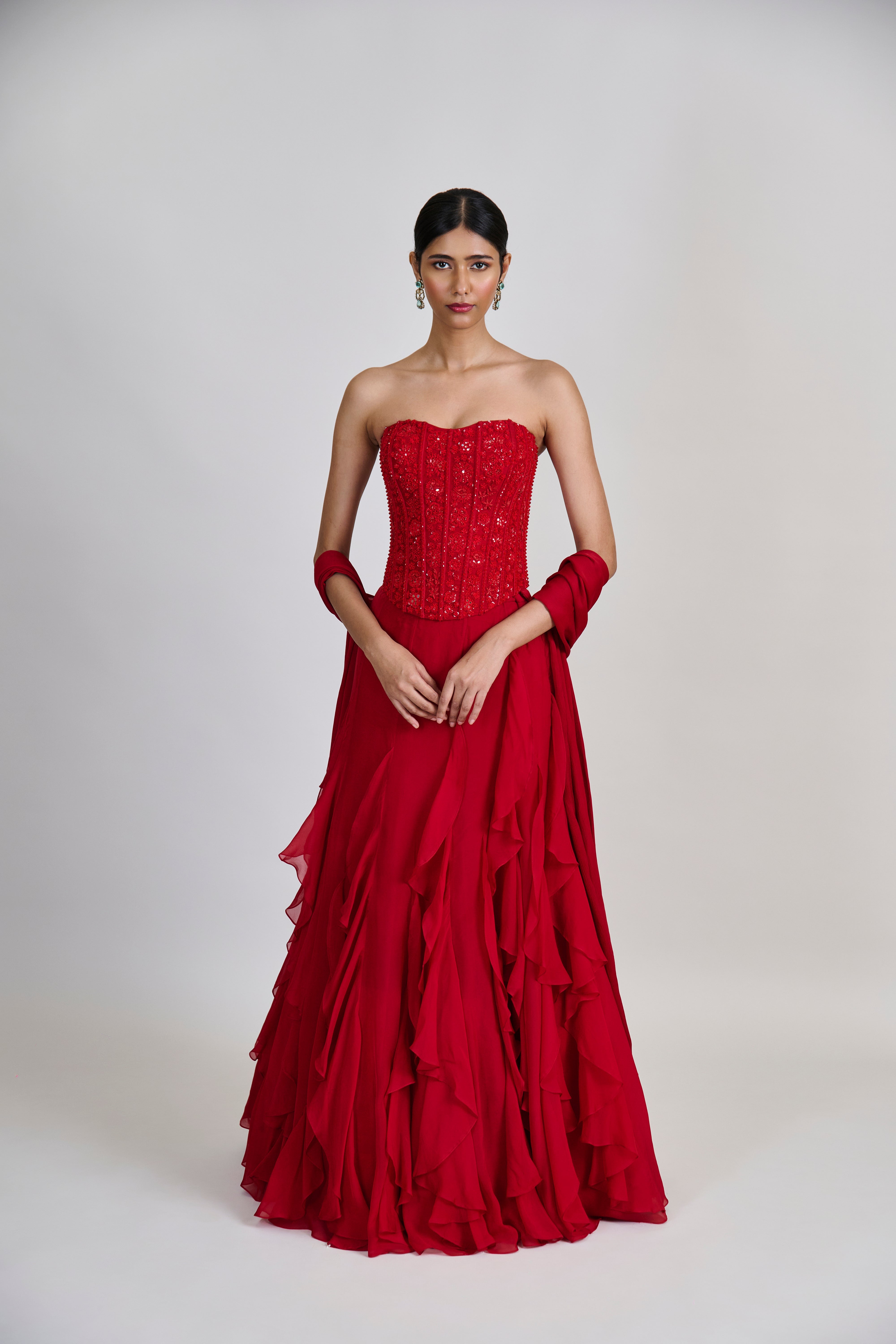 RUFFLE A-LINE SKIRT WITH TONAL EMBROIDERED CORSET AND STOLE