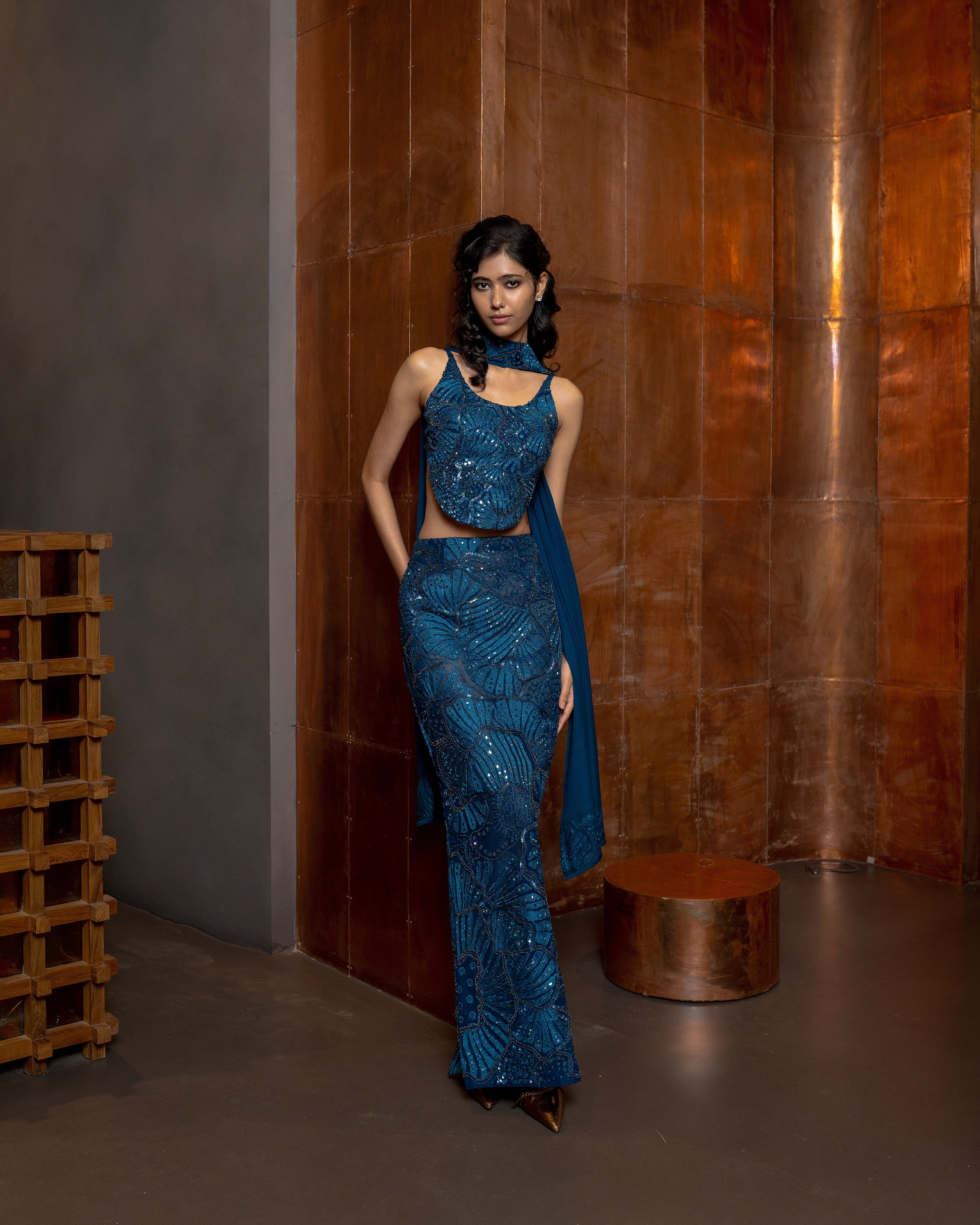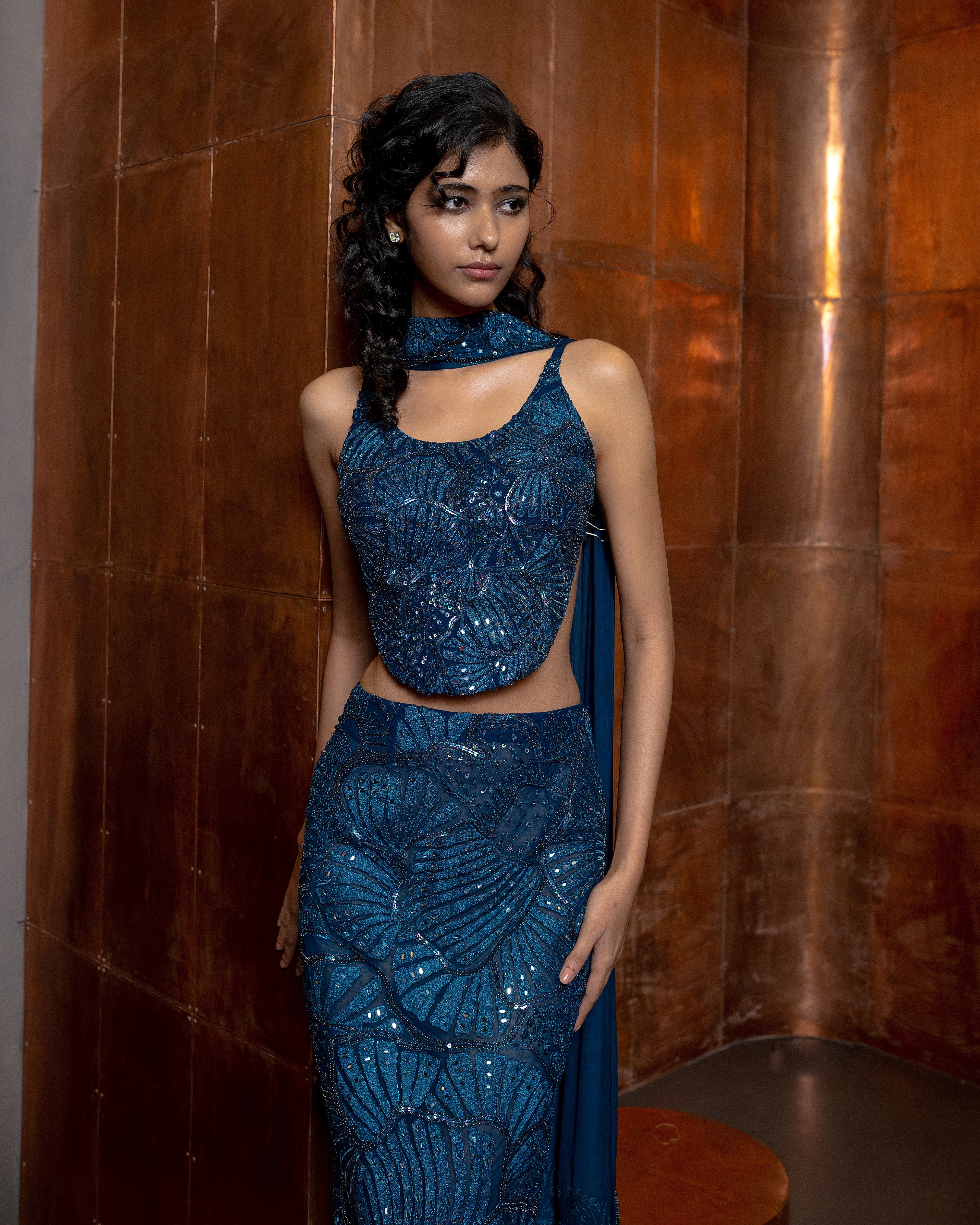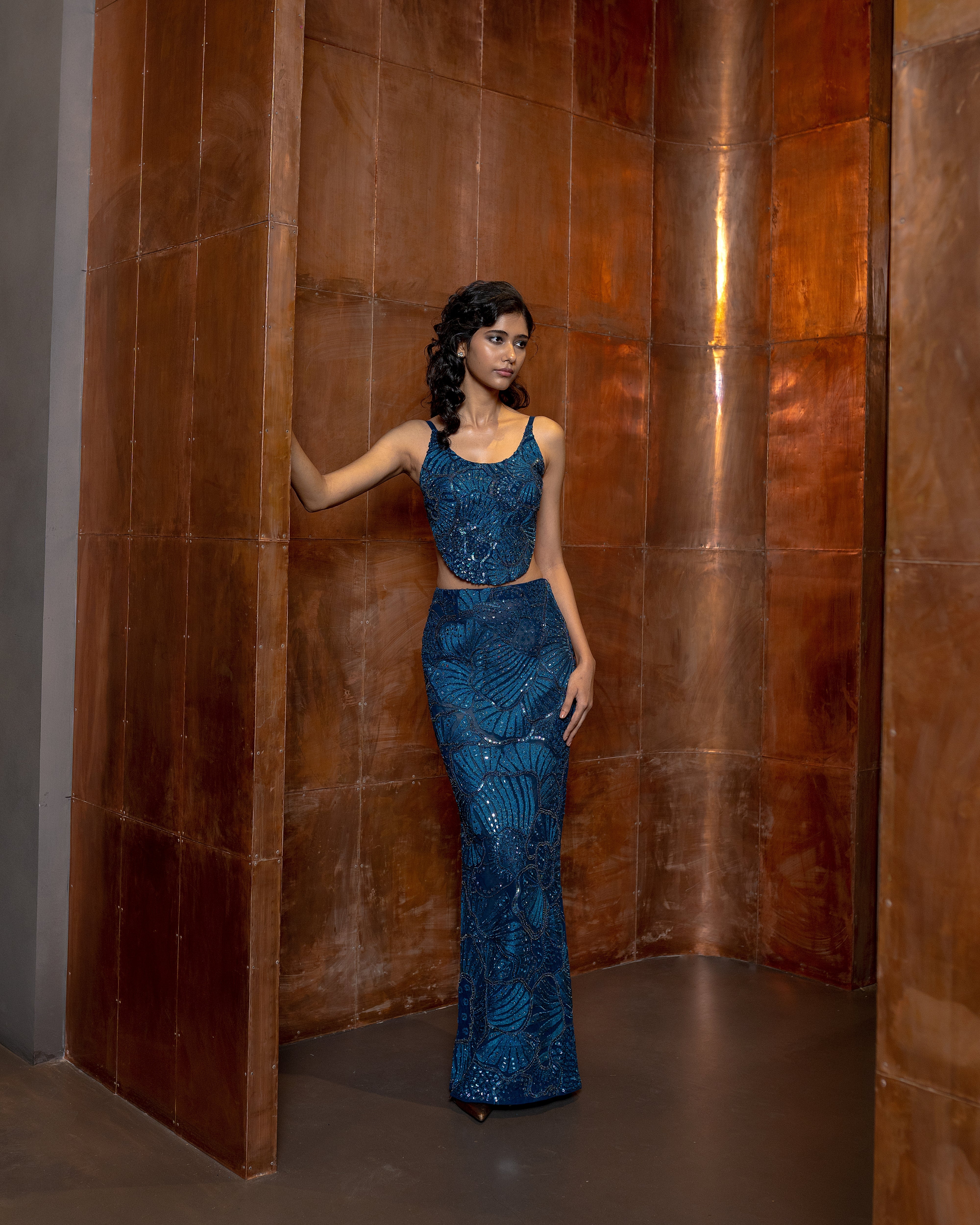 Sea coral embroidered Top, Slim cut Skirt and dupatta