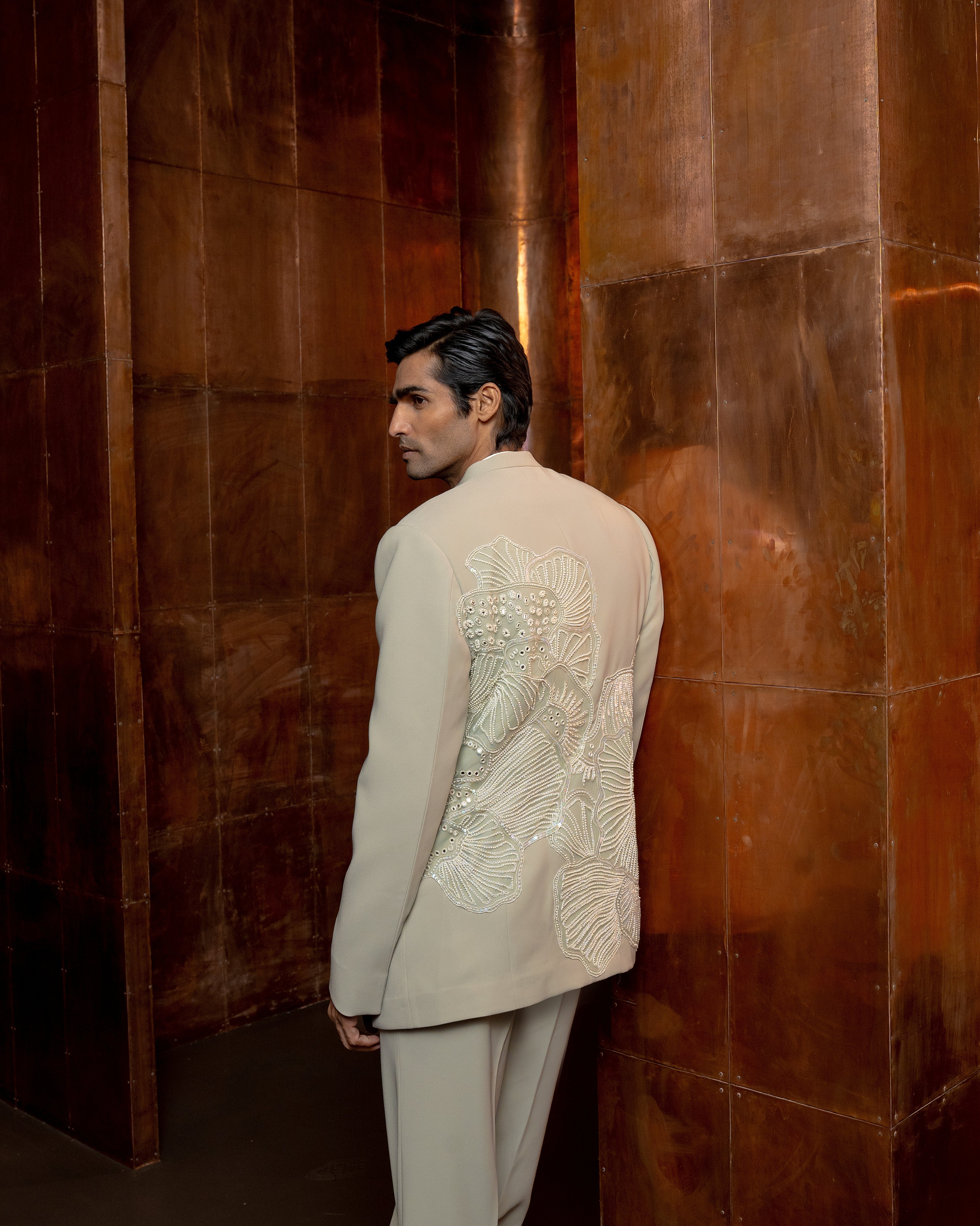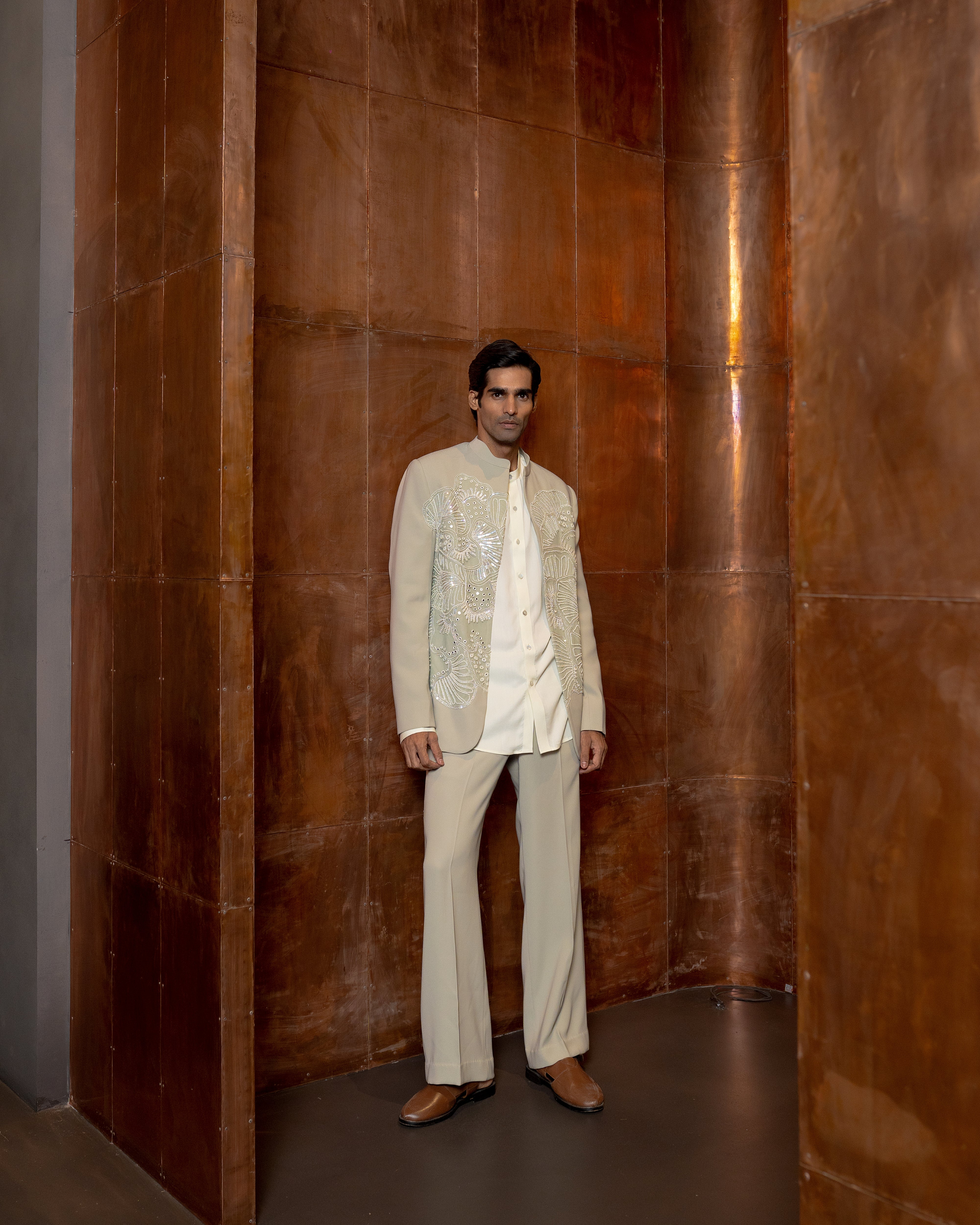 Sea coral embroidered Bandhgala with Plain Shirt and Parallel Pants