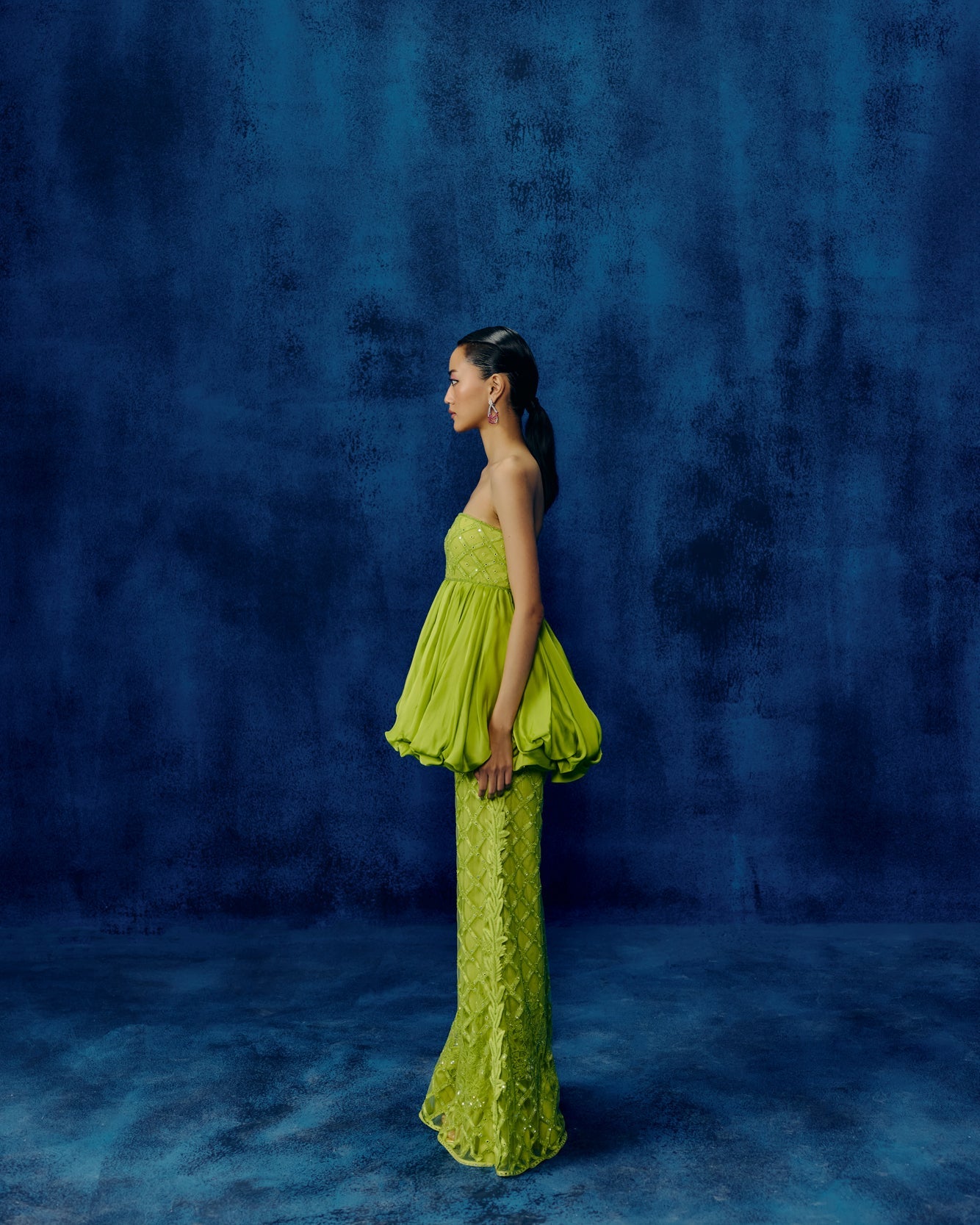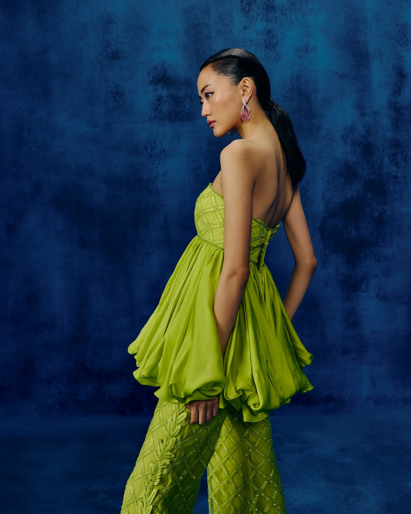 TONAL GRID EMBROIDERY BUBBLE HEM PEPLUM WITH GRID AND TROPICAL LEAVES EMBROIDERY PANTS