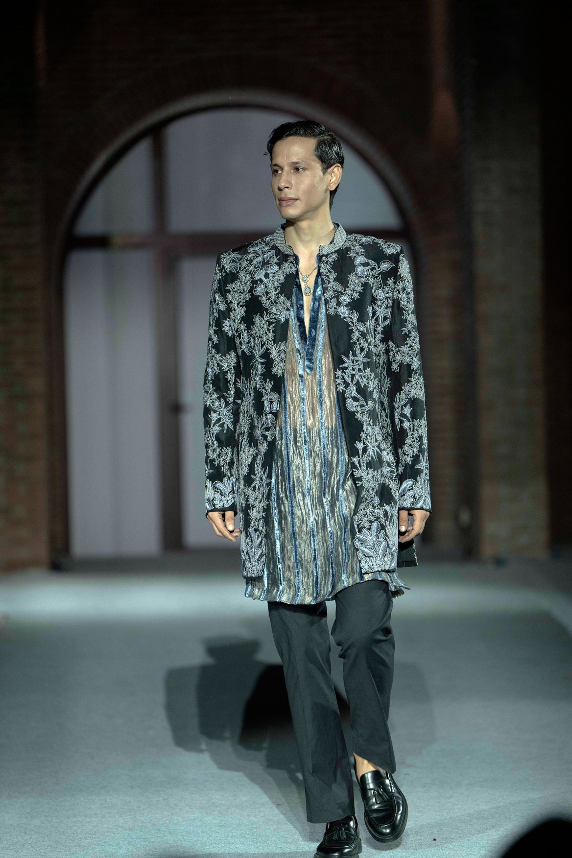 OPEN SHERWANI WITH SPACED OUT WILDFLOWER EMBROIDERY + ASSORTED LEAVES HEM BORDER DETAILING PAIRED WITH TISSUE BASE VELVET STRIPES KURTA SET