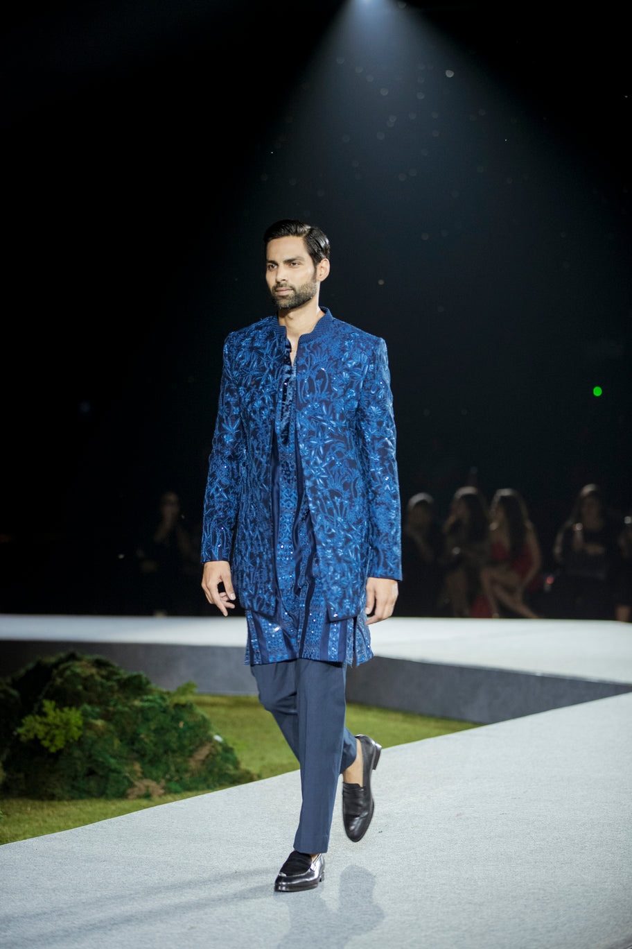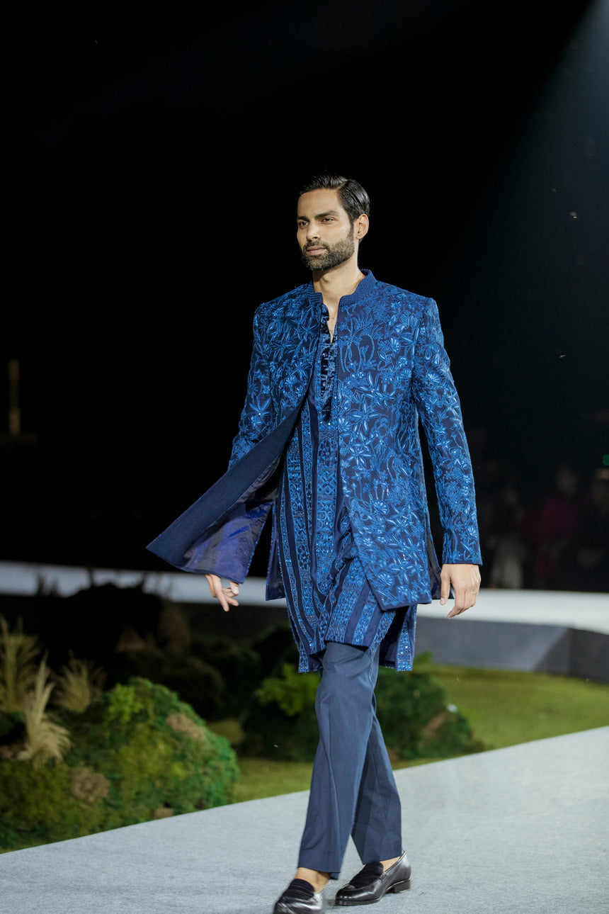 GEOMETRIC STRIPES EMBROIDERY KURTA WITH TONAL WILDFLOWERS SHERWANI SET