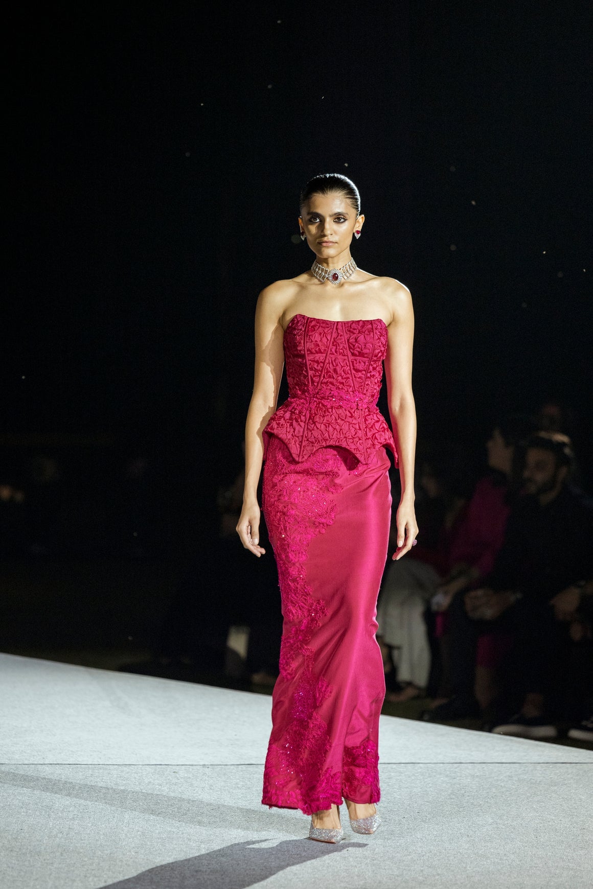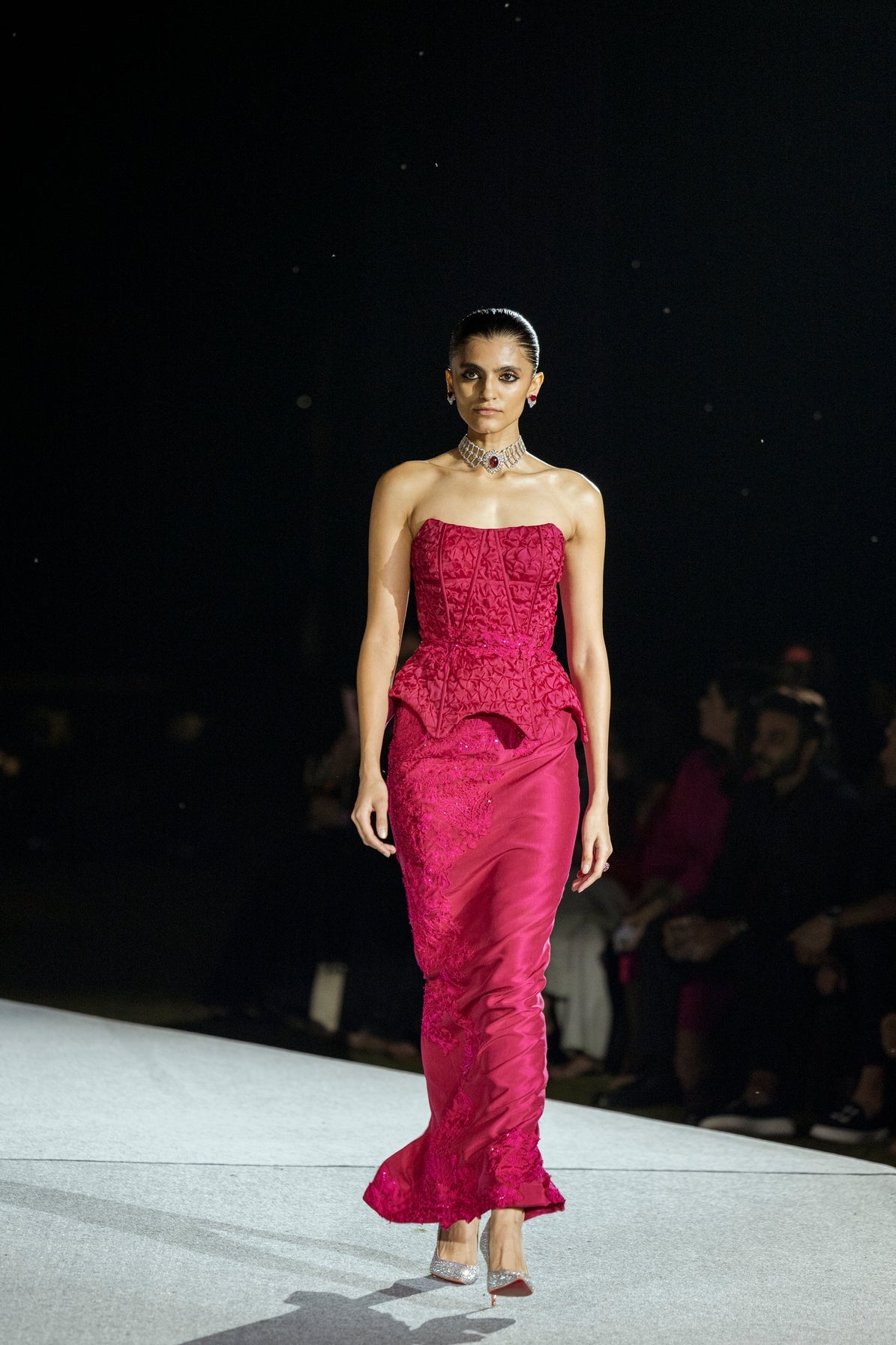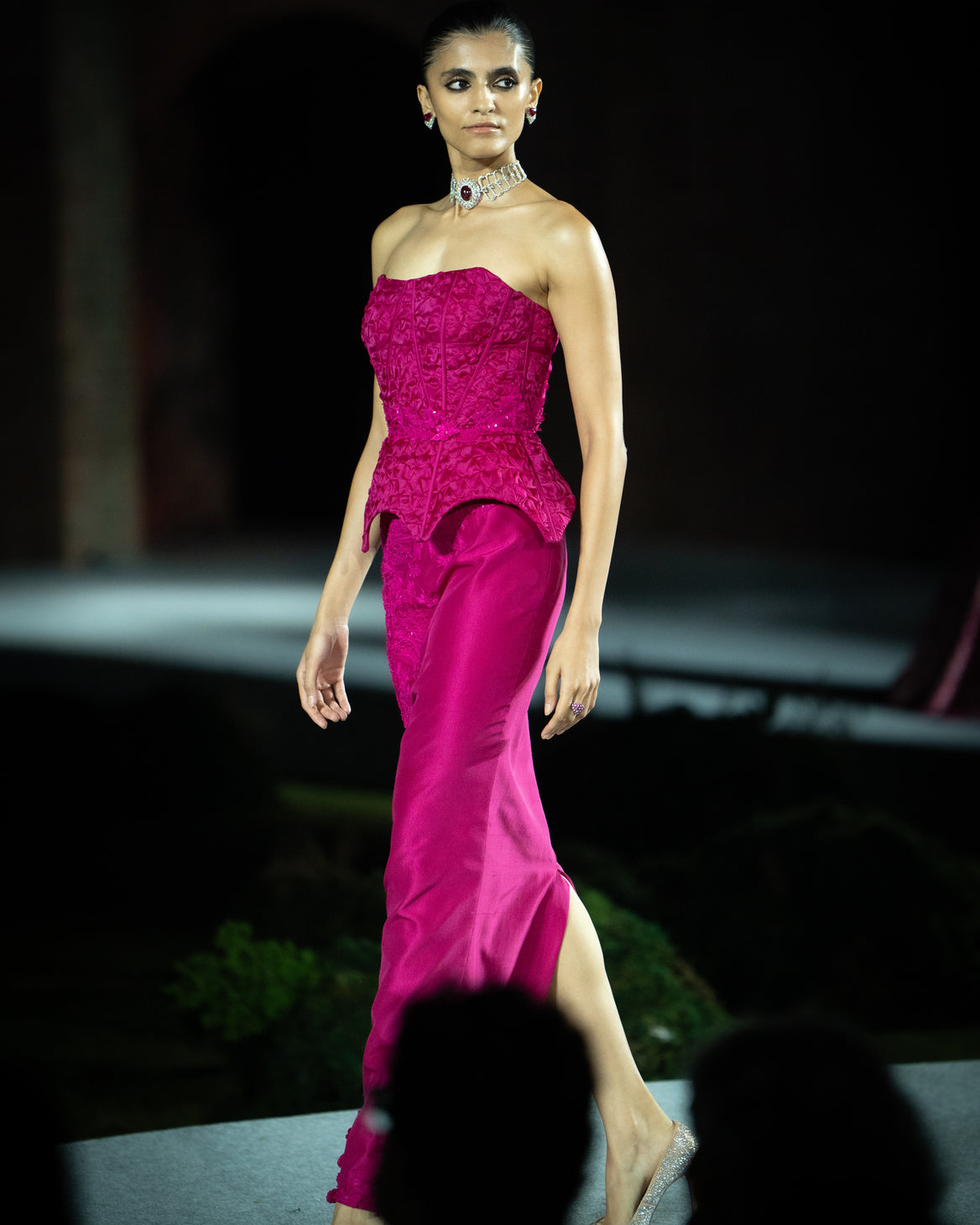 TONAL SMOCKING PEPLUM CORSET PAIRED WITH A WILDFLOWER PLACEMENT SLIM SKIRT