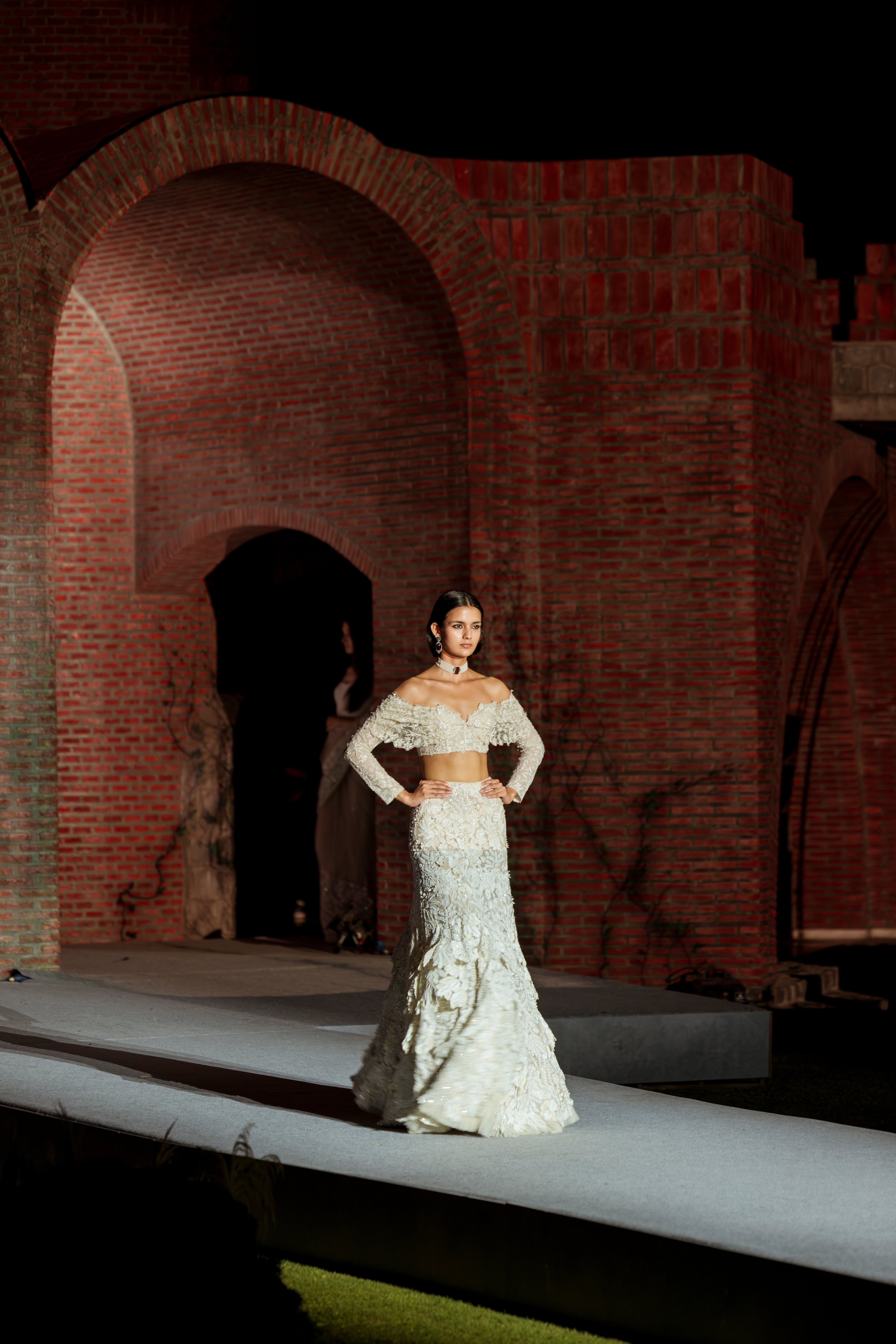 DUO TONE ASSORTED LEAVES FISHCUT LAYERED SKIRT WITH LAYERED TOP AND DUPATTA