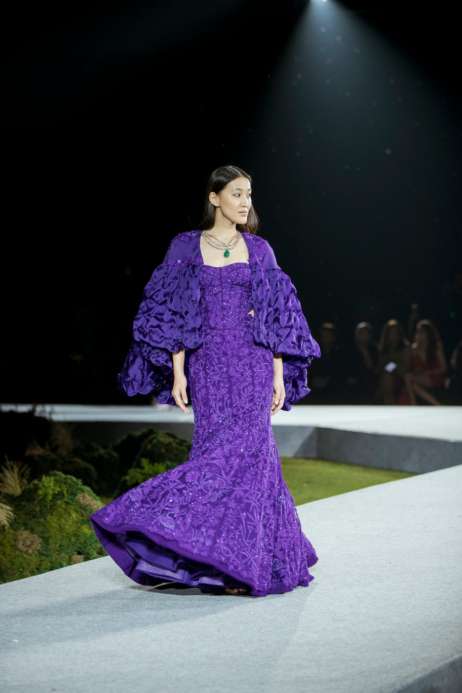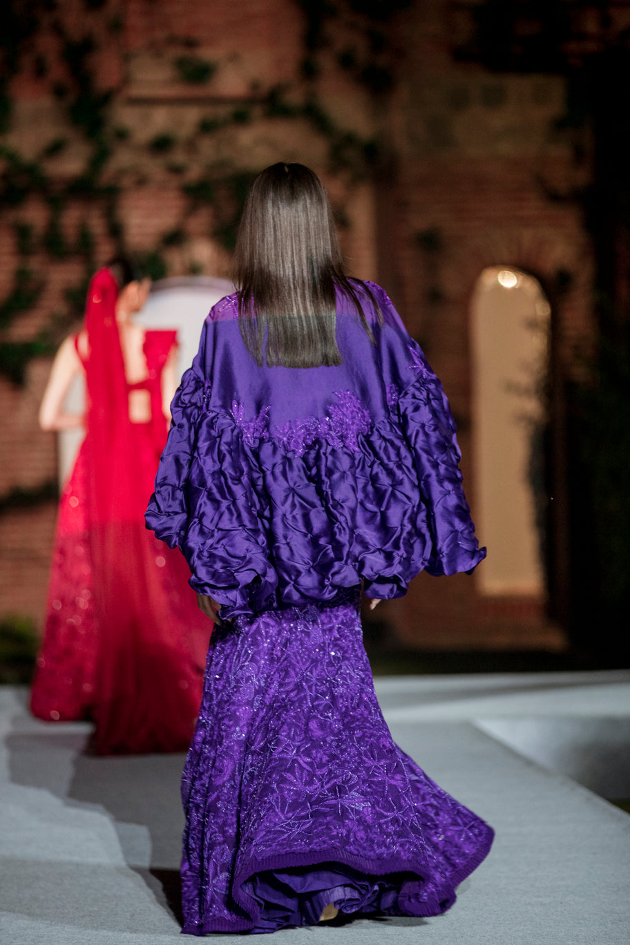 TONAL WILDFLOWER FISH-CUT SKIRT PAIRED WITH A CORSET AND BUBBLE-HEM CAPE