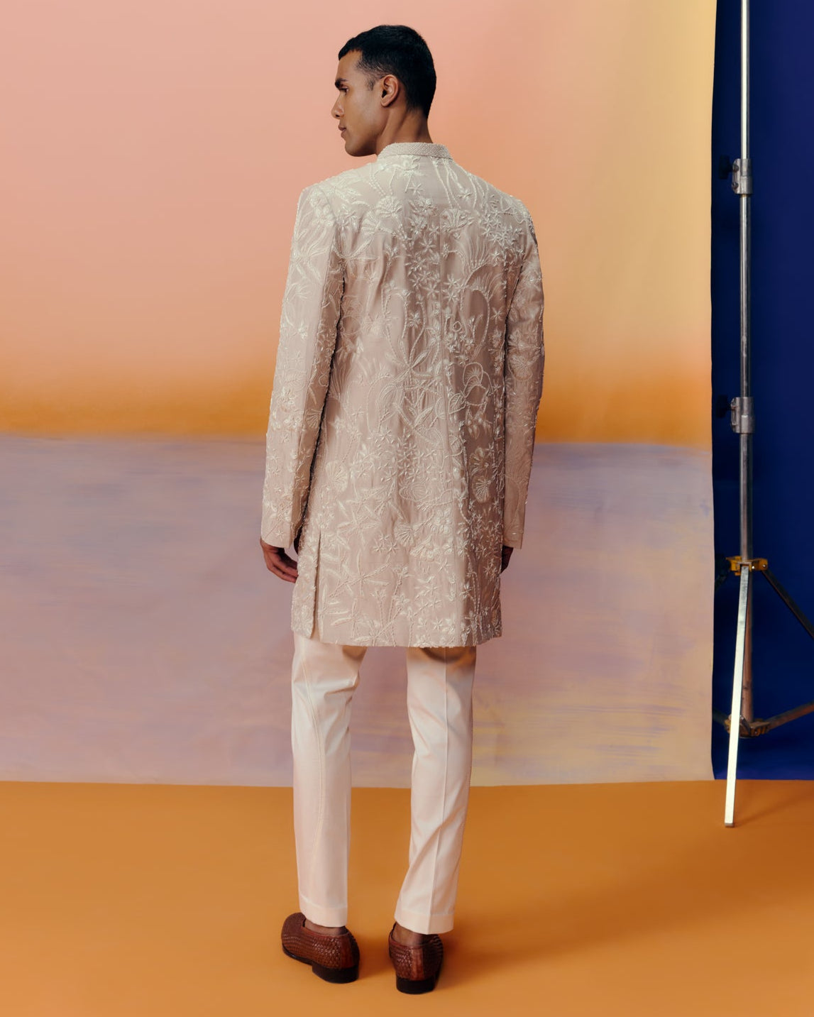 TONAL WILDFLOWERS EMBROIDERY AND ABSTRACT GEOMETRIC PATTERN PLACEMENT SHERWANI SET
