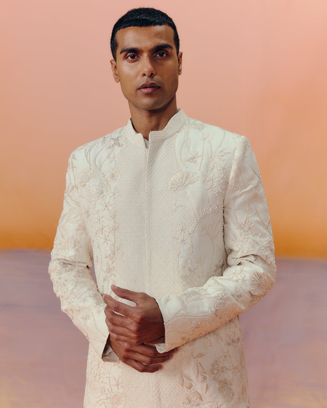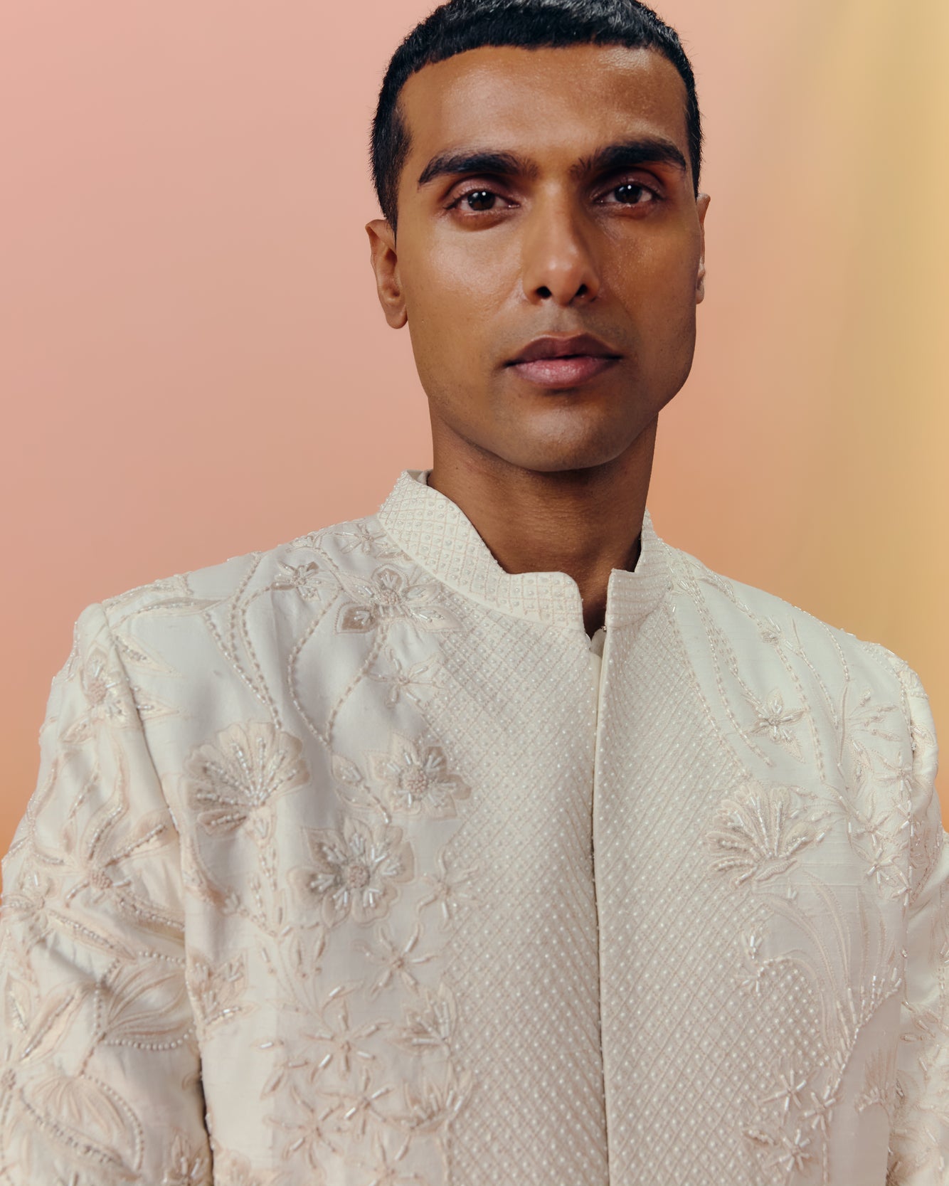 TONAL WILDFLOWERS EMBROIDERY AND ABSTRACT GEOMETRIC PATTERN PLACEMENT SHERWANI SET