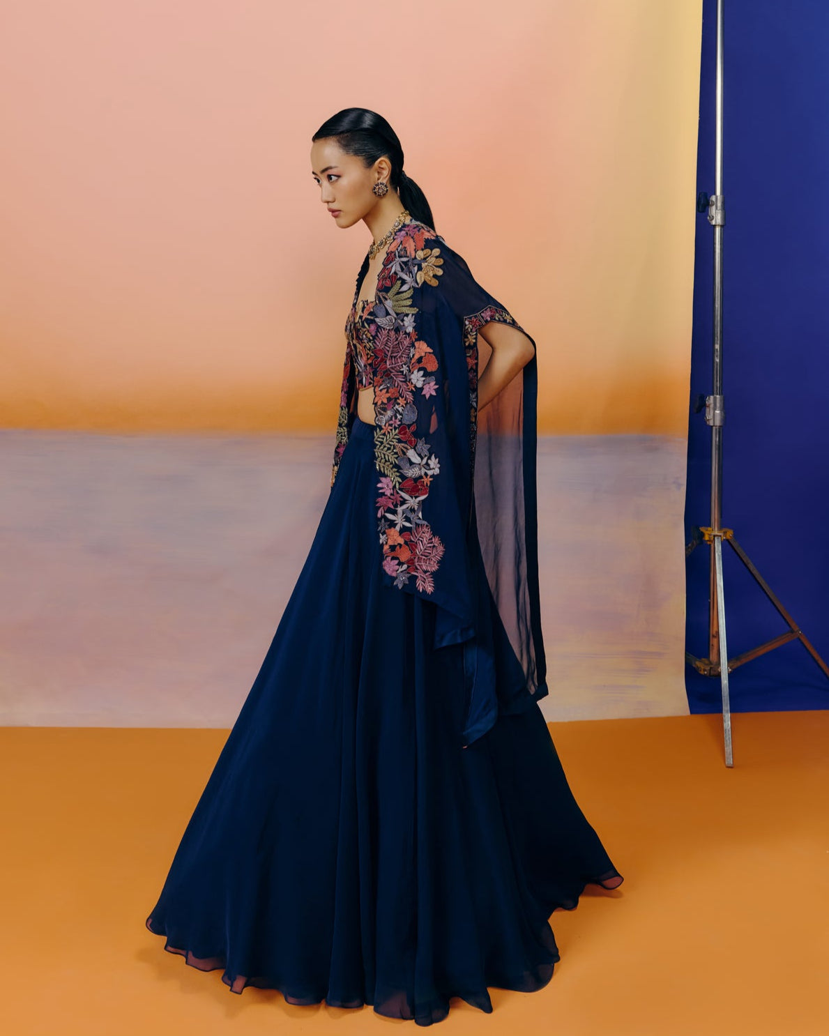 MULTICOLOUR WILDFLOWER ORGANZA PLEATED CAPE WITH WILDFLOWER BUSTIER AND SKIRT