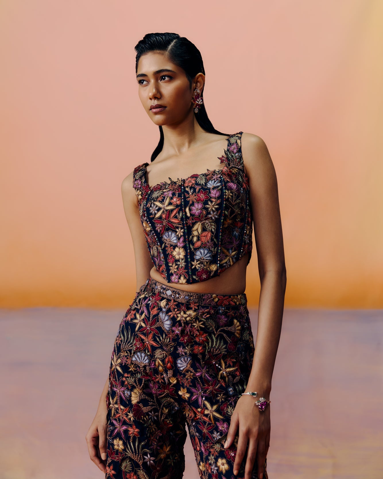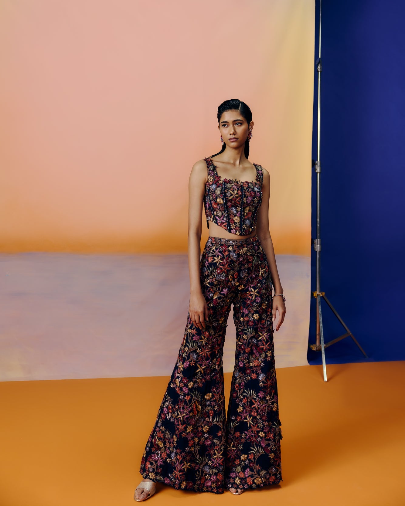 MULTICOLOUR WILDFLOWER CORSET WITH MULTICOLOUR SPACED OUT WILDFLOWER PANTS AND DUPATTA