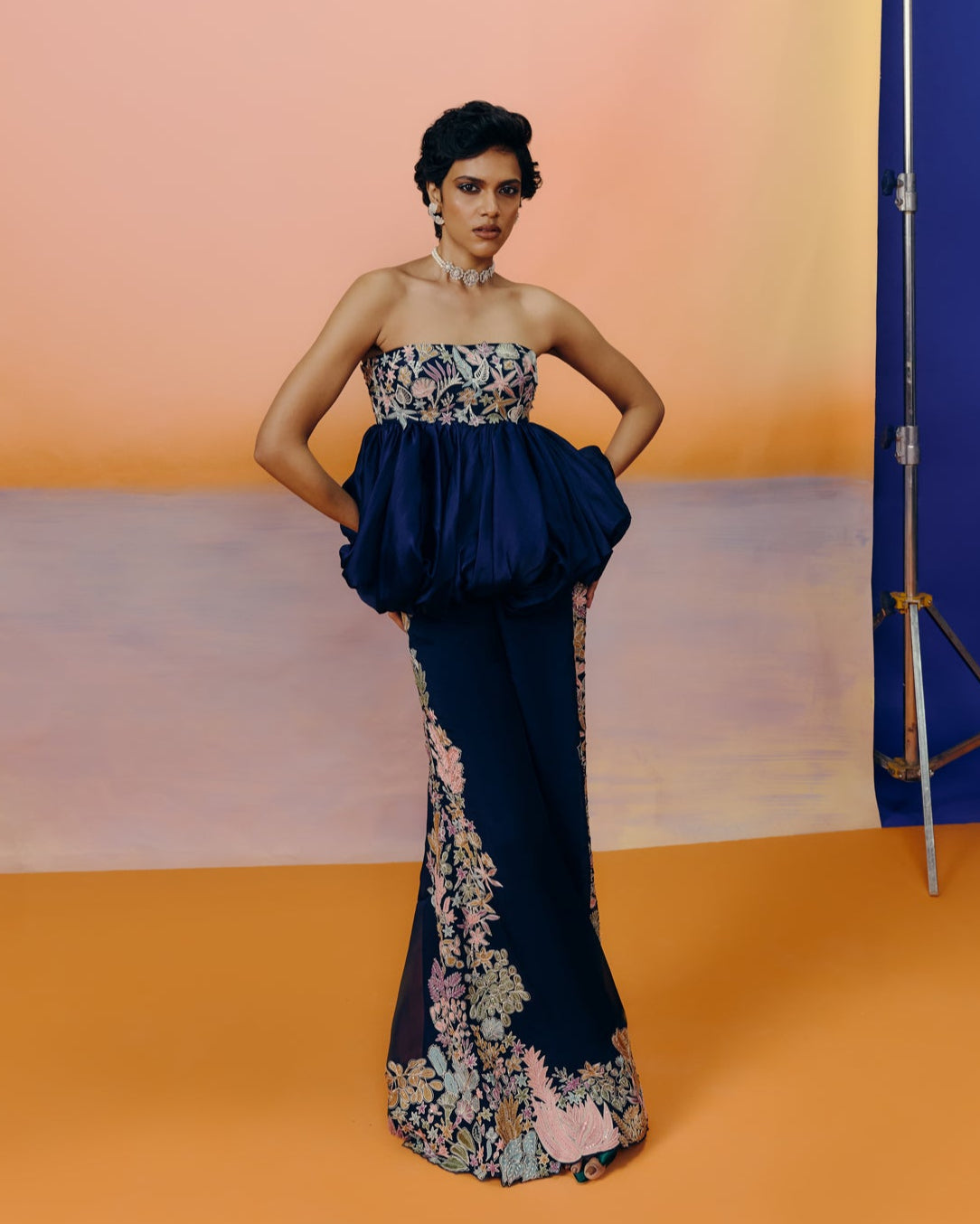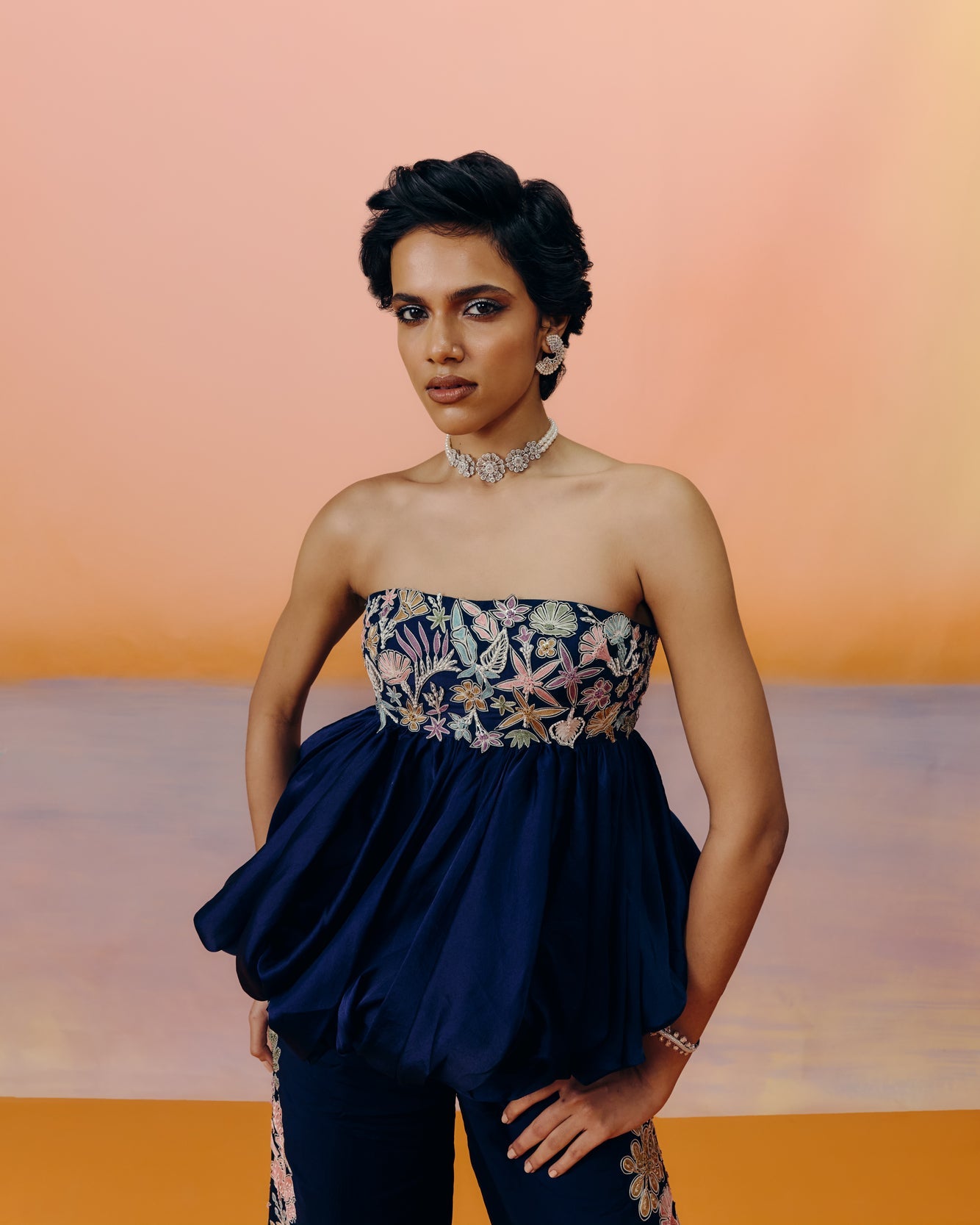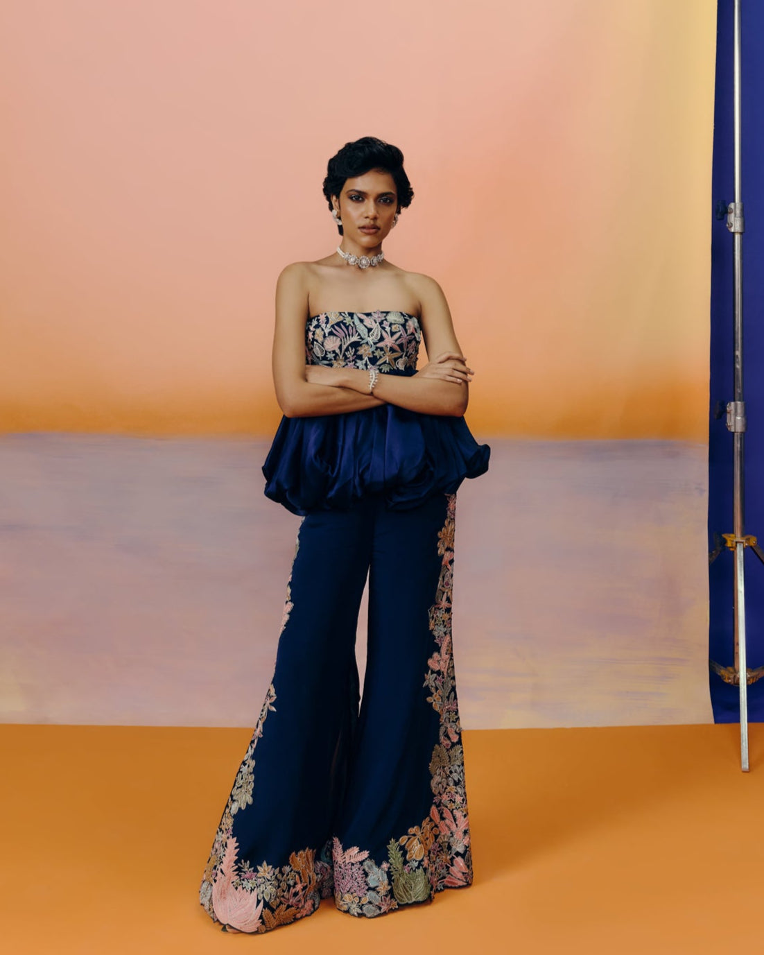 BUBBLE HEM TOP FEATURING MULTICOLOUR WILDFLOWER APPLIQUE PAIRED WITH EMBROIDERED PANTSÂ
