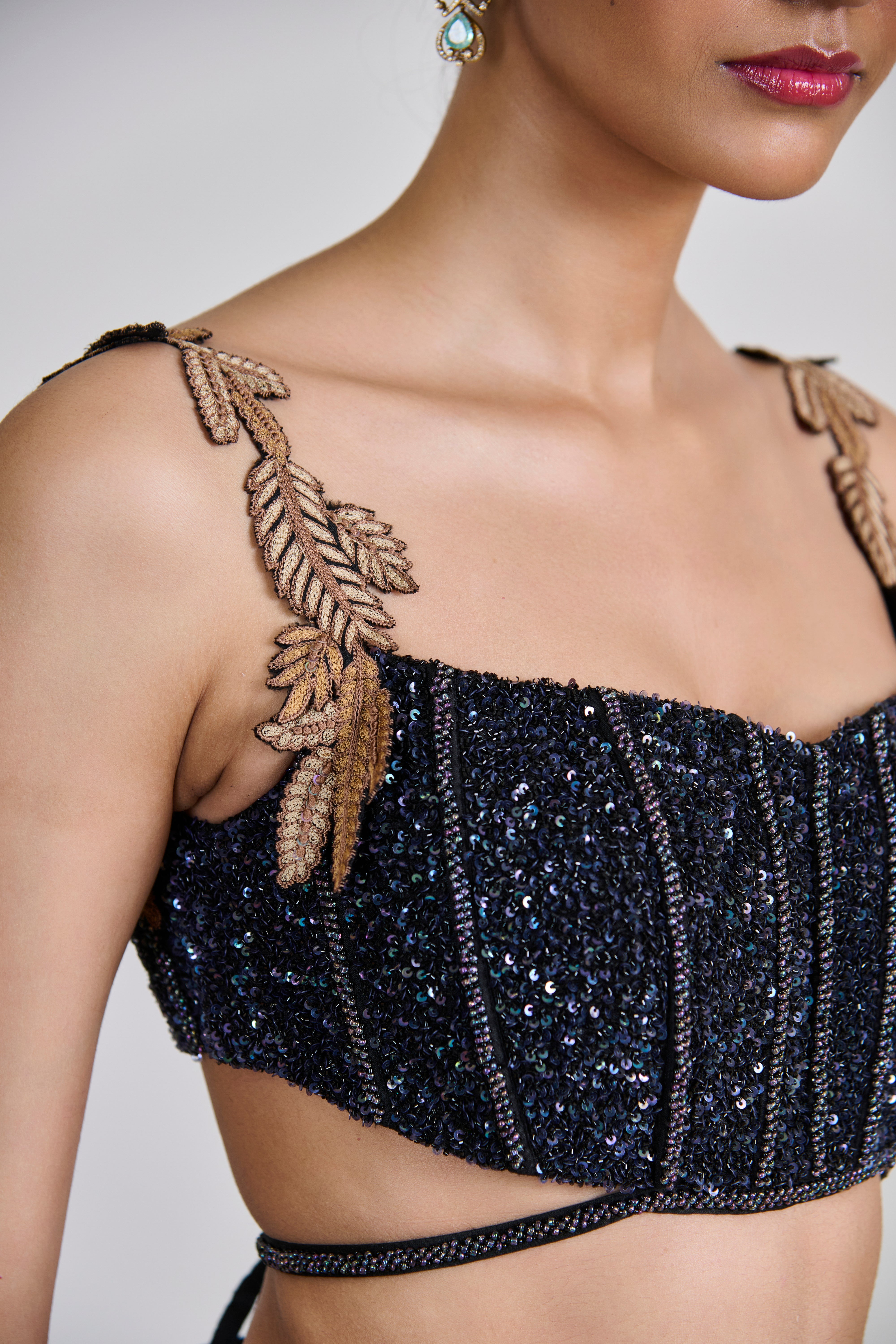 SEQUIN CORSET WITH A DUPATTA, PAIRED WITH MULTICOLOUR GEOMETRIC PANTS FEATURING FLORAL BUNCHES