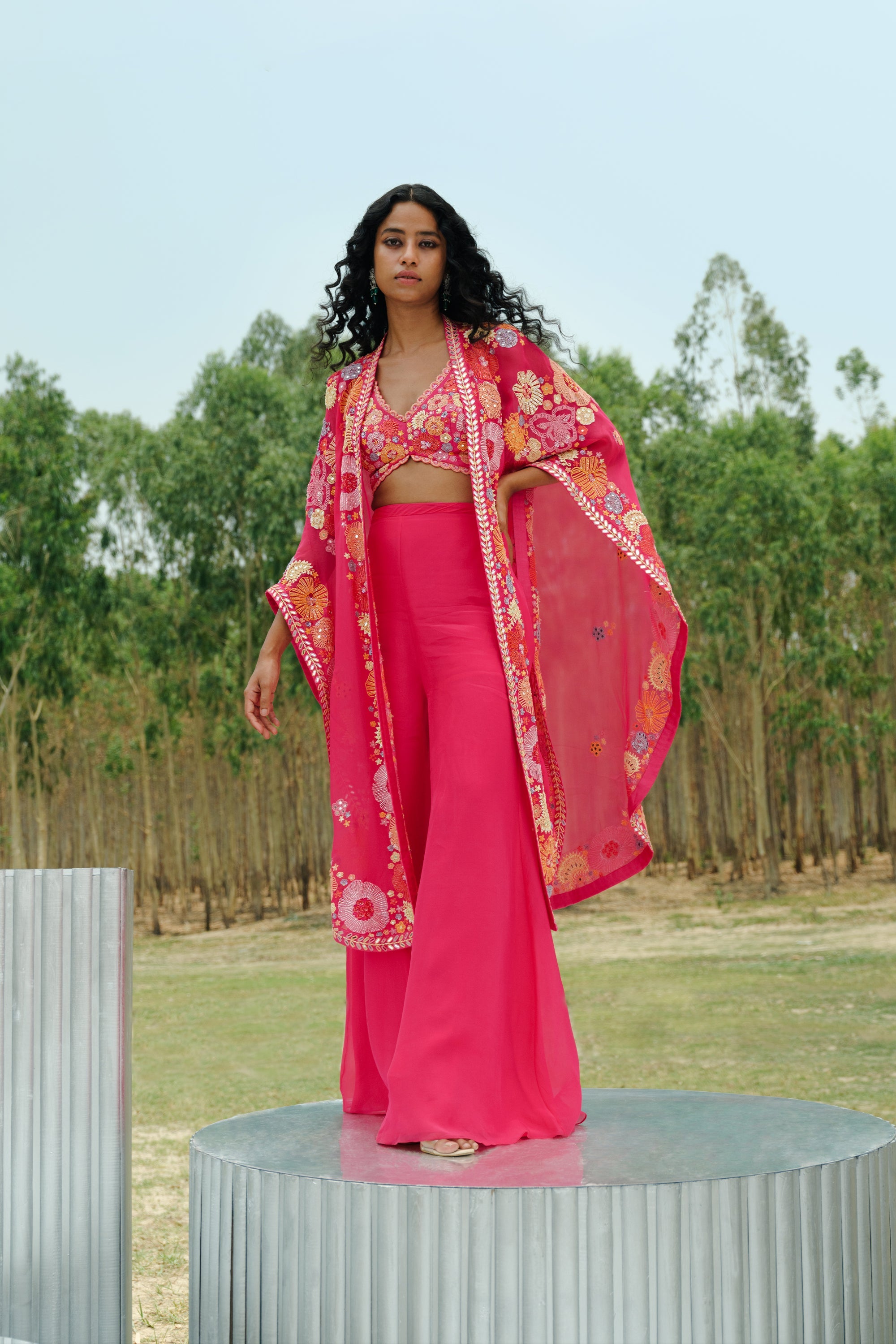 Fuchsia Long flora cape paired with crop top and flared pants Fuchsia Long flora cape paired with crop top and flared pantsÂ