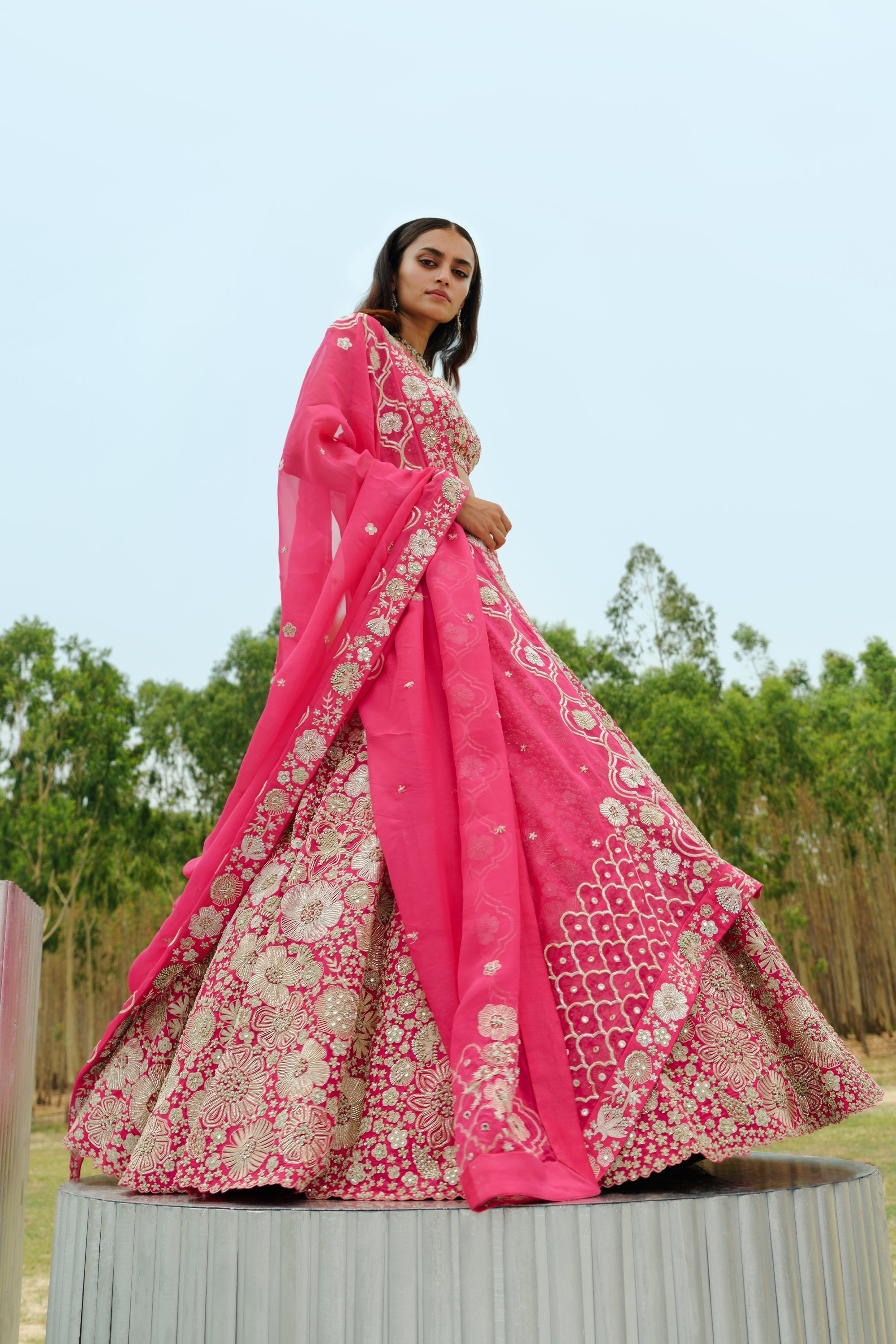 Fuchsia gold and silver floral embroidered lehenga paired with encrusted blouse and dupatta