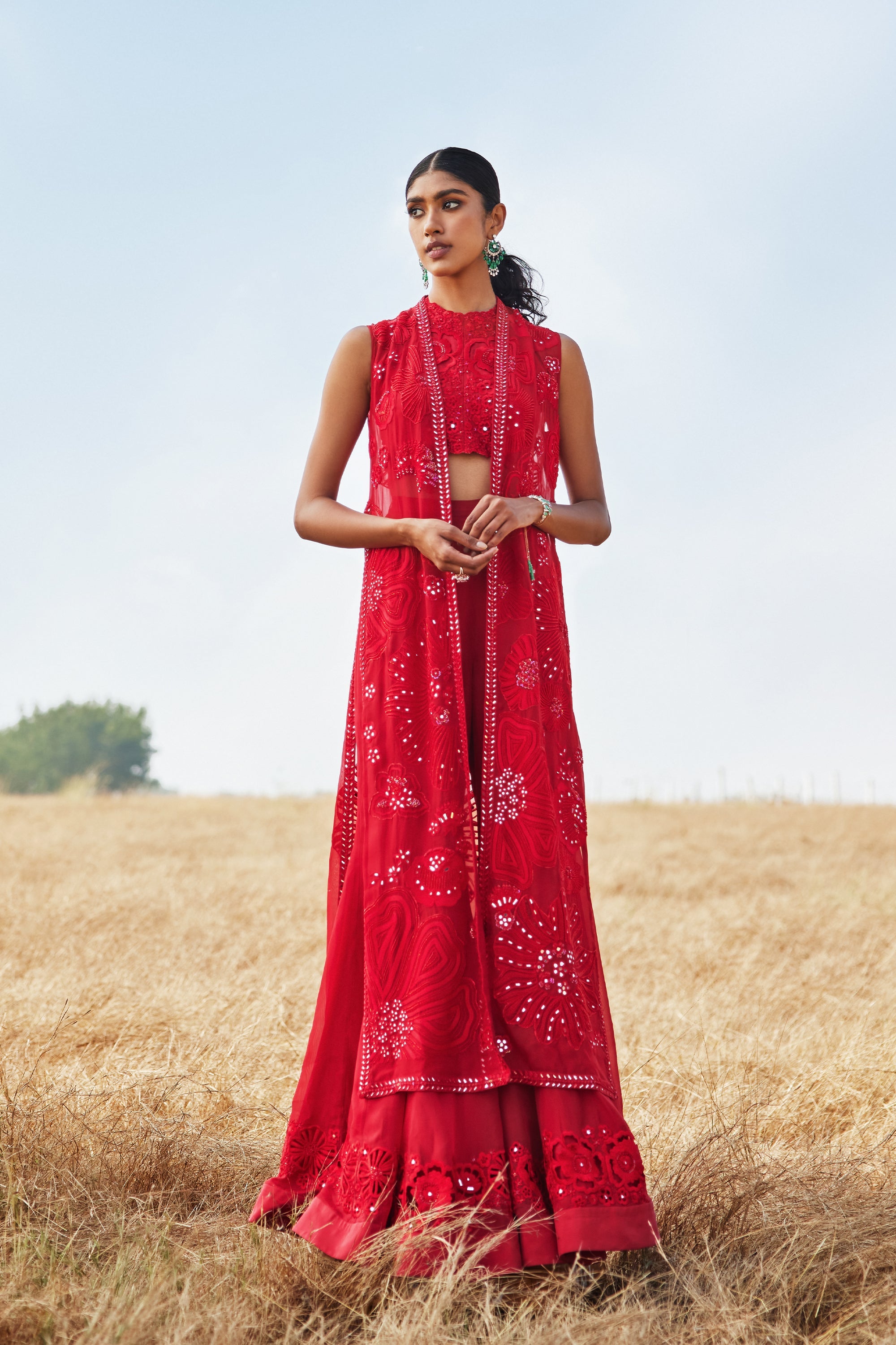 Cosmic precious flowers tonal embroidered organza jacket with chanderi halter crop top and organza pants