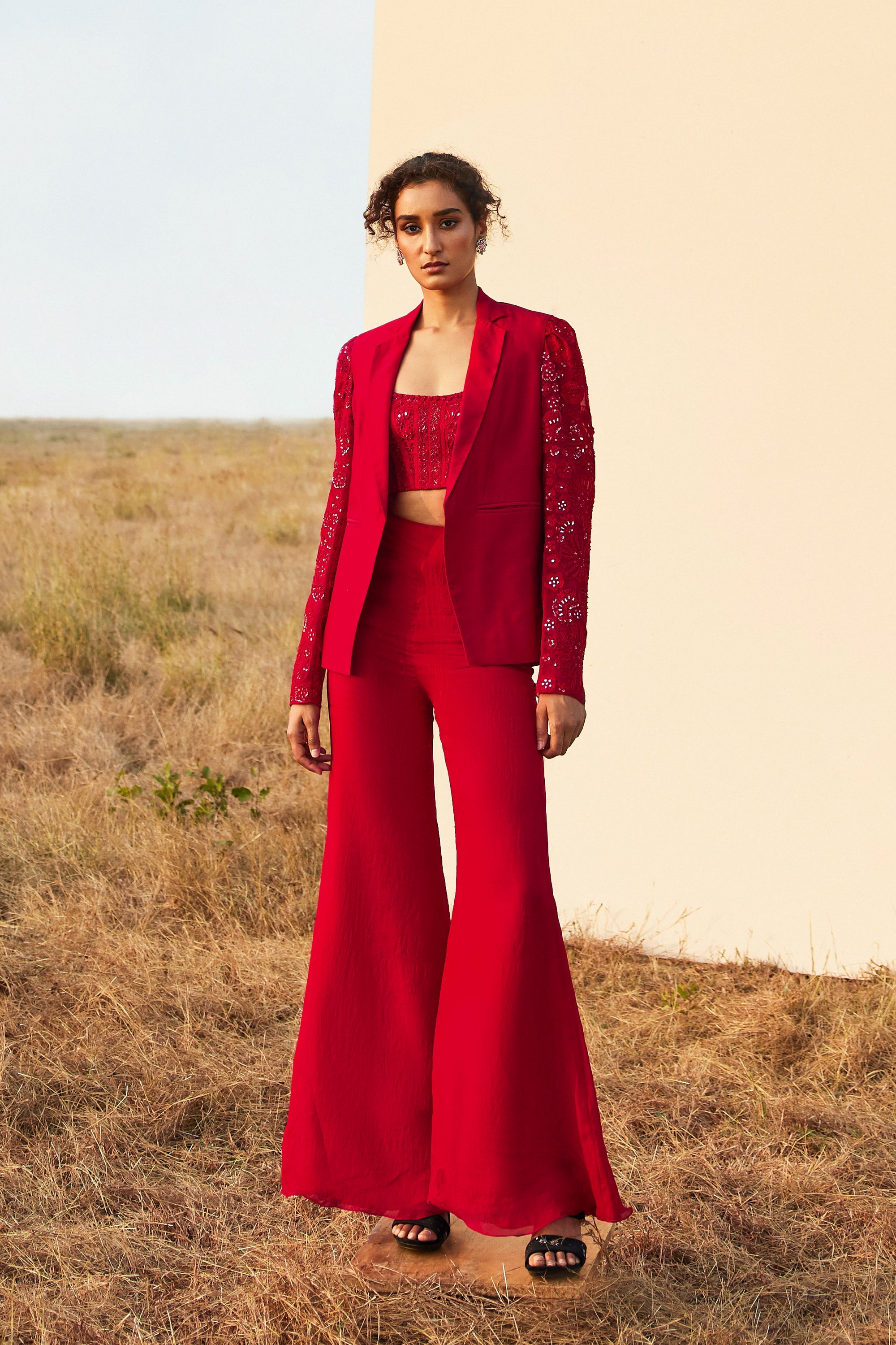 Pouf sleeve blazer in chanderi encrusted with precious flowers sleeve paired with a chanderi corset and organza pant's