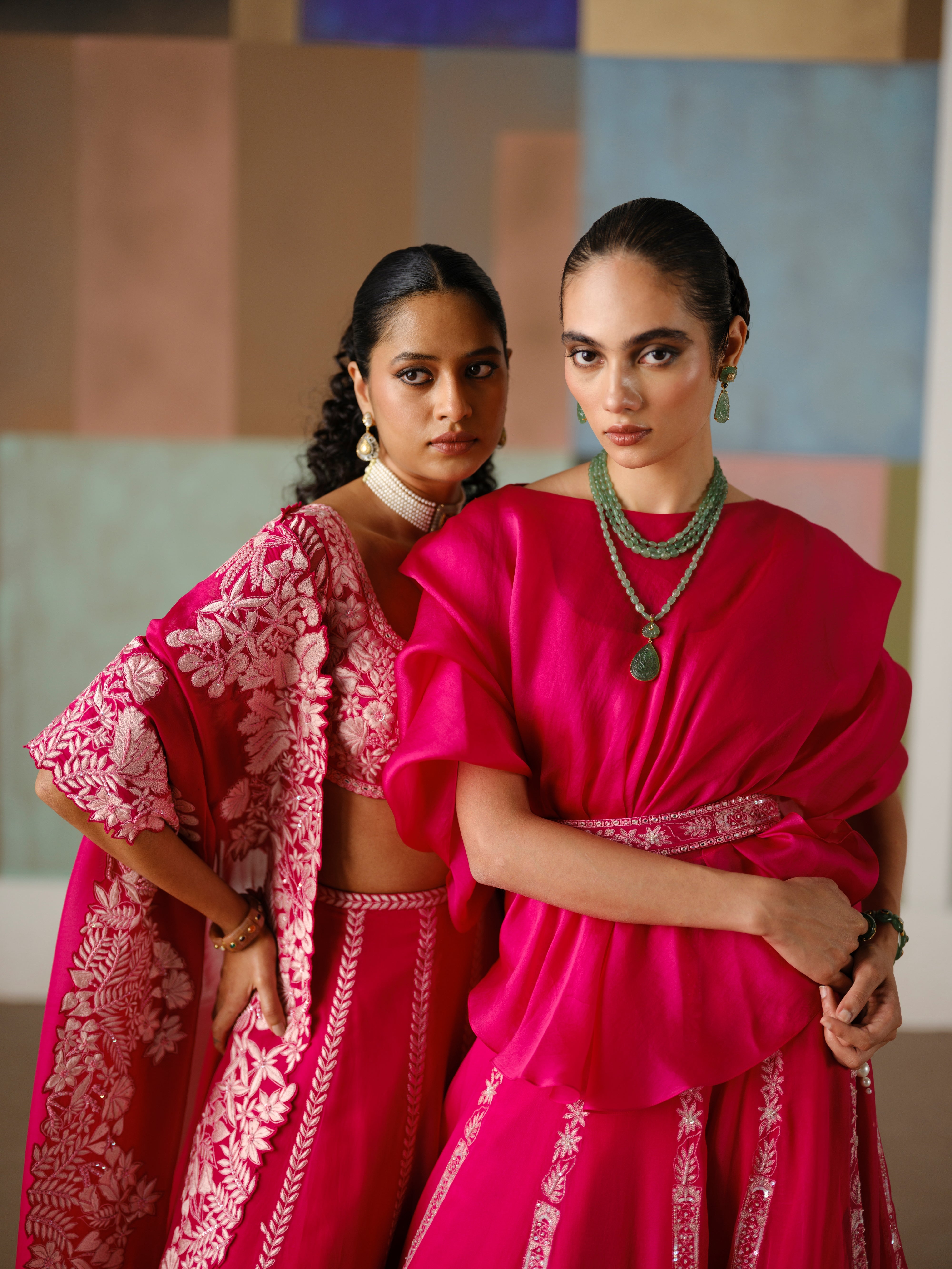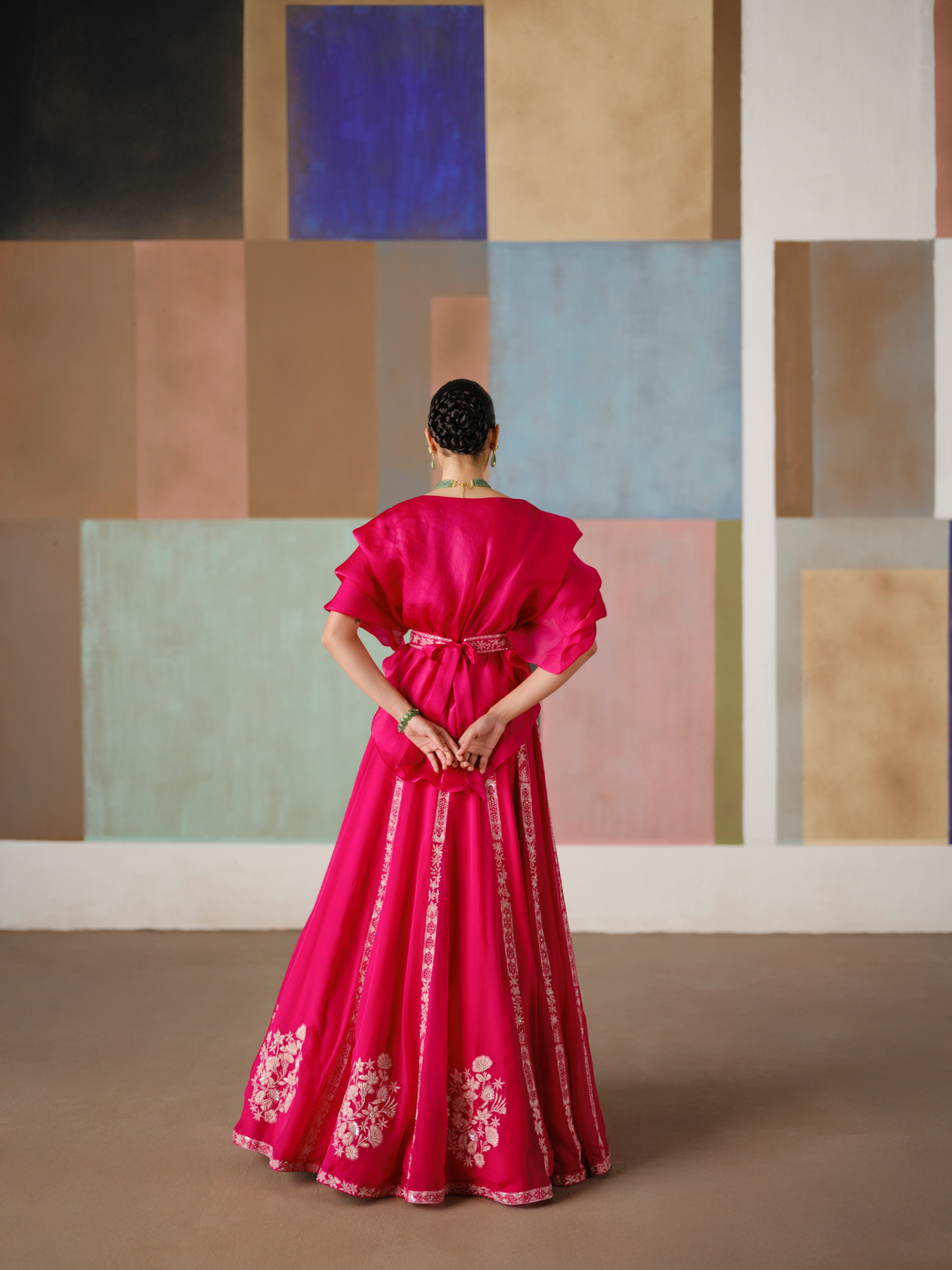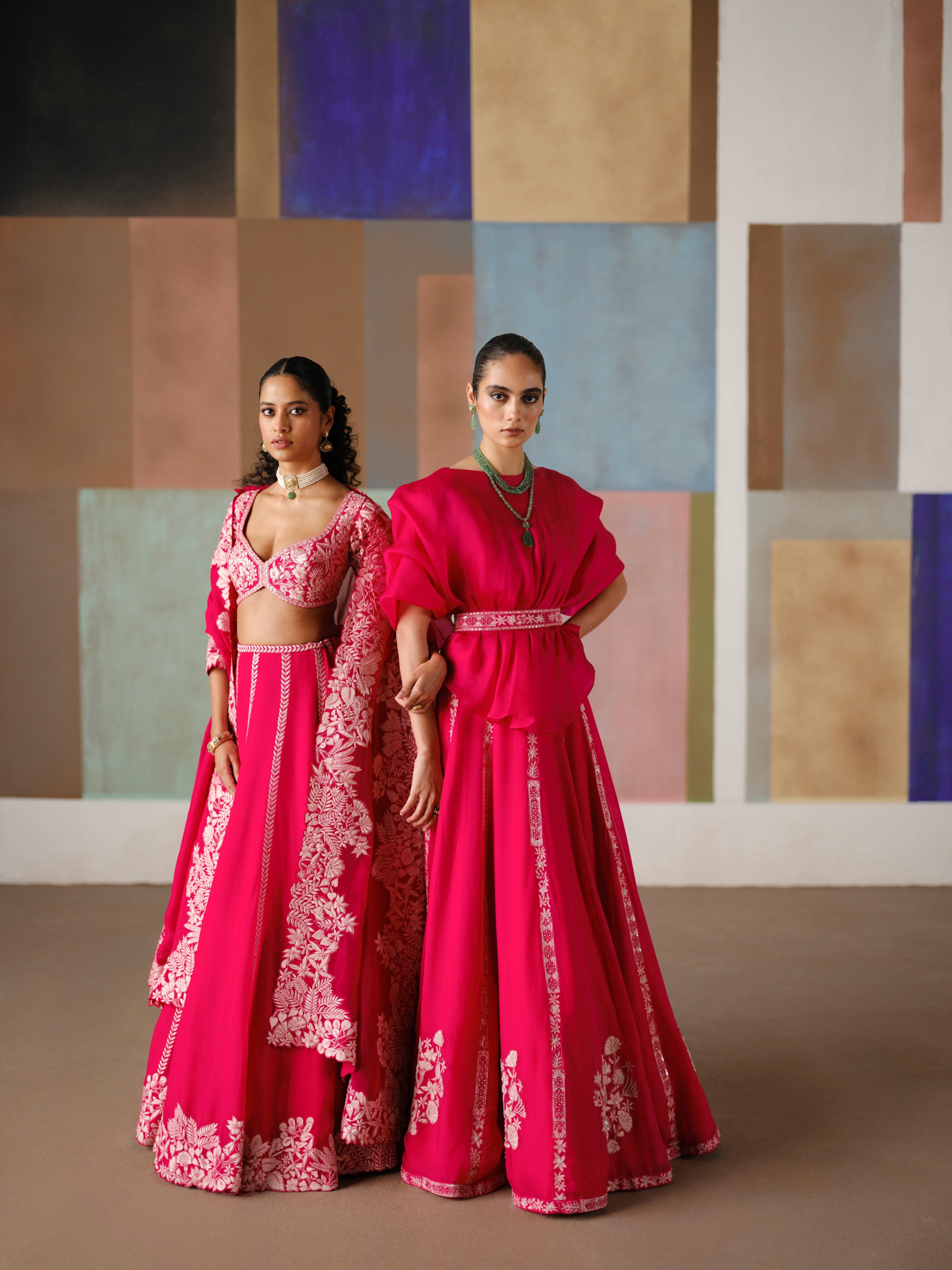CONTRAST GRID-LINE AND WILDFLOWER-BUNCH EMBROIDERED SKIRT PAIRED WITH A POUF TOP, BUSTIER, AND BELT.
