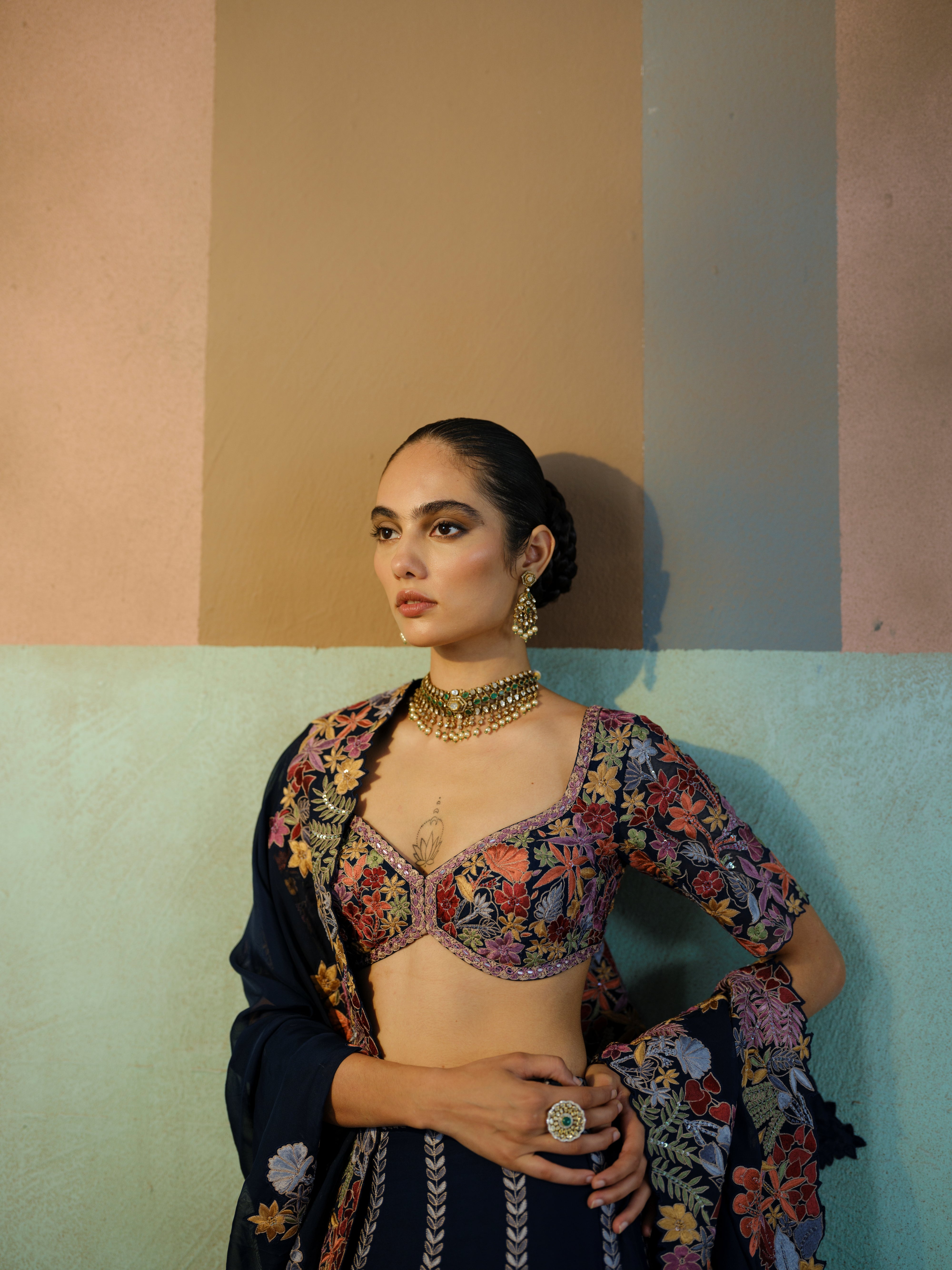 CONTRAST ASSORTED-LEAVES EMBROIDERED LEHENGA PAIRED WITH A MATCHING BLOUSE AND DUPATTA.