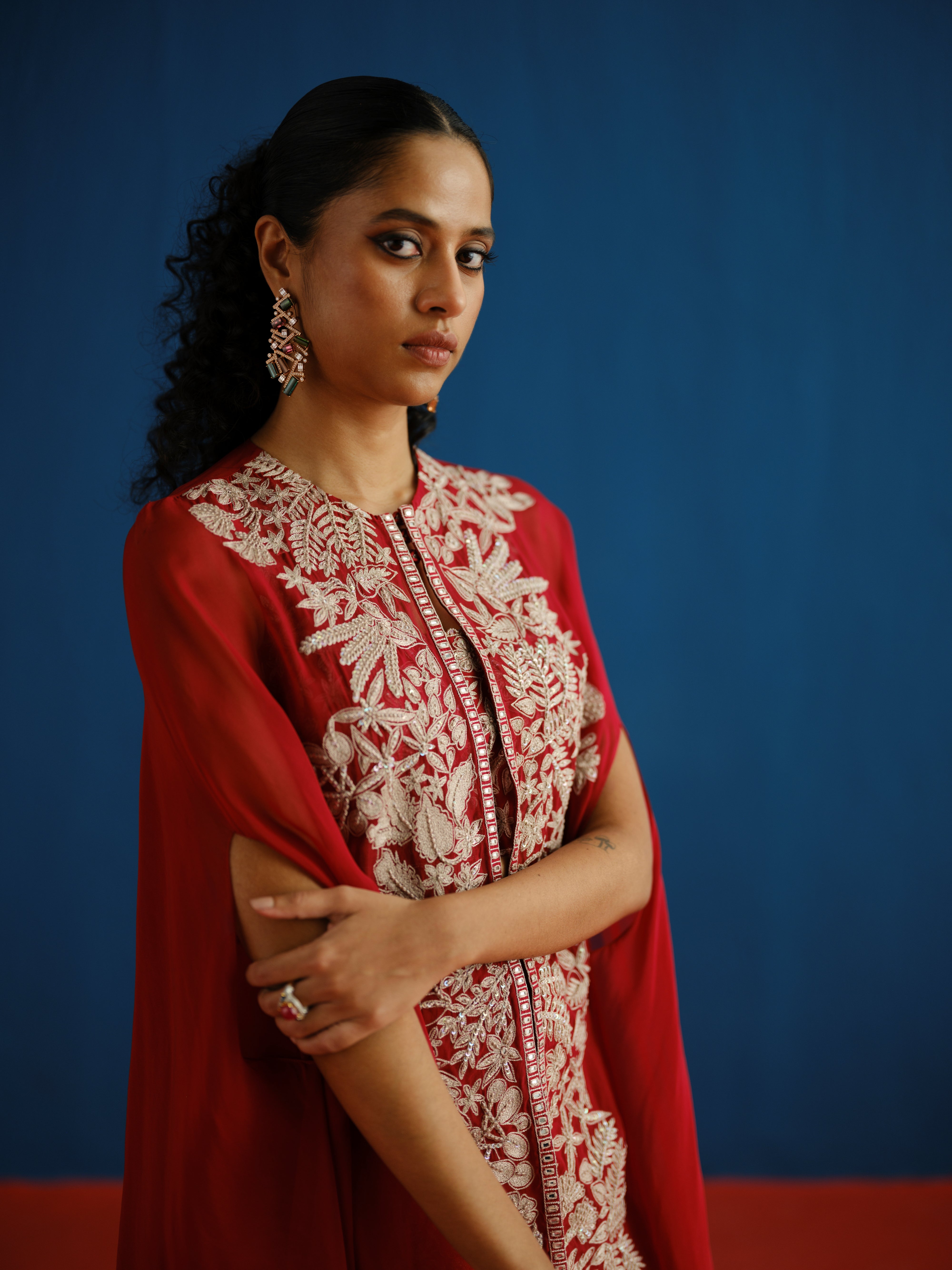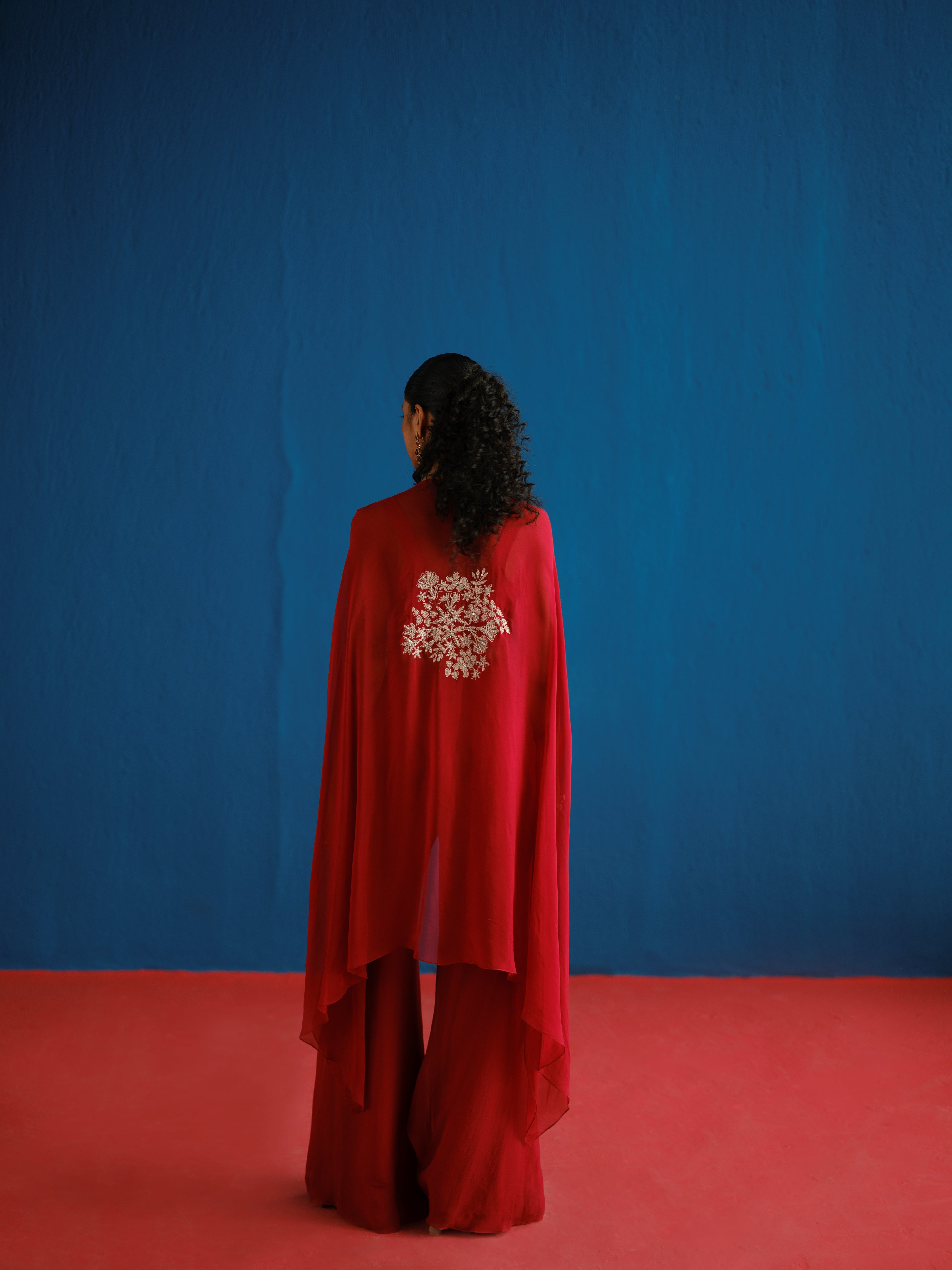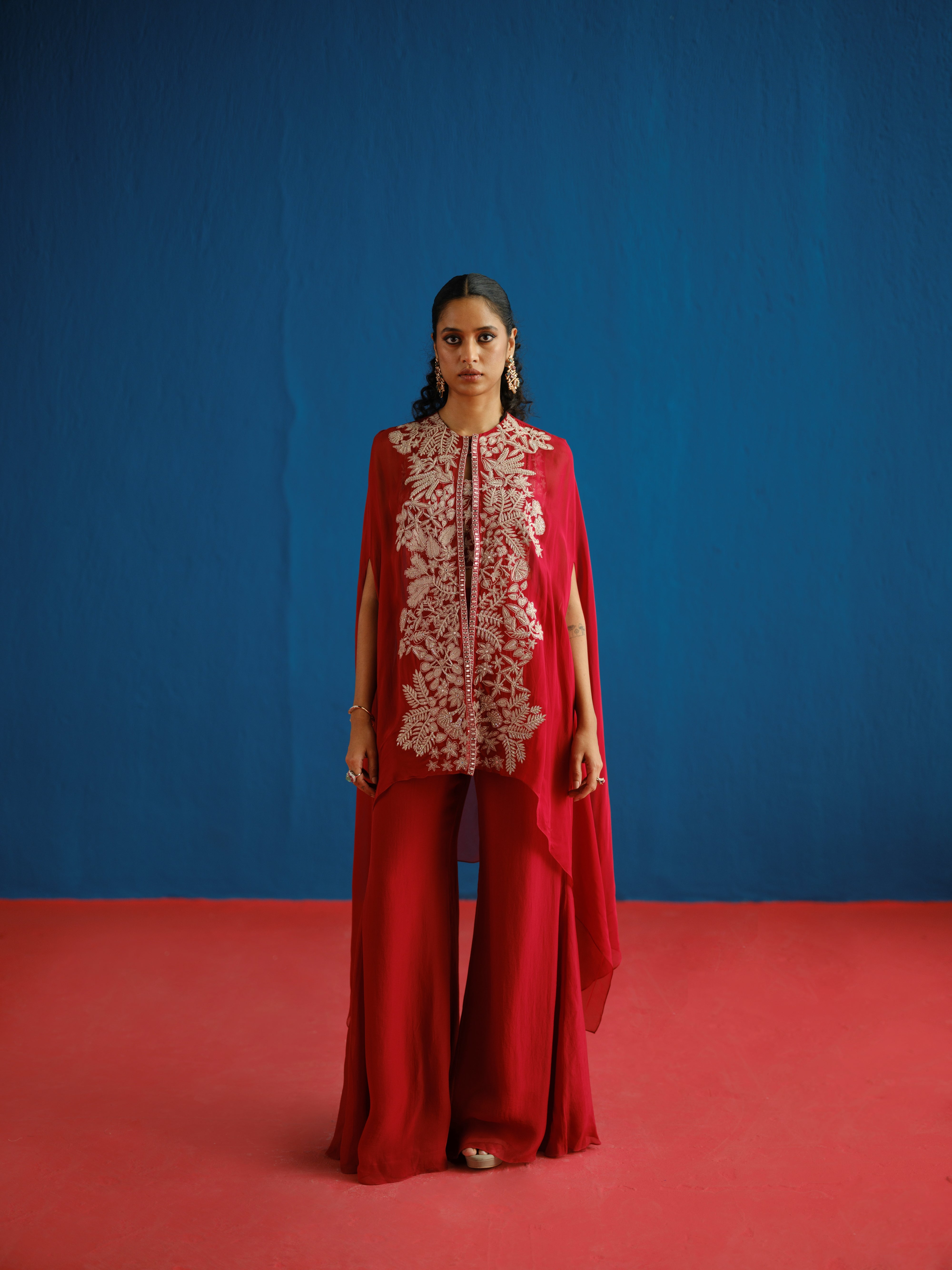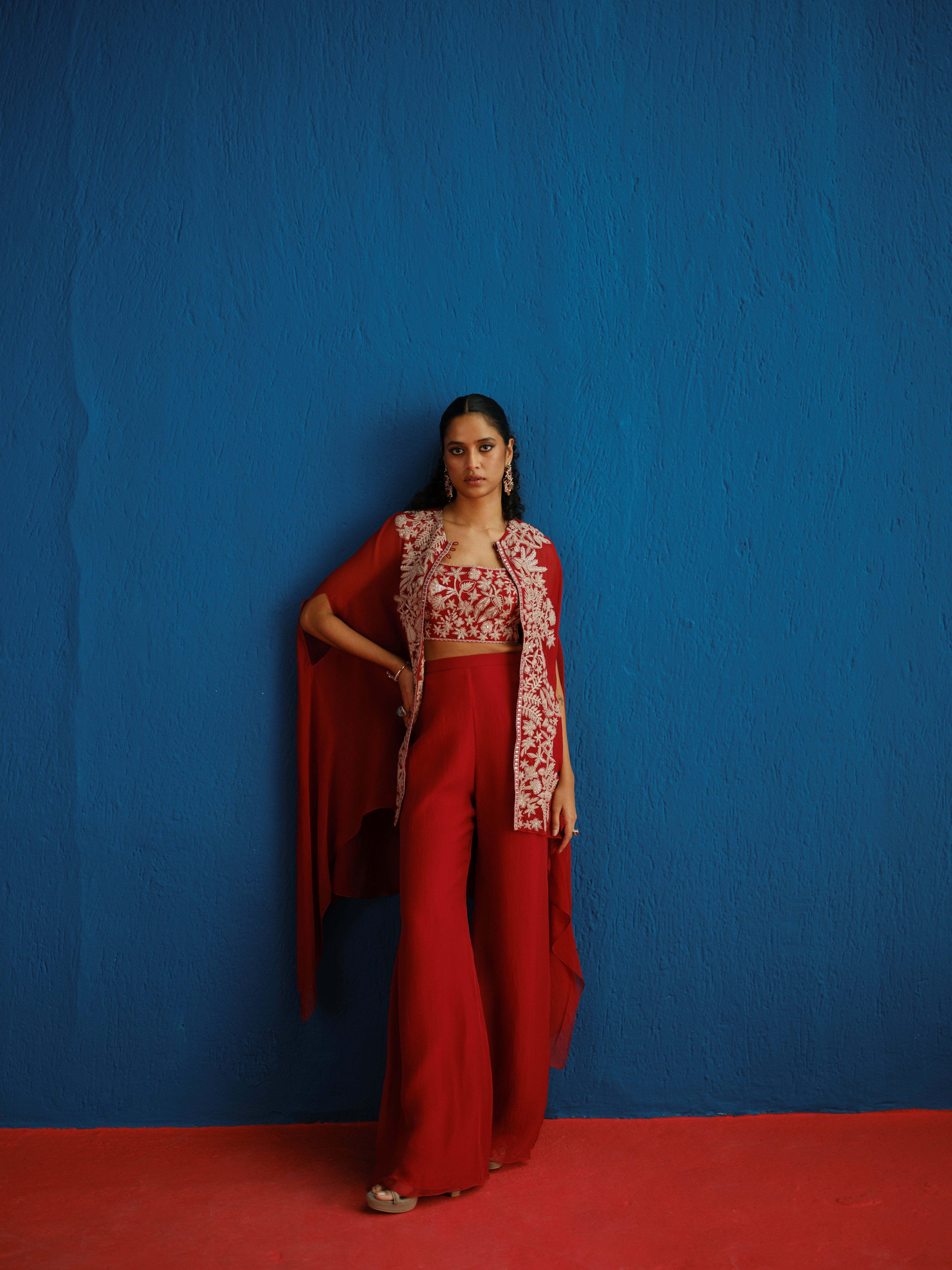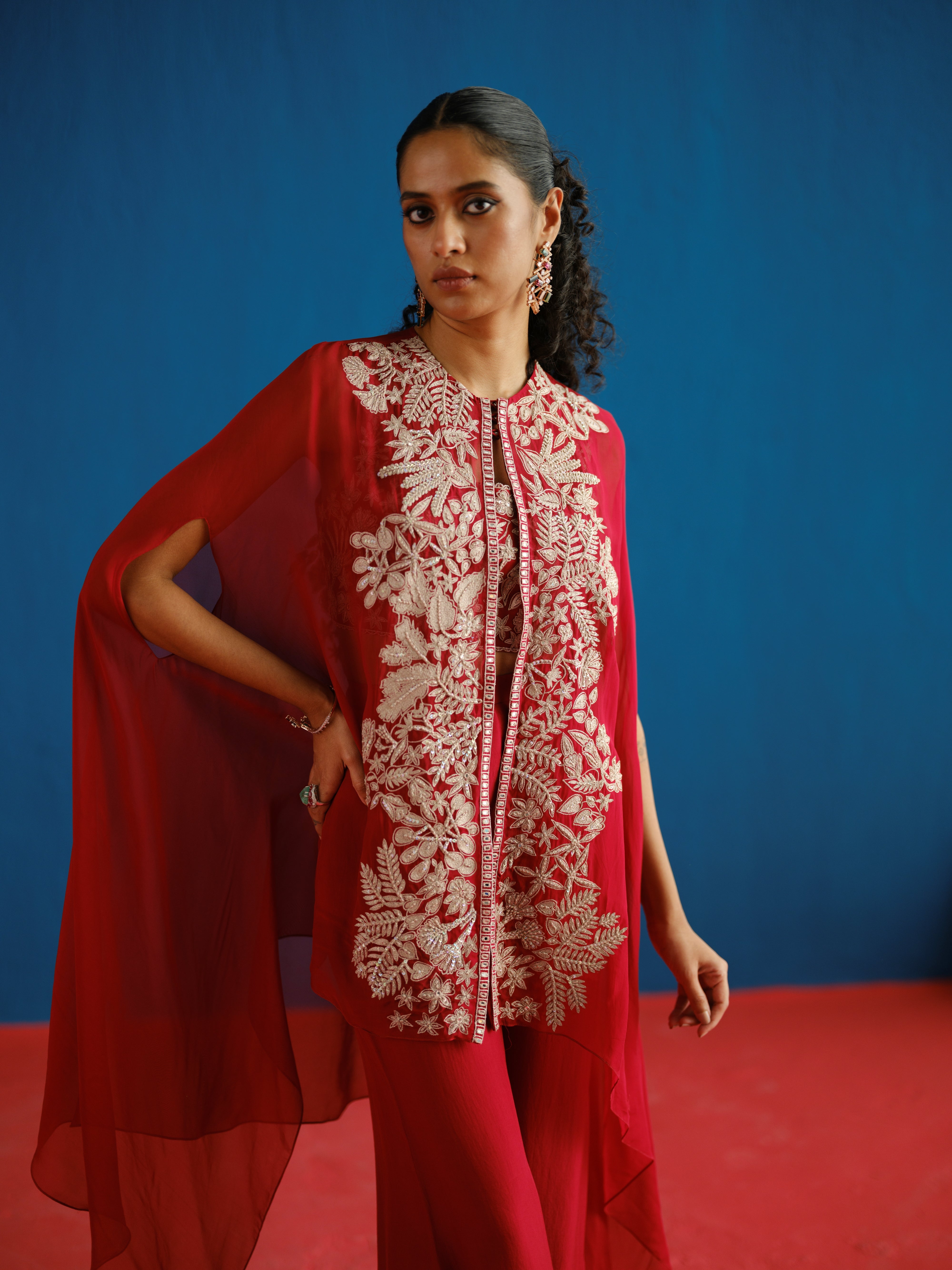 CONTRAST ASSORTED-LEAVES AND WILDFLOWER BORDER CAPE PAIRED WITH A WILDFLOWER BUSTIER AND TAILORED PANTS.