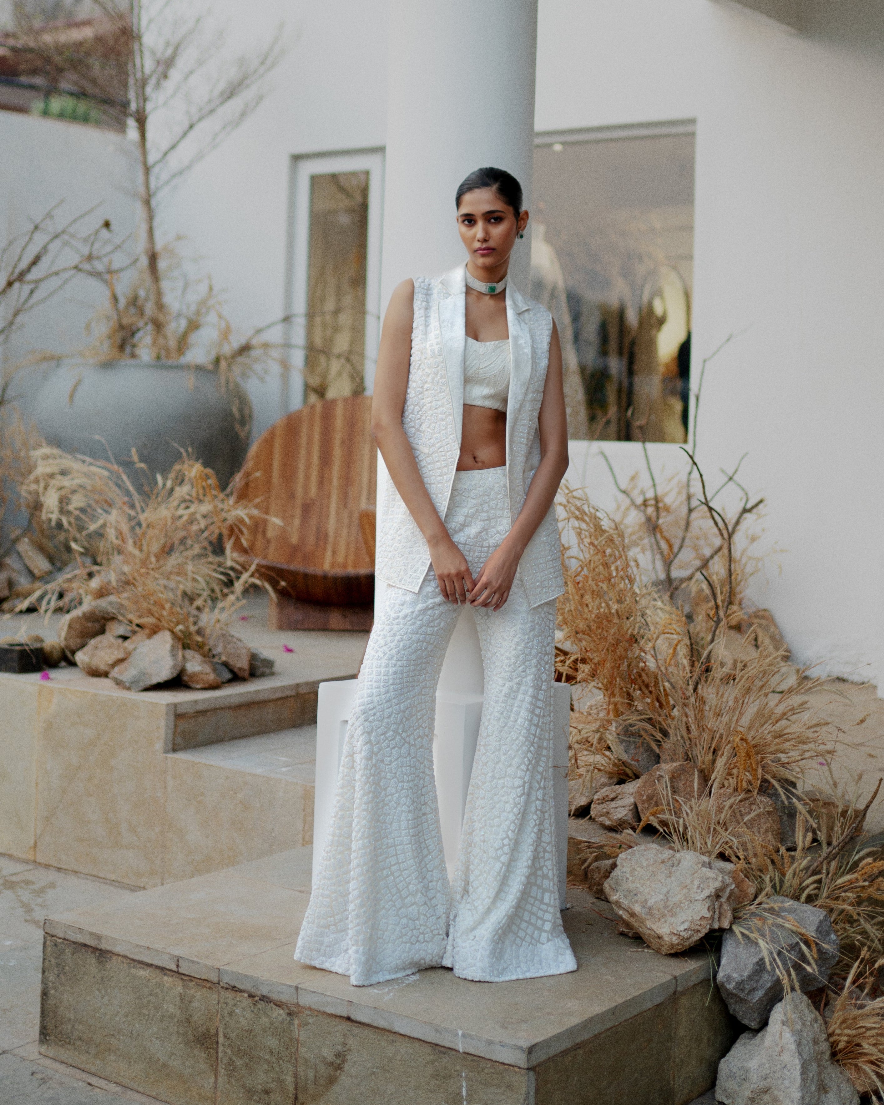 Encrusted hexagon embroidered blazer and pants with abstract lines bustier