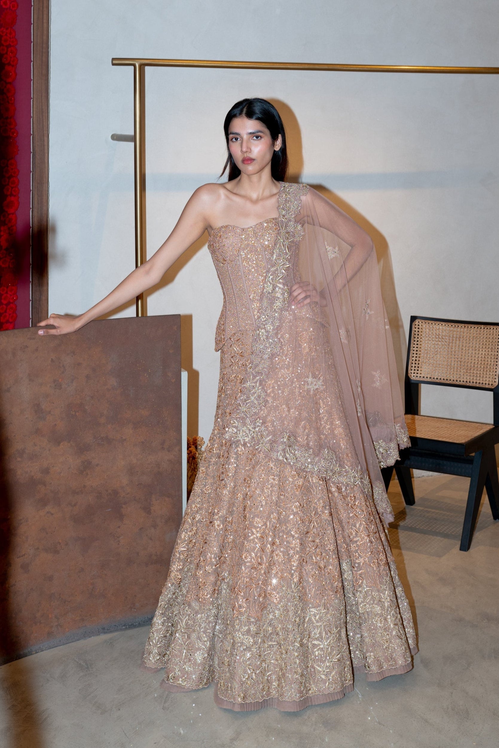 METALLIC WILDFLOWER GRADIENT LEHENGA WITH WILDFLOWER AND GEOMETRIC CORSET AND DUPATTA