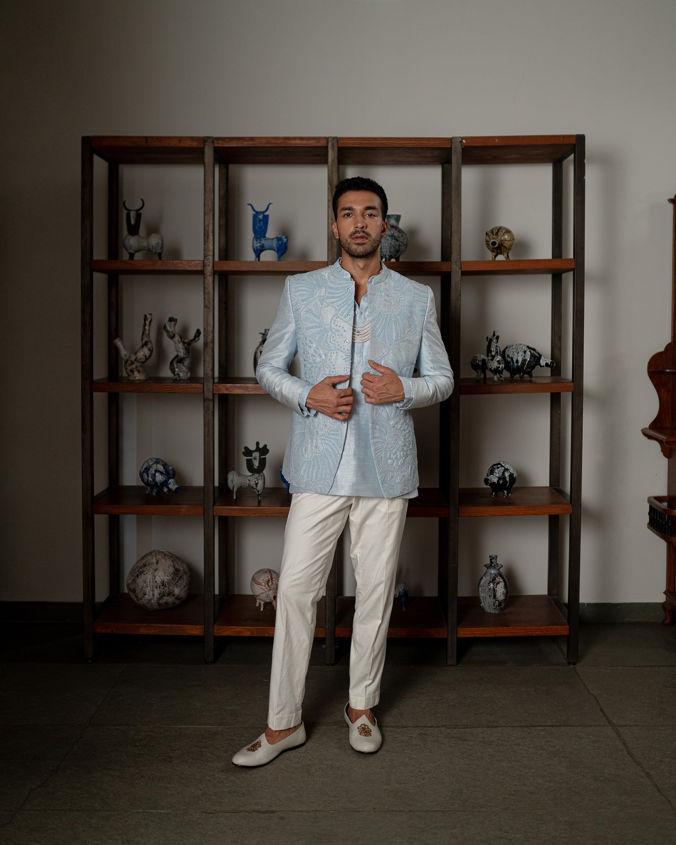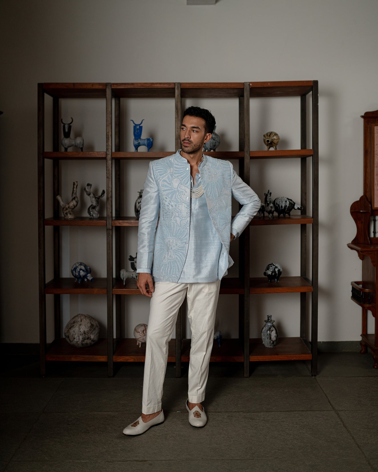 SEA CORAL EMBROIDERED JODHPURI WITH PLAIN KURTA AND PANT