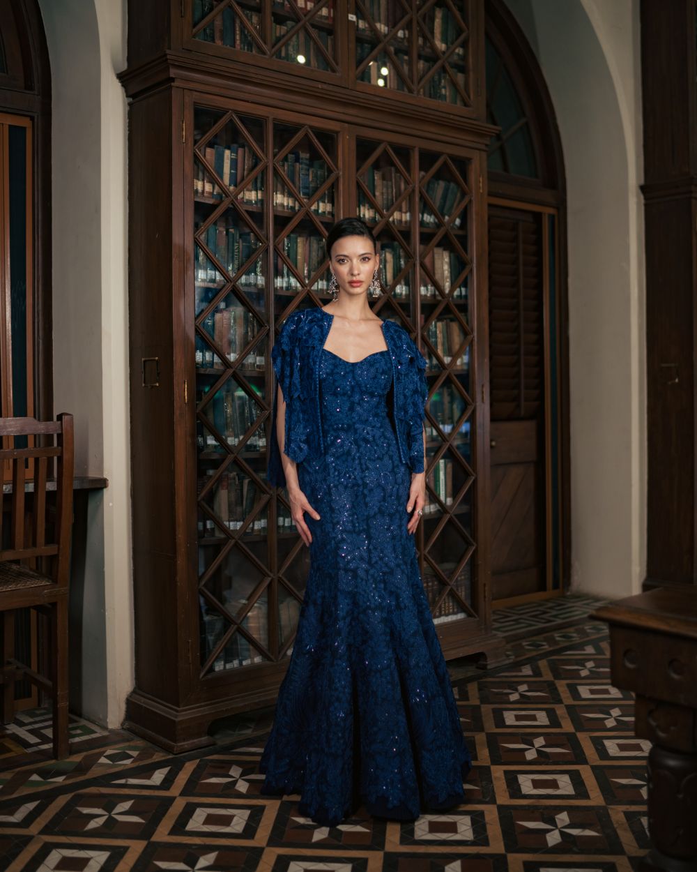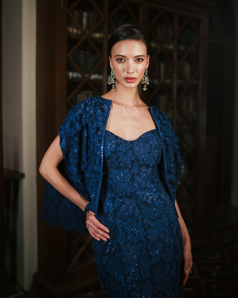 A TONAL GOWN FEATURING INTRICATE LEAF EMBROIDERY, PAIRED WITH A LAYERED CAPE EMBELLISHED IN DELICATE WILDFLOWER MOTIFS