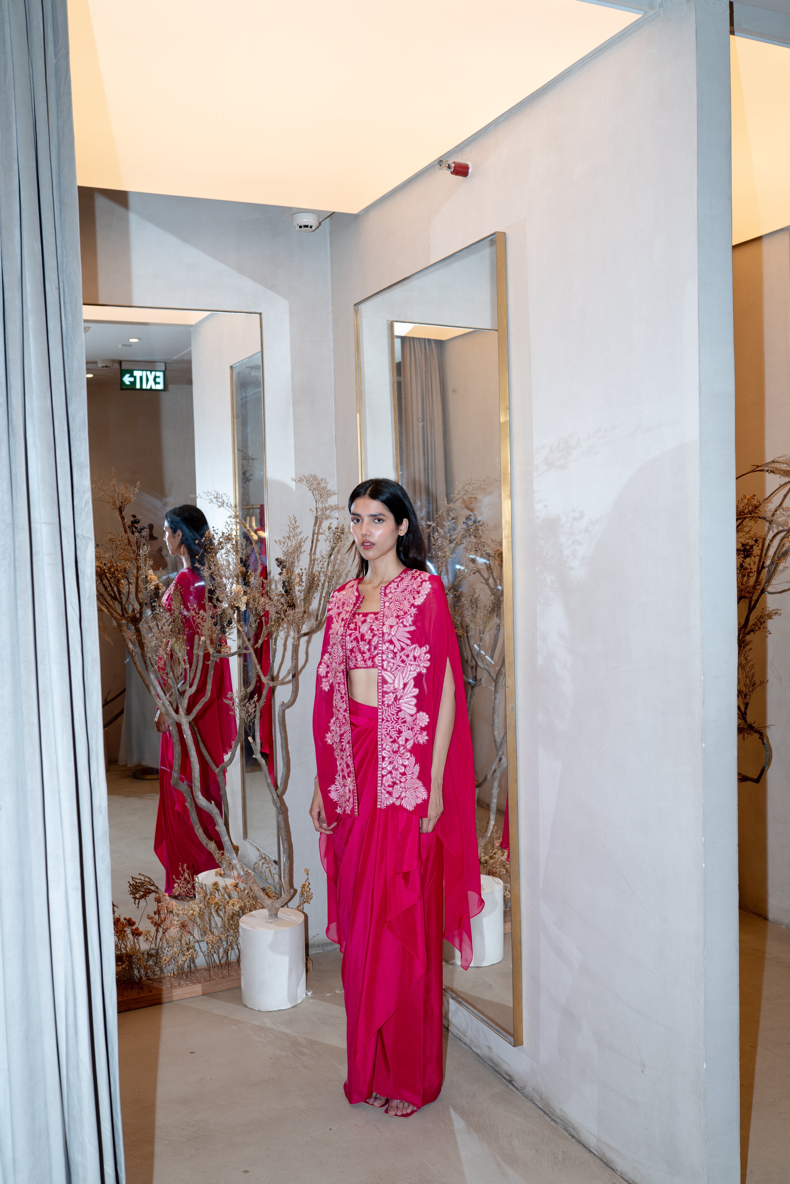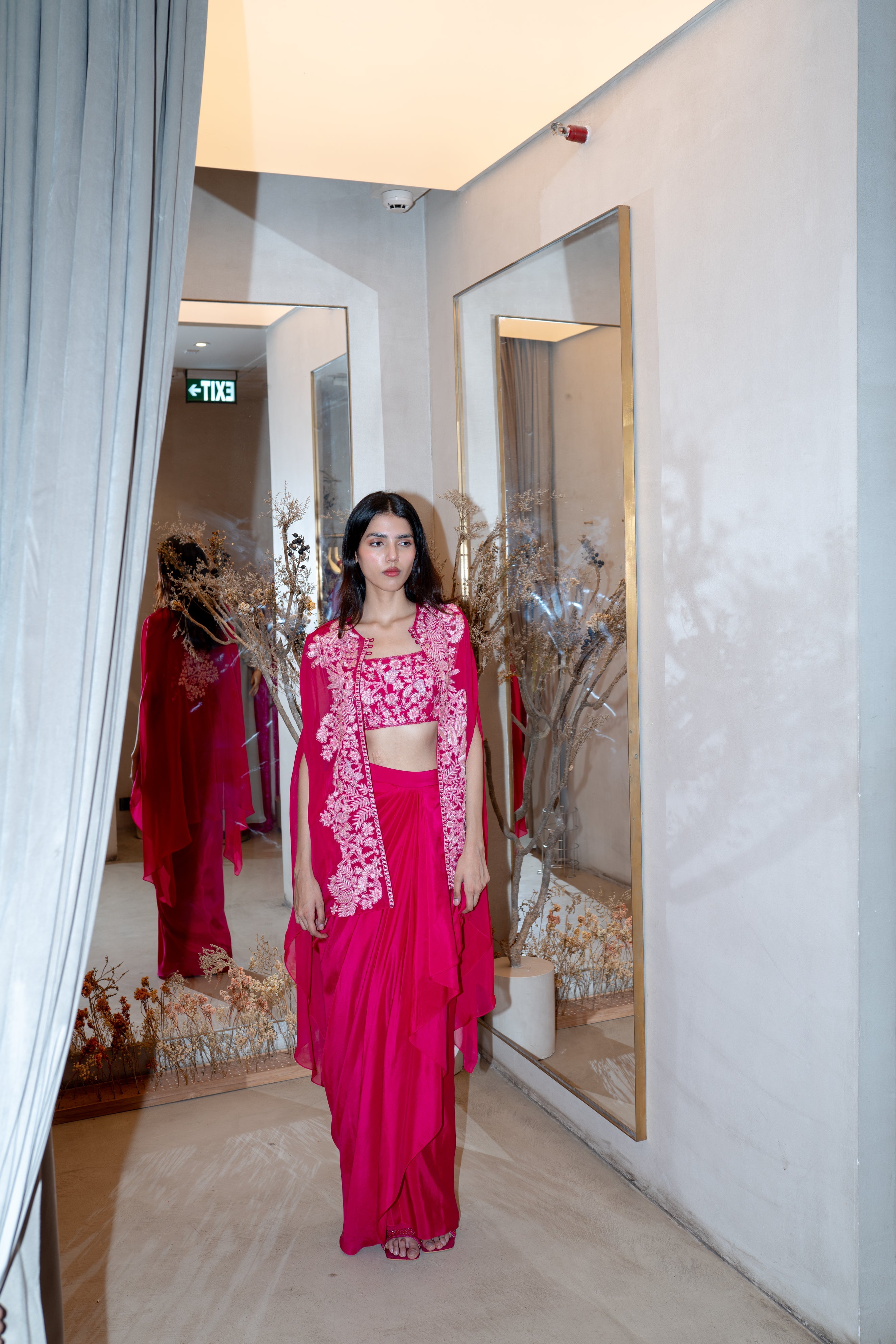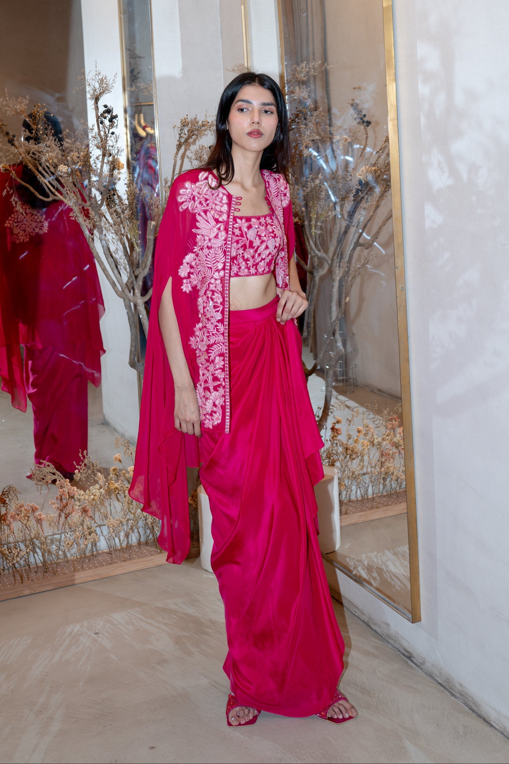 CONTRAST ASSORTED LEAVES AND WILDFLOWER BORDER POSY CAPE WITH WILDFLOWER BUSTIER AND DRAPE SKIRT