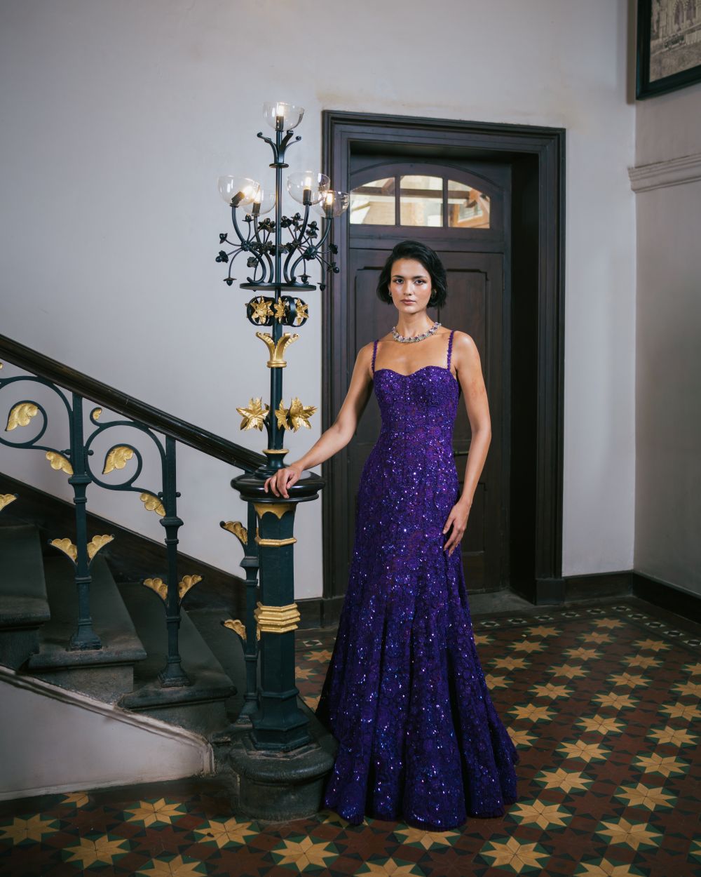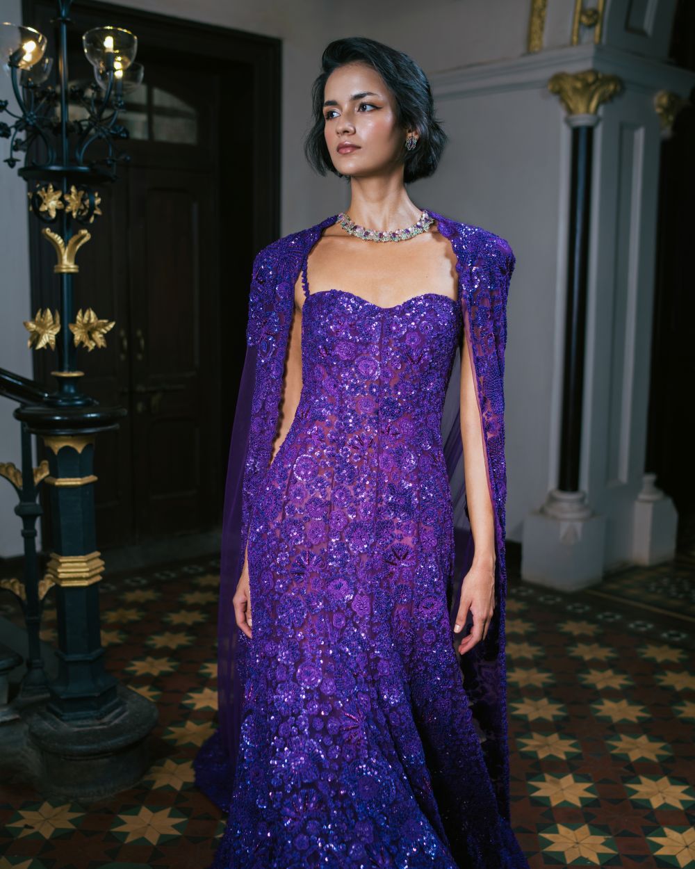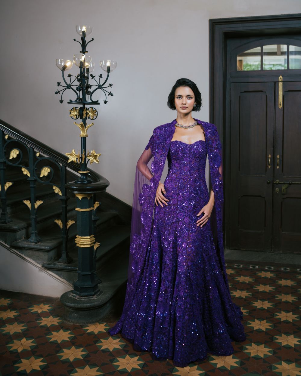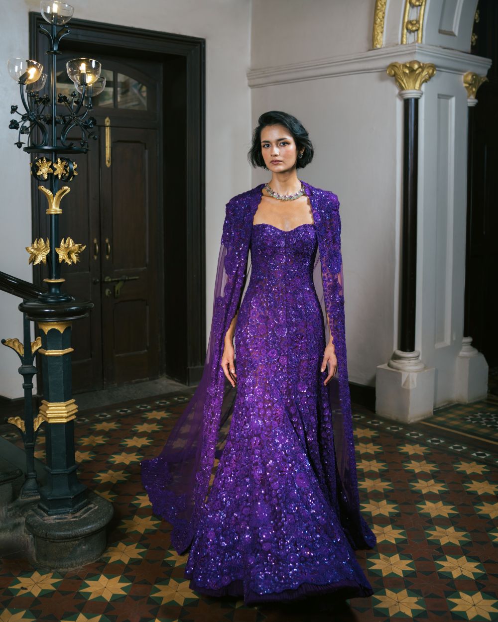 TONAL GOWN EMBROIDERED WITH OUR SIGNATURE PRECIOUS FLOWERS. PAIRED WITH A FLUID, EMBELLISHED CAPE