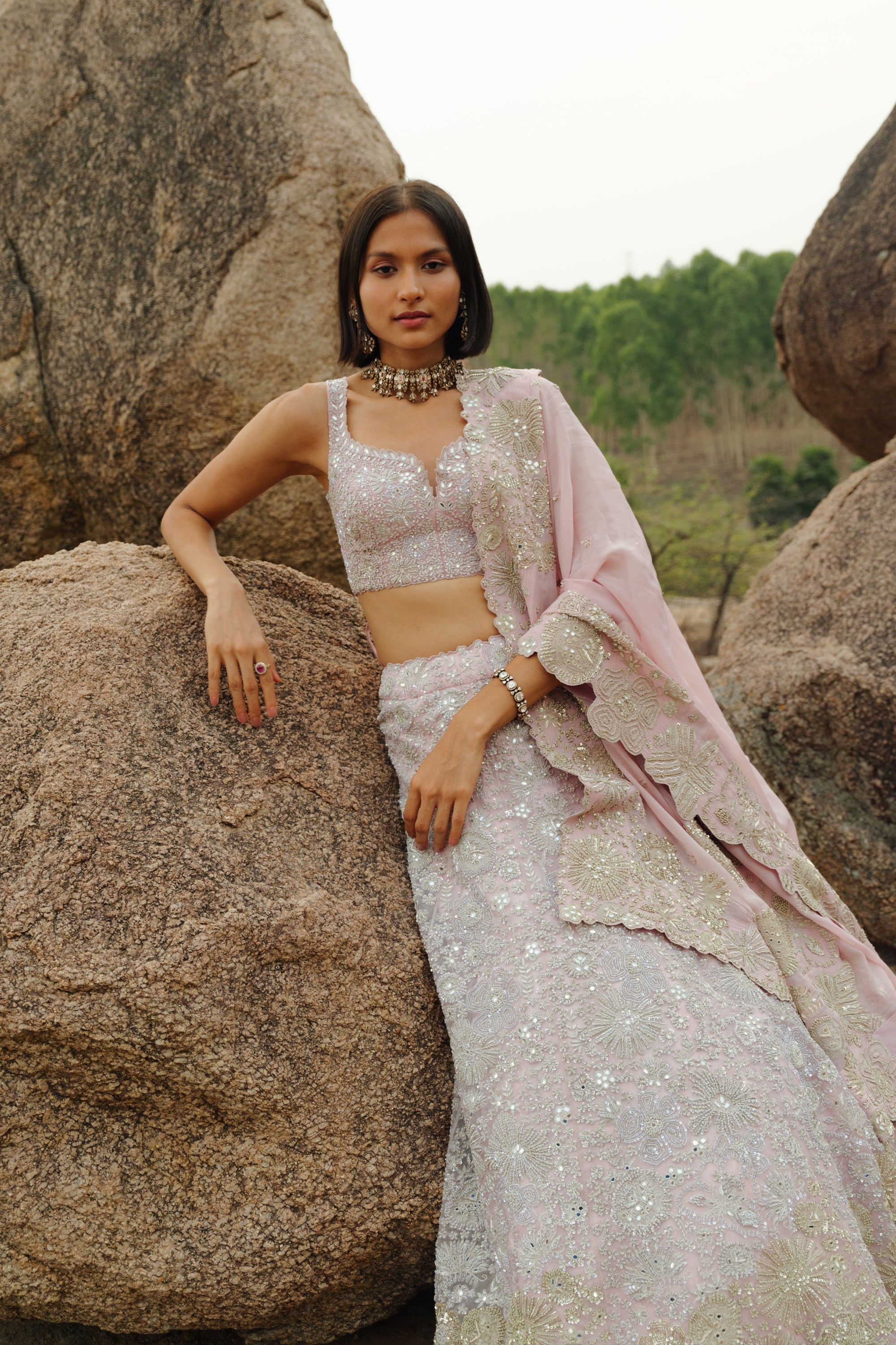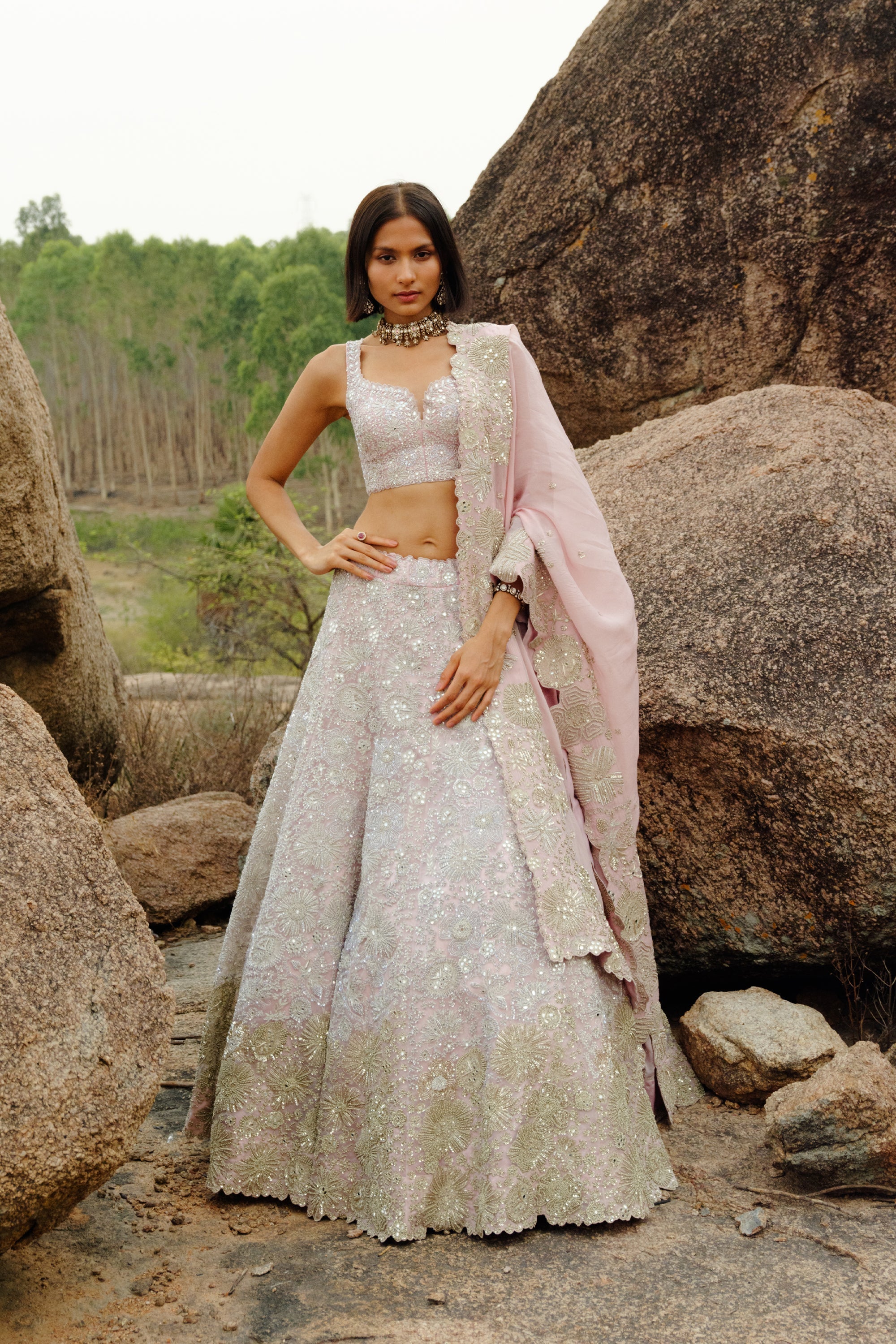 Champagne pink silver and gold gradation embroidered lehenga paired with encrusted blouse and dupatta