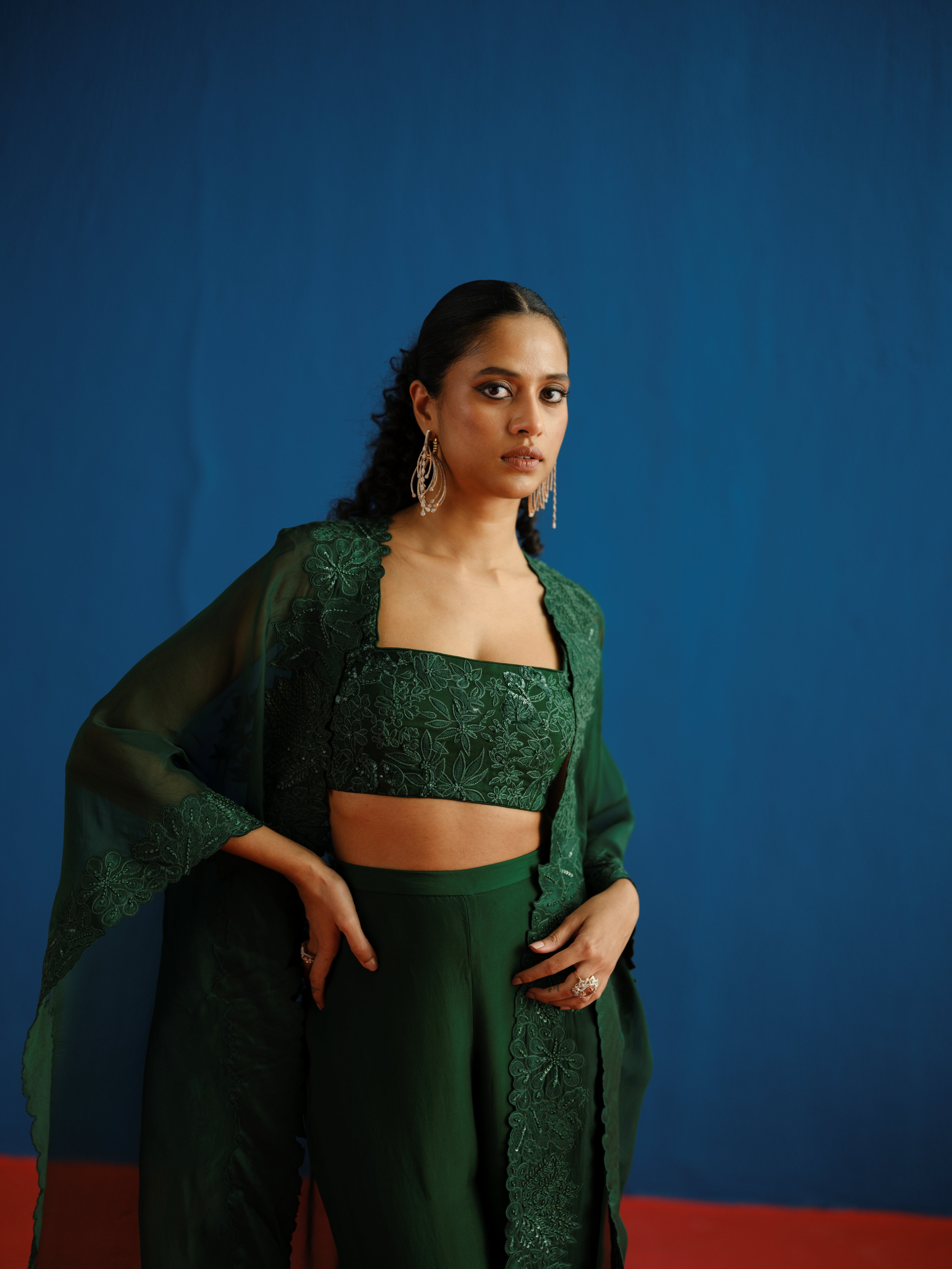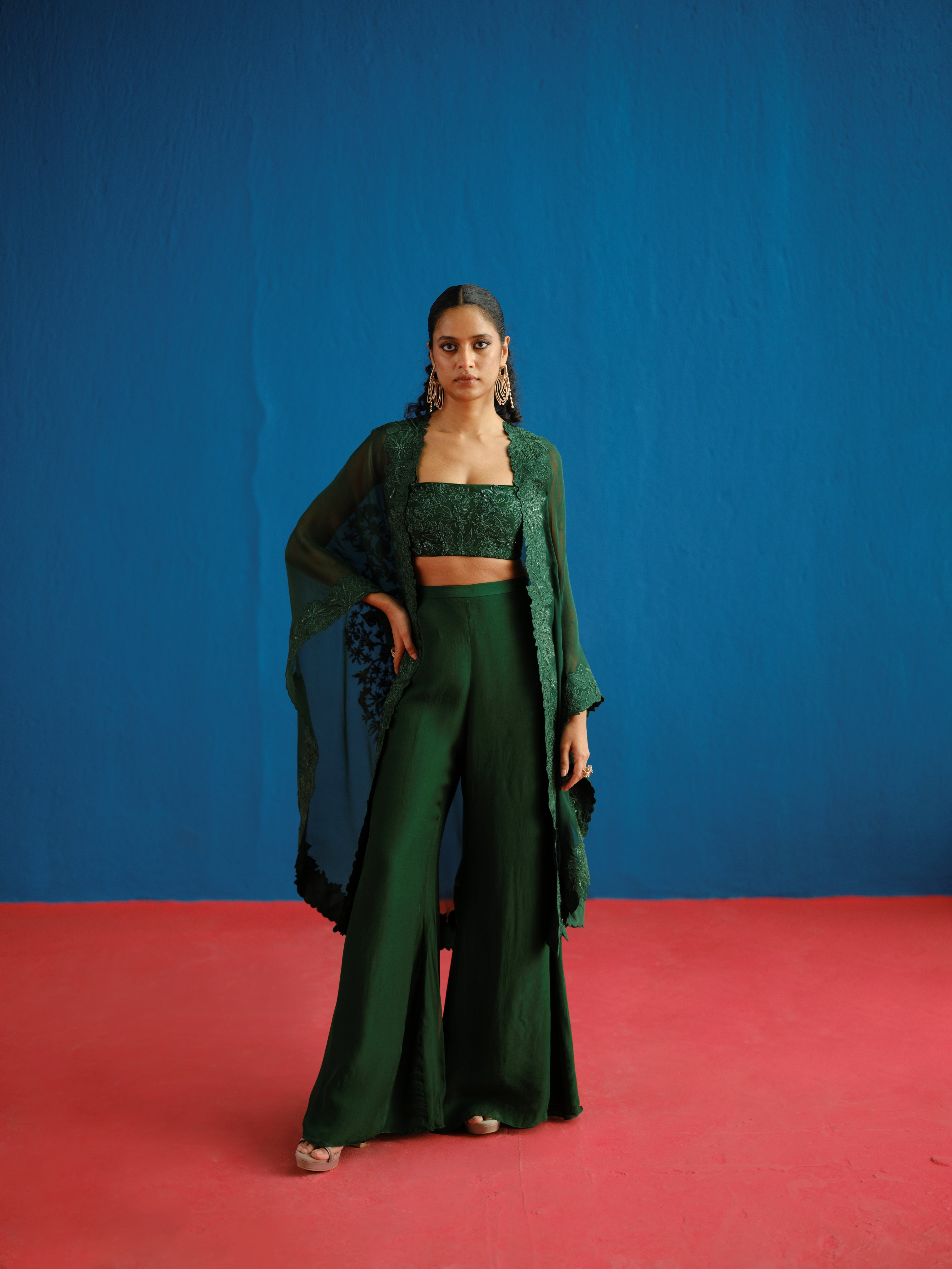 TONAL ASSORTED-LEAVES TRIANGLE CAPE PAIRED WITH A TONAL WILDFLOWER-EMBROIDERED BUSTIER AND PLAIN PANTS.