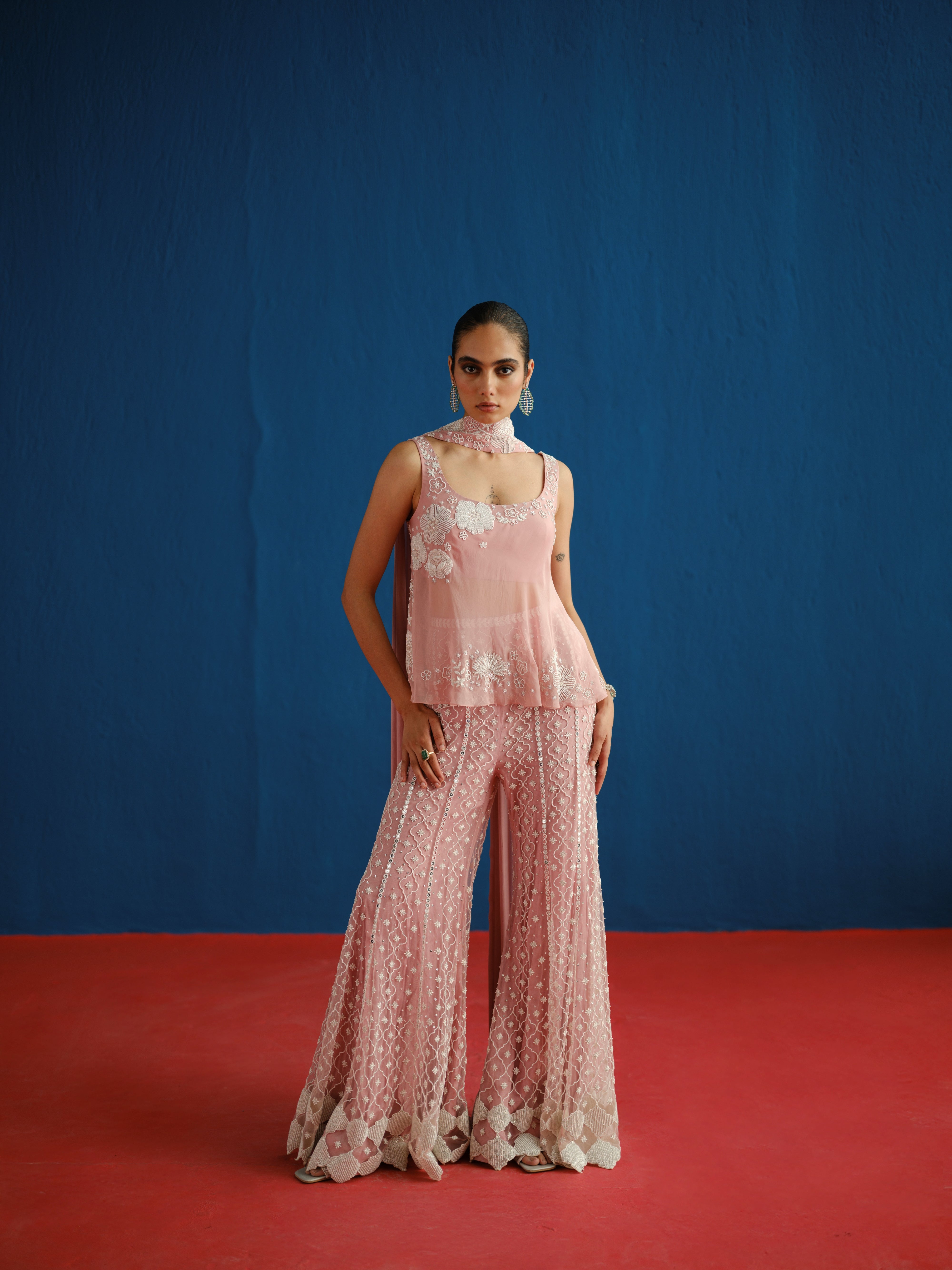 A CONTRAST JAAL SHARARA ADORNED WITH SIGNATURE LOGO EMBROIDERY, STYLED WITH A PRECIOUS-FLOWER SWING TOP AND MATCHING DUPATTA.