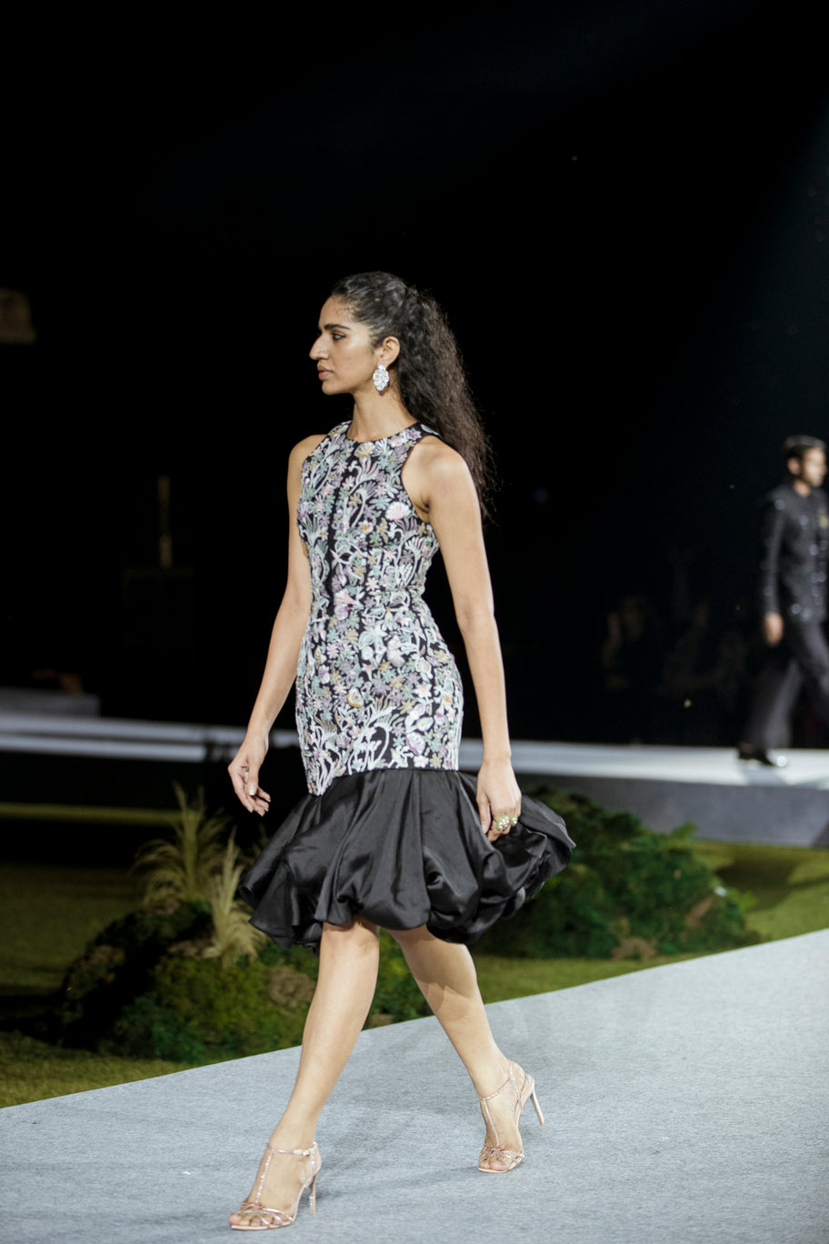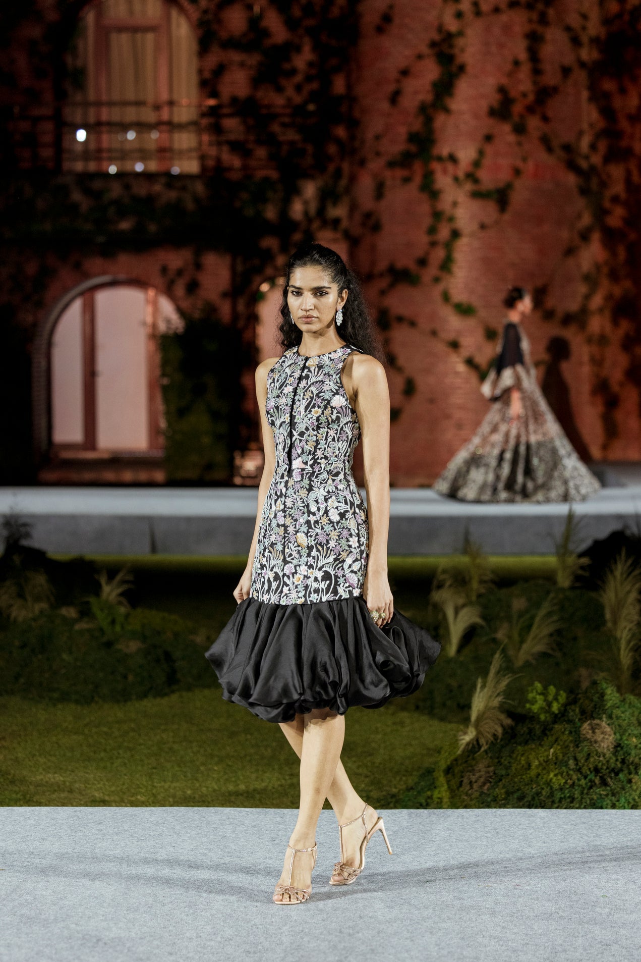 HALTER DRESS WITH MULTI COLOUR WILDFLOWER EMBROIDERY WITH BUBBLE HEM DETAIL.