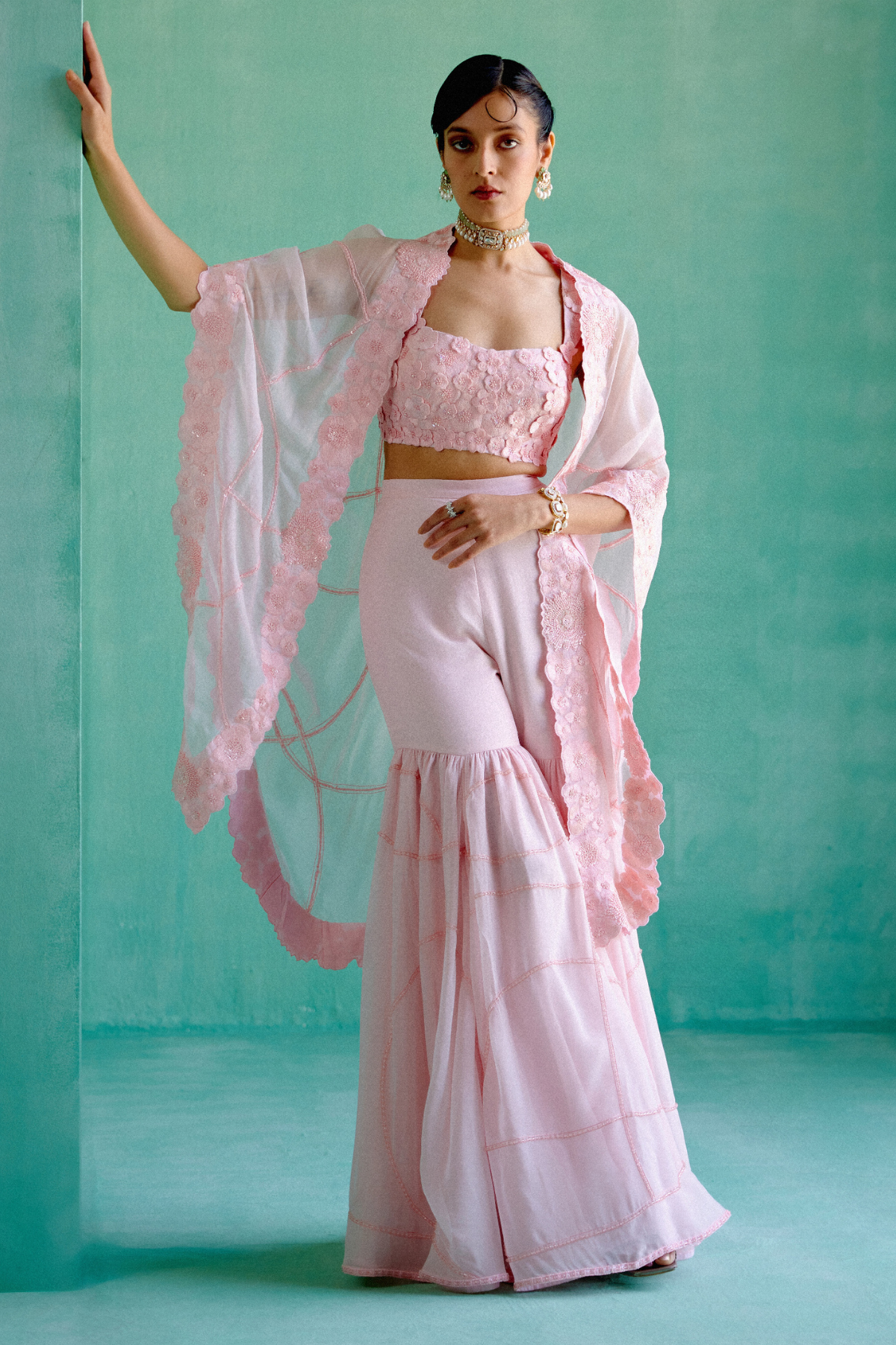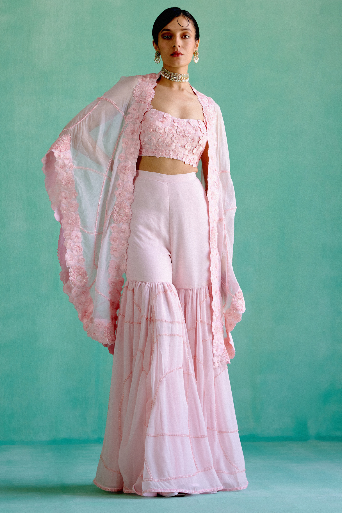 Flared out floral bunches cape paired with embroidered bustier and plain pants