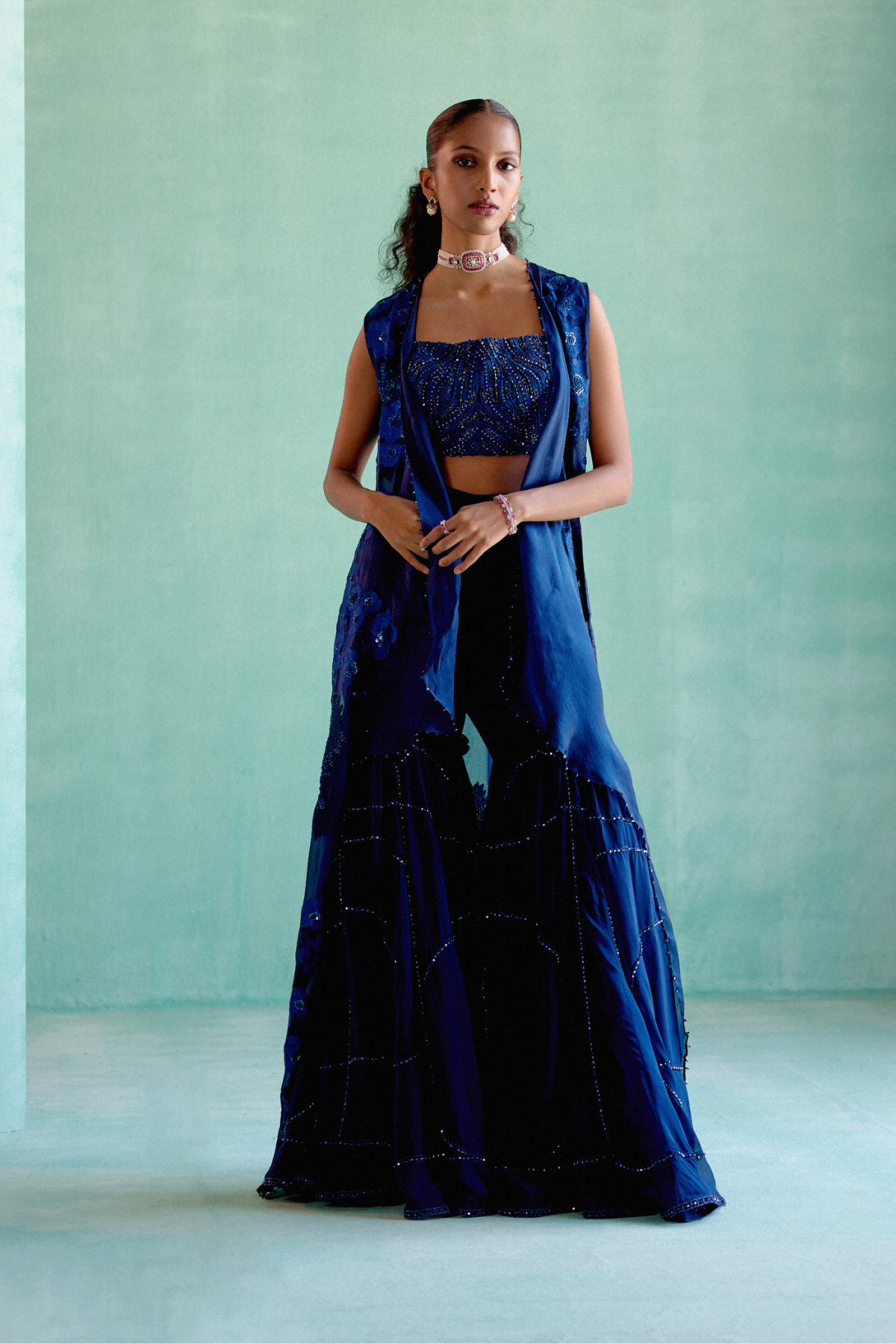 Floral bunches cape with 3D bustier and artdeco embroidered Sharara pants