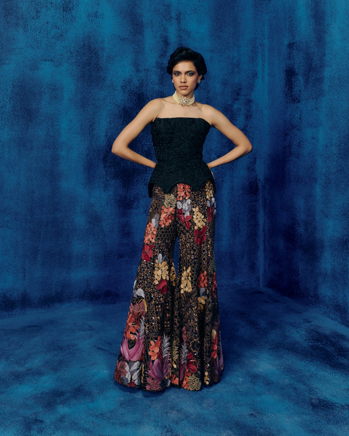 SMOCKING CORSET WITH GEOMETRIC EMBROIDERY AND MULTICOLOUR LEAVES PLACEMENT PANTS